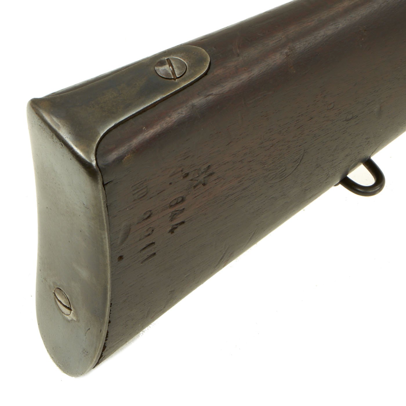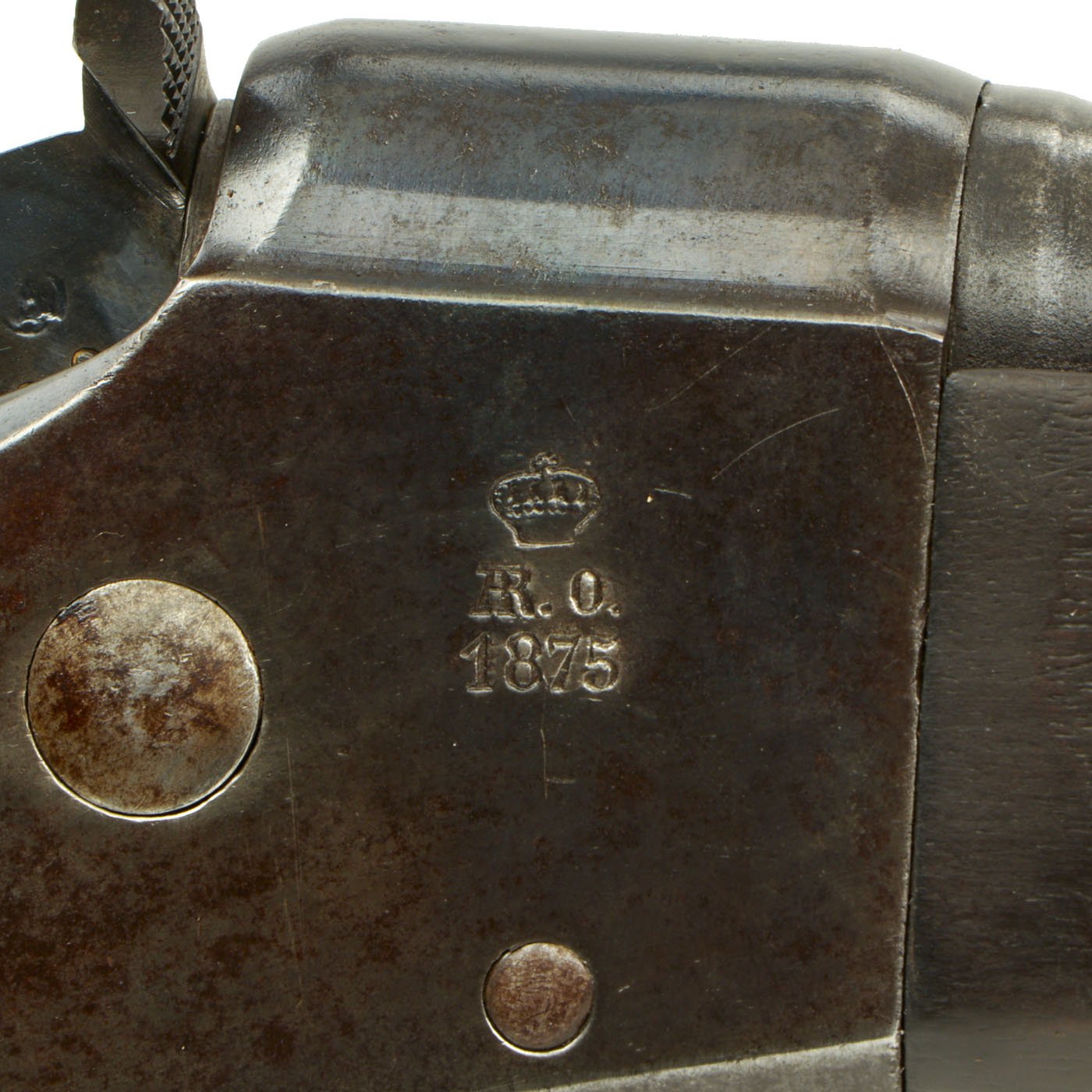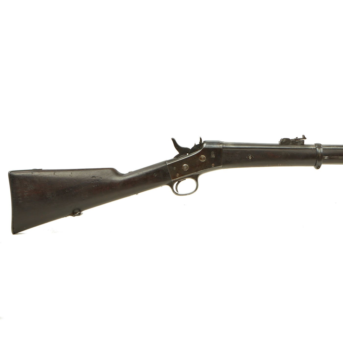 The three band Full Length rifle we offer here is a classic Spanish Oviedo Arsenal produced example, clearly stamped with CROWN / AR. O. / 1875 on right side of action. This is the Royal Cypher of Alfonso XII of Spain, who reigned from 1874 to 1885. It has the characteristic fore-stock bolt, as well as the firing pin retractor, not seen in the Remington-produced guns. It also has serial number No. 640 stamped into the wood butt, over MD 2211. It even still has a stamped cartouche reading Crown / OVIEDO / 1876, for the Oviedo armory near Madrid where it was produced. Overall length is 52 inches, with a 37 inch barrel. The side of the barrel at the woodline is marked “R” for Reformado.