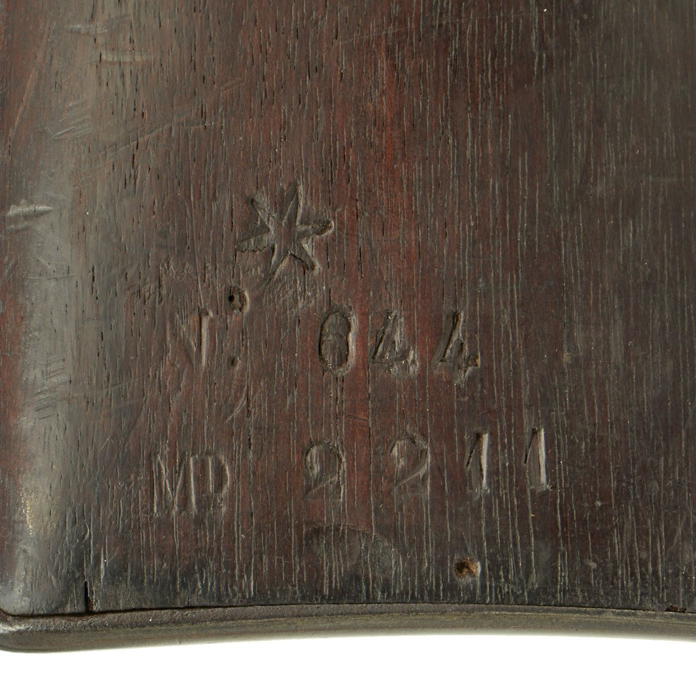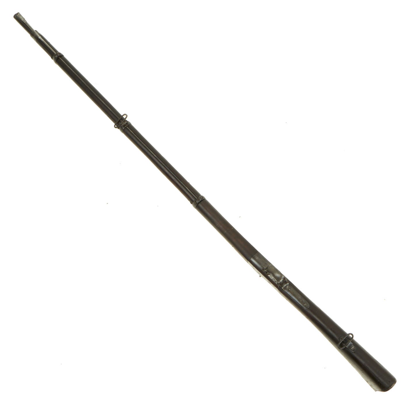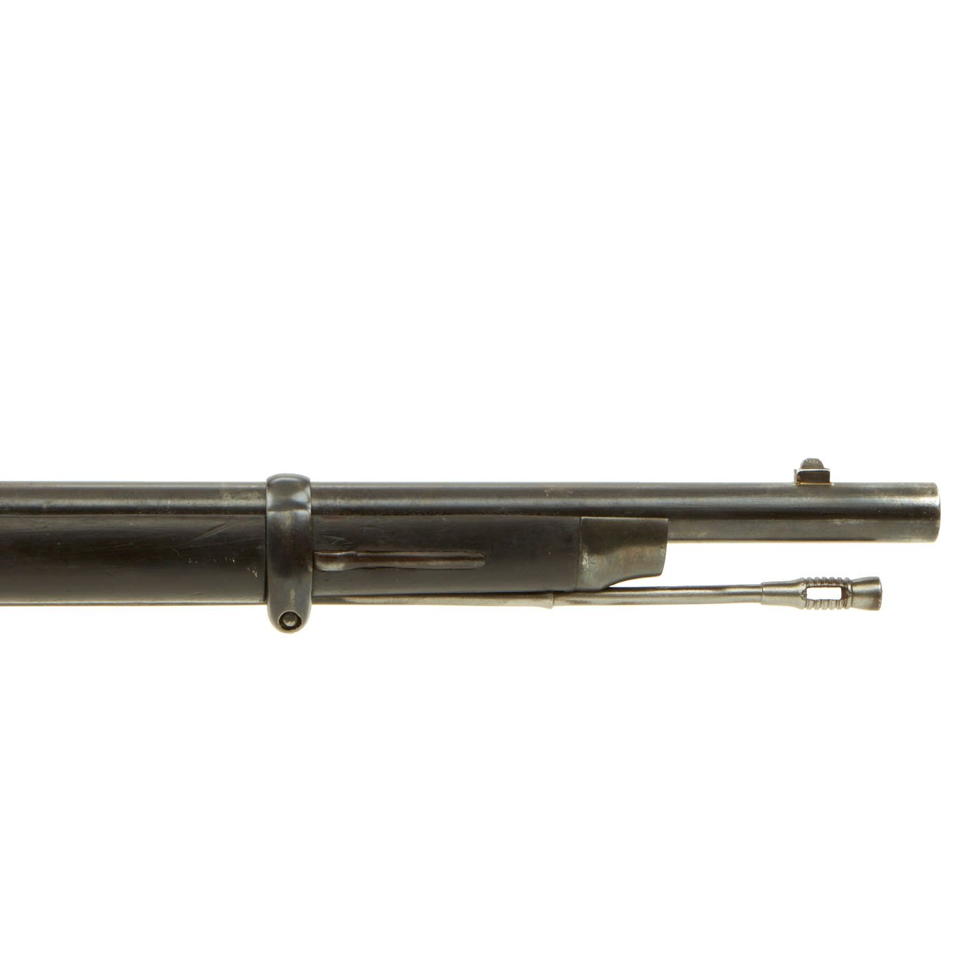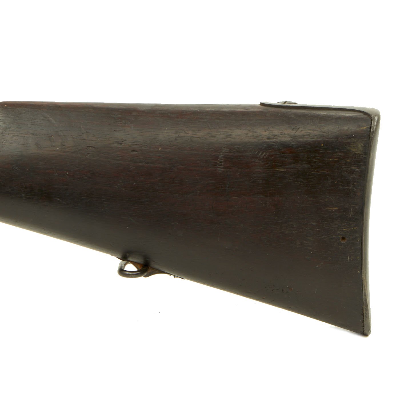 The three band Full Length rifle we offer here is a classic Spanish Oviedo Arsenal produced example, clearly stamped with CROWN / AR. O. / 1875 on right side of action. This is the Royal Cypher of Alfonso XII of Spain, who reigned from 1874 to 1885. It has the characteristic fore-stock bolt, as well as the firing pin retractor, not seen in the Remington-produced guns. It also has serial number No. 640 stamped into the wood butt, over MD 2211. It even still has a stamped cartouche reading Crown / OVIEDO / 1876, for the Oviedo armory near Madrid where it was produced. Overall length is 52 inches, with a 37 inch barrel. The side of the barrel at the woodline is marked “R” for Reformado.
