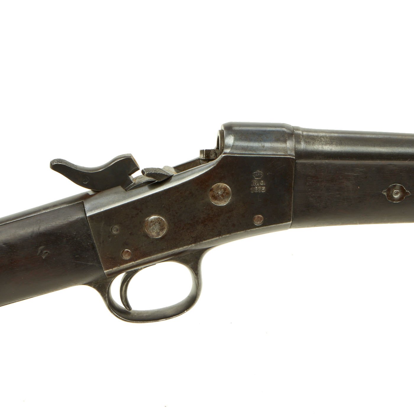 Original Item: Only One Available. The Spanish Oviedo arms factory produced rolling block rifles under a patent agreement with Remington. There are a number of key indicators when identifying these rifles. The receivers are typically stamped on the right side with the Crown over ARO over the date of manufacture. The fore-end is also attached with a cross bolt just forward of the receiver. The rifles were chambered .43 Spanish Reformado, the proprietary national cartridge for the kingdom of Spain. The breech block, hammer, and trigger guard are about .040 inch wider than the Remington counterparts and do not interchange. Also note the addition of a firing pin retractor in the top of the breech block. This is similar to the concept used in the Danish Rifles. The straight bar extractor usually has two down legs and the breech blocks show a double notch cut in the left side. The receivers will make a nice custom rifle keeping in mind the original cartridge chamber pressures. The Oviedo receivers & barrels are threaded with a V thread as opposed to the square thread of the Remington. Spain adopted the single shot Rifle in .43 caliber Spanish, known in Europe as 11.15 mm X 58 mm R9.