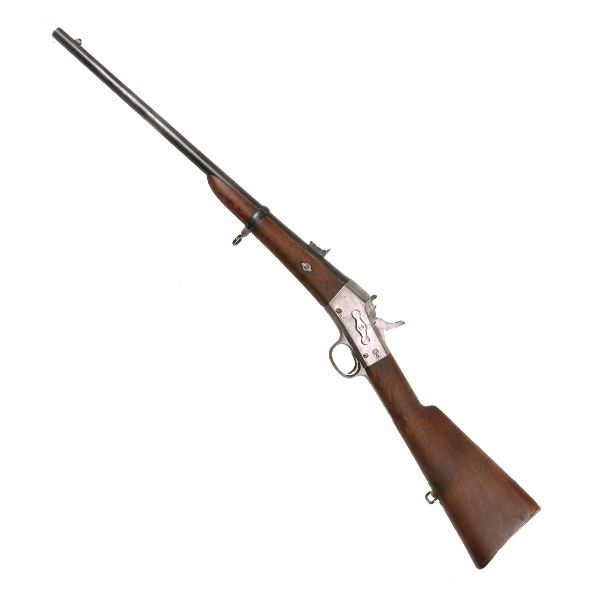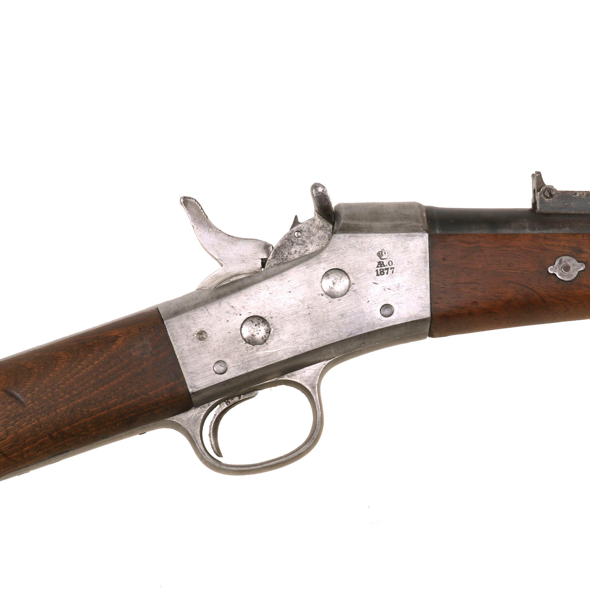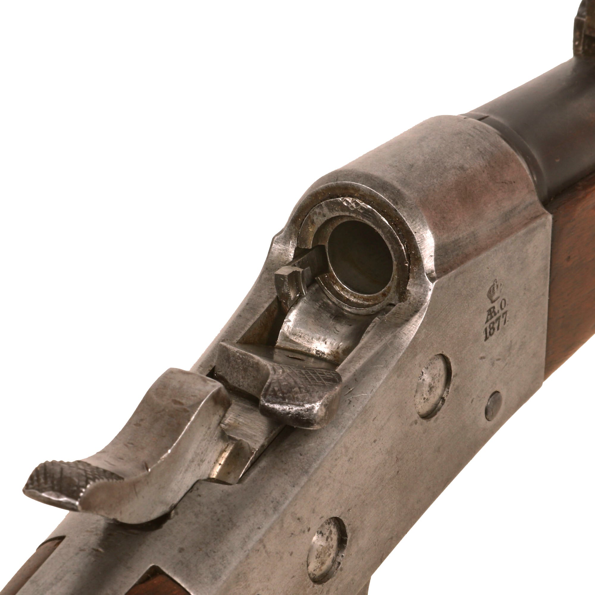 The cavalry carbine example we offer here is a classic Spanish Oviedo Arsenal produced example, stamped with CROWN / AR. O. / 1877 on right side of action, which is slightly worn. This is the Royal Cypher of Alfonso XII of Spain, who reigned from 1874 to 1885. It has the characteristic fore-stock bolt, as well as the firing pin retractor, not seen in the Remington-produced guns. The rolling block also retains the early concave top, which was removed from other Remington rolling block designs, as well as the sliding ejector on the left side.
