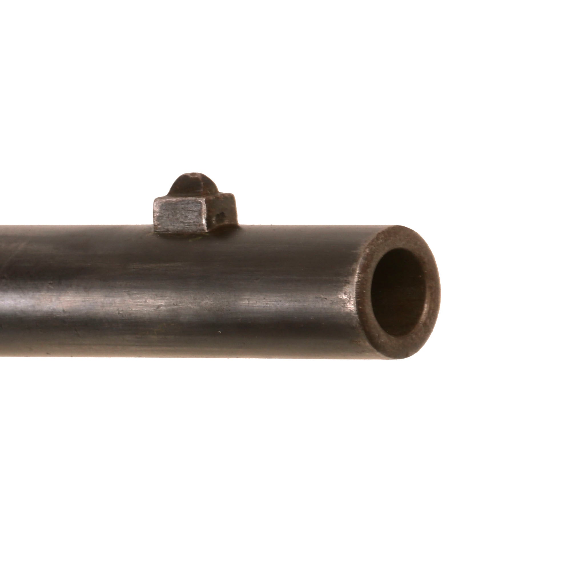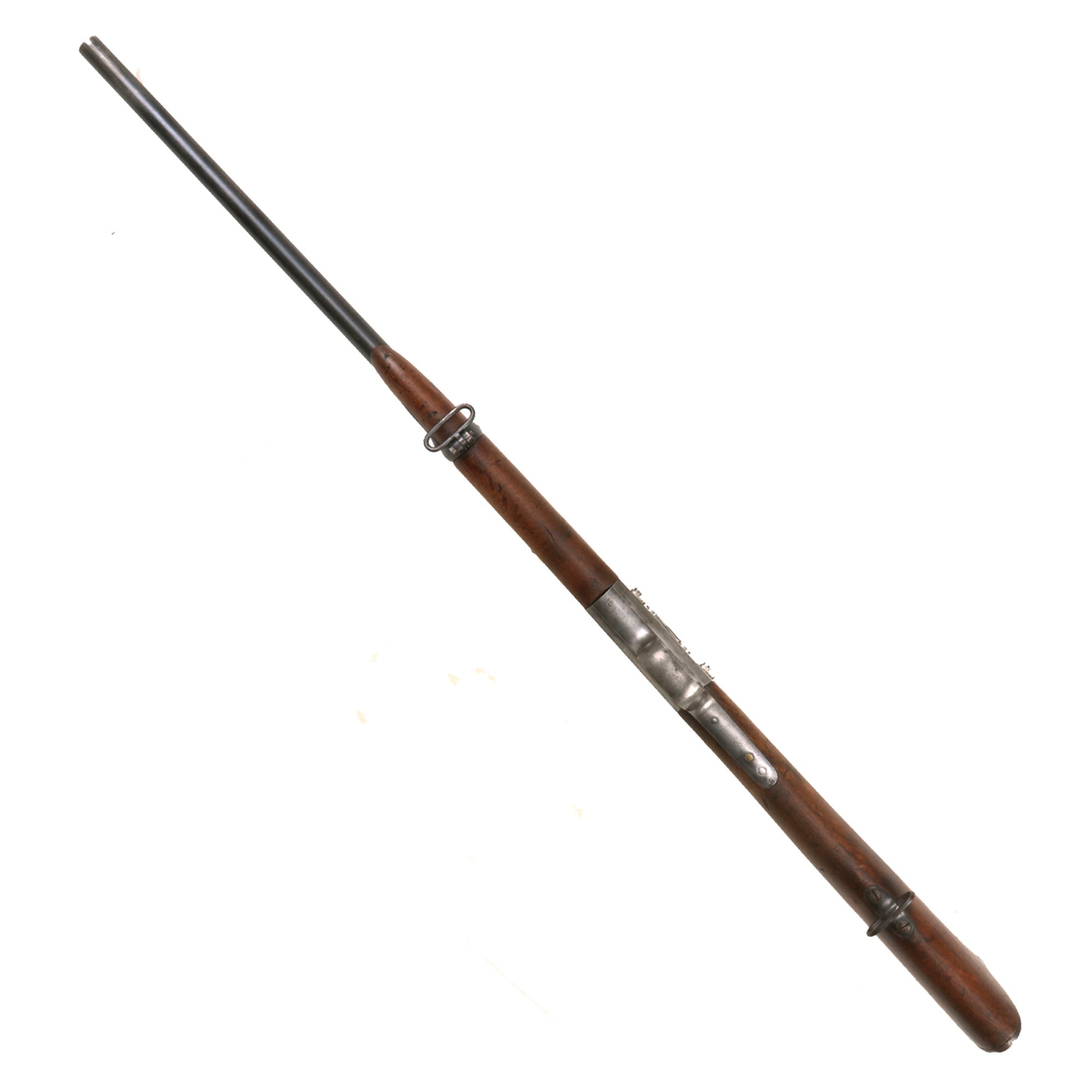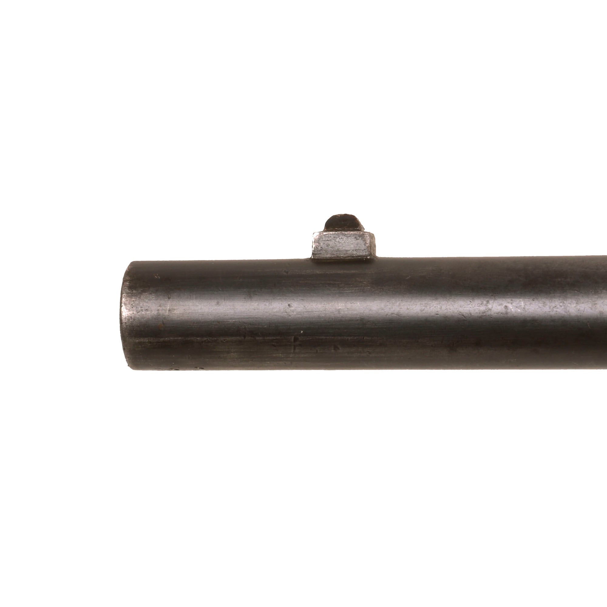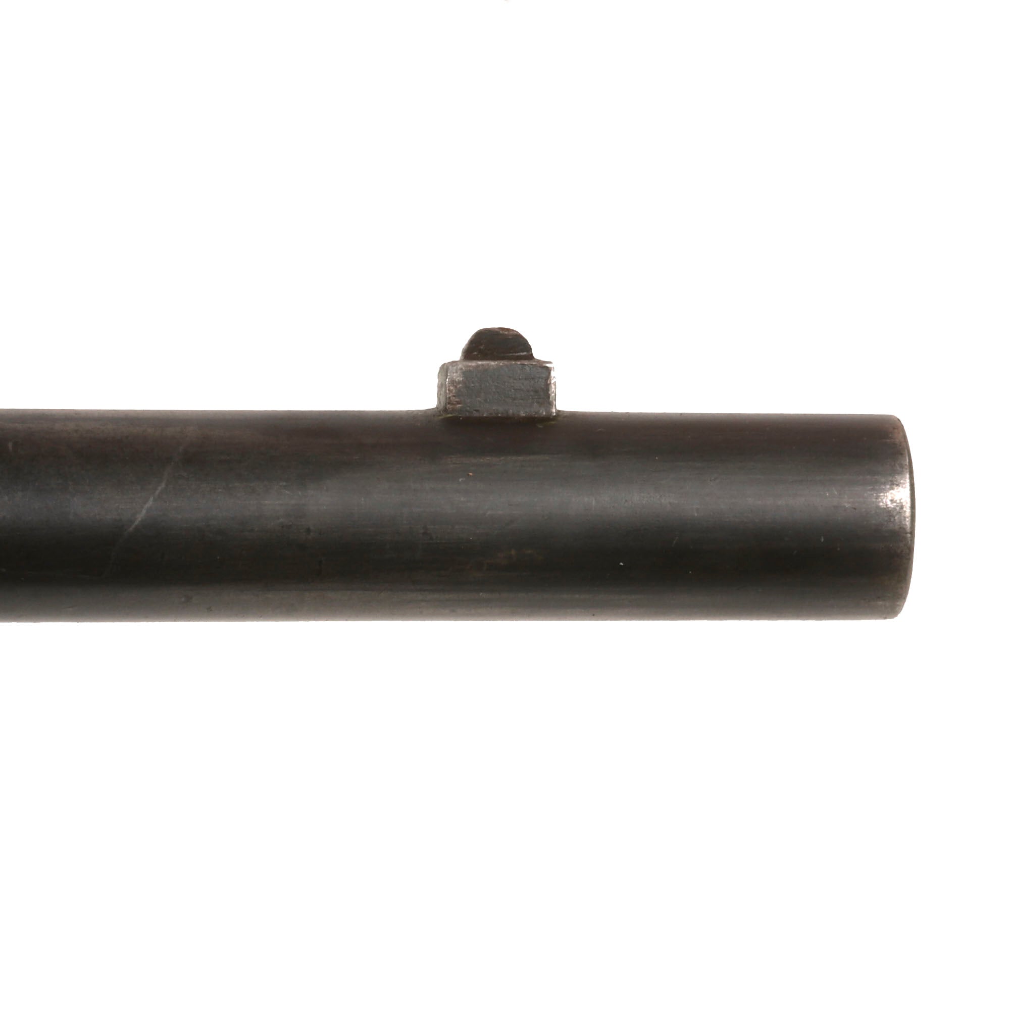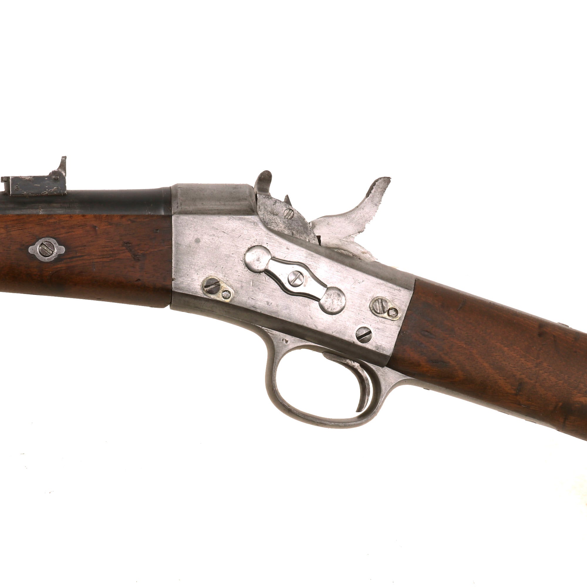 The Remington patent licensing markings on the top action strap have long since worn away but the rifle is in very good shape, looking to have been cleaned and reconditioned at arsenal long ago, which unfortunately has made some of the markings faint. The saddle ring bar was also removed at some point, and instead there are some eyelet washers installed, possibly for some other type of attachment system. The rear sight is the correct flip type, and is fully intact and functional. The breech opens correctly with the ejector projecting, with a functional firing pin retractor, and the hammer dry fires correctly, though the trigger pull is a bit stiff. The bore is in excellent condition, showing a bright finish with crisp lands and grooves. There is only light wear, and no real signs of fouling oxidation, making this a truly exceptional example.