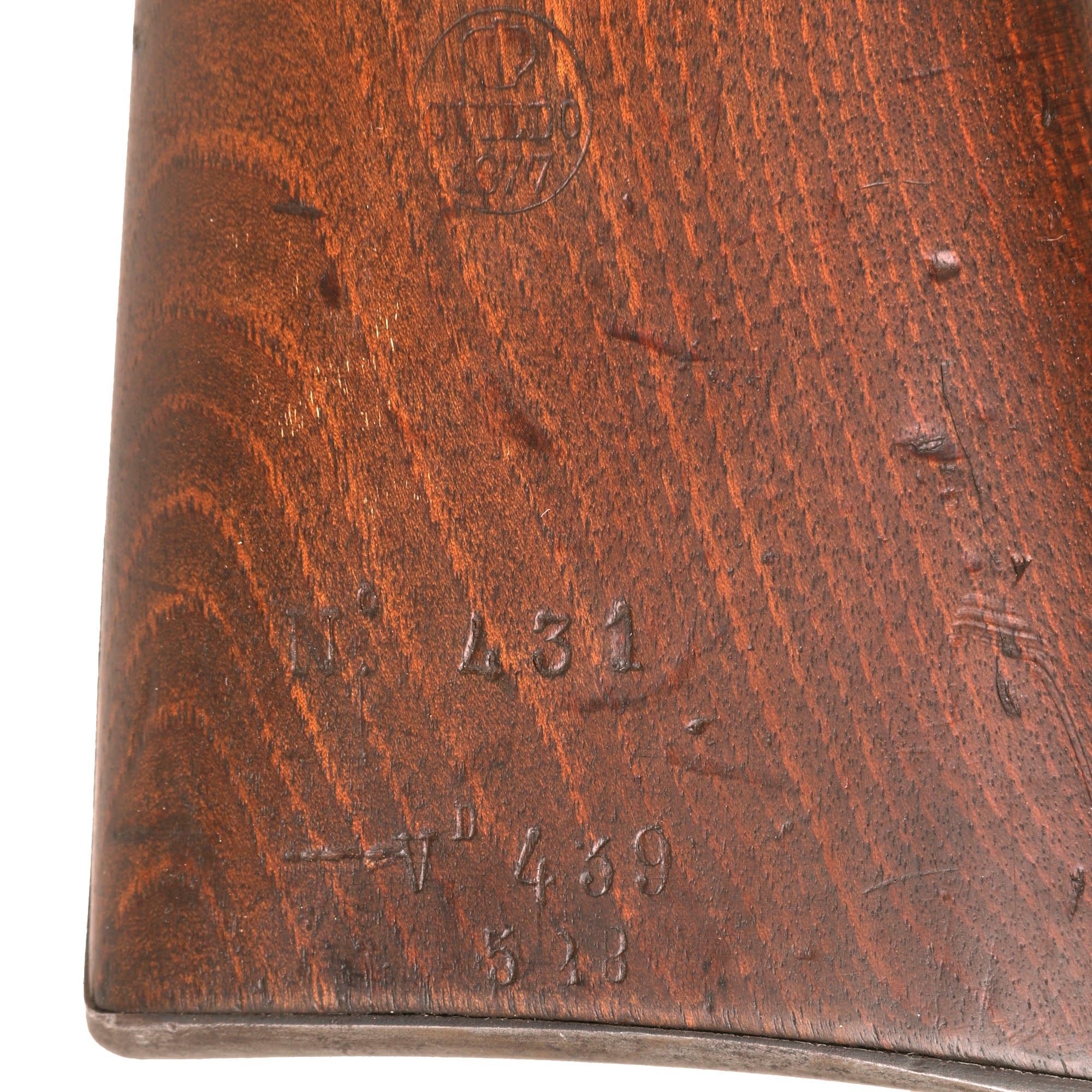 There are some serial numbers stamped into the right side of the butt stock, which look to be 431, 439, and 528, though we do not know if either of these are the serial number. It even still has the original stock cartouche, which reads Crown / OVIEDO / 1877, for the Oviedo armory near Madrid where it was produced. It now shows only the right edge of the date and city name. Overall length is 37 ⅞ inches, with a 23 inch barrel. There is no "R" marking on the breech end of the barrel, and examination of the chamber shows that it is definitely bottlenecked, so this carbine was no updated to take the straight case "Reformado" cartridge.