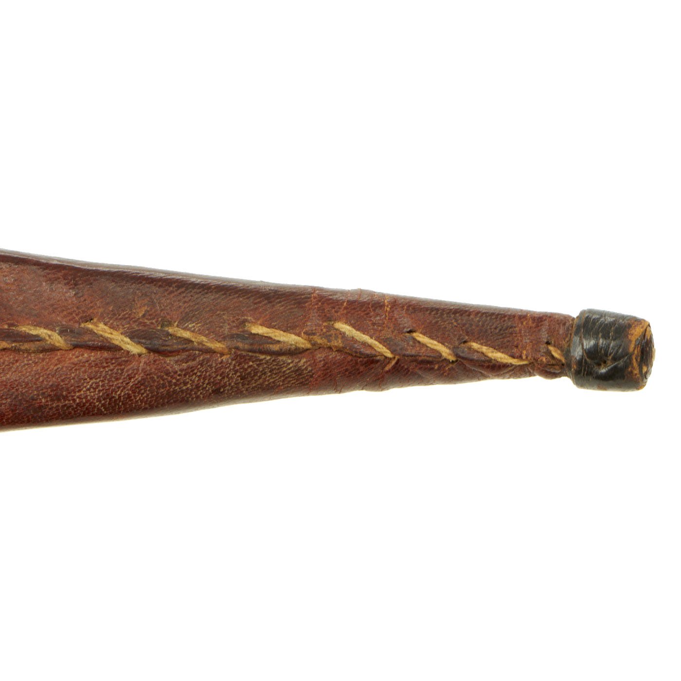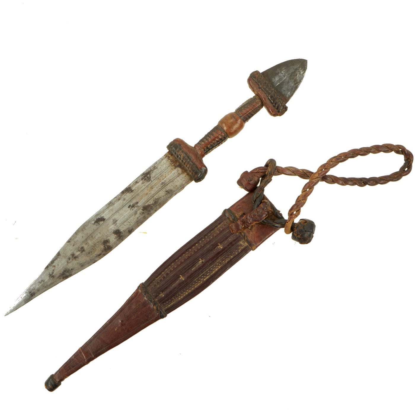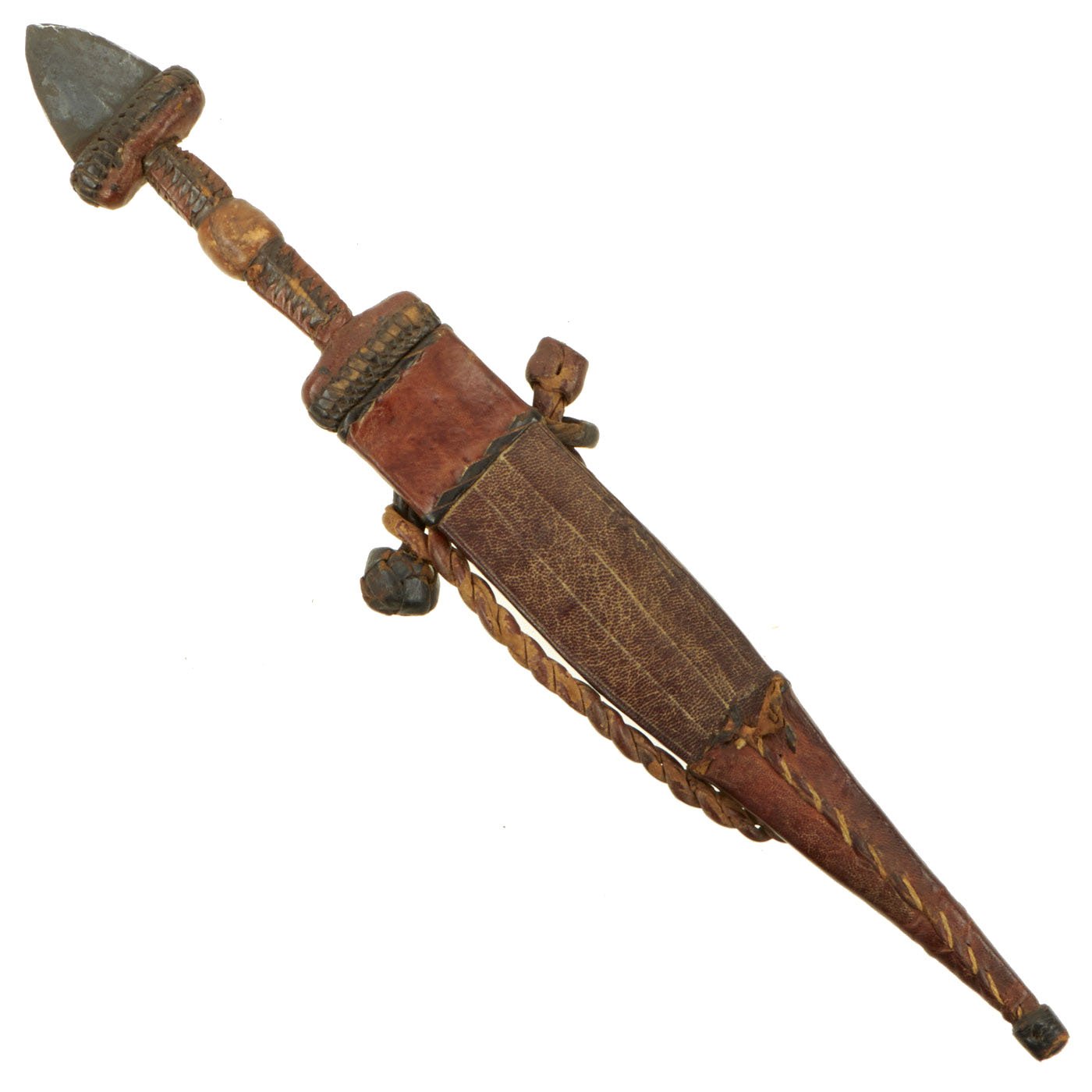Here we have a particularly nice Dervish Arm Dagger with a "Skull Crusher" pommel. It is from the South of the Sudan and has 6 1/8" very tapered blade, double sided, and is 10 3/8" overall. The hilt has a 1 1/8" short dagger head on the pommel which can be used to penetrate into a man's skull. The grip is fully bound with plaited leather. The leather scabbard is decorated with impressed geometrical designs. It still retains its long leather throng used to bind the scabbard to the left forearm where it could be easily accessible to a Whirling Dervish. Its Sudanese owner probably slaughtered by the British Maxim guns used at the Battle of OMDURMAN in 1898.