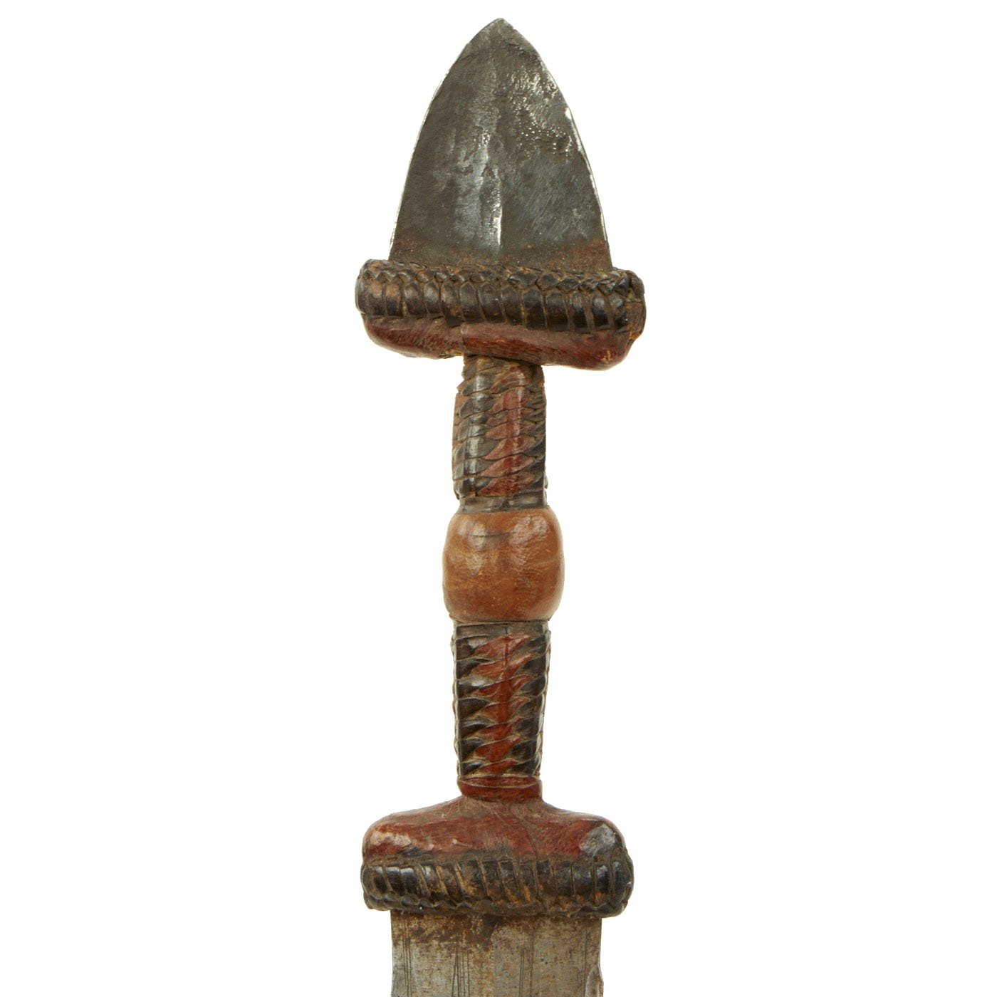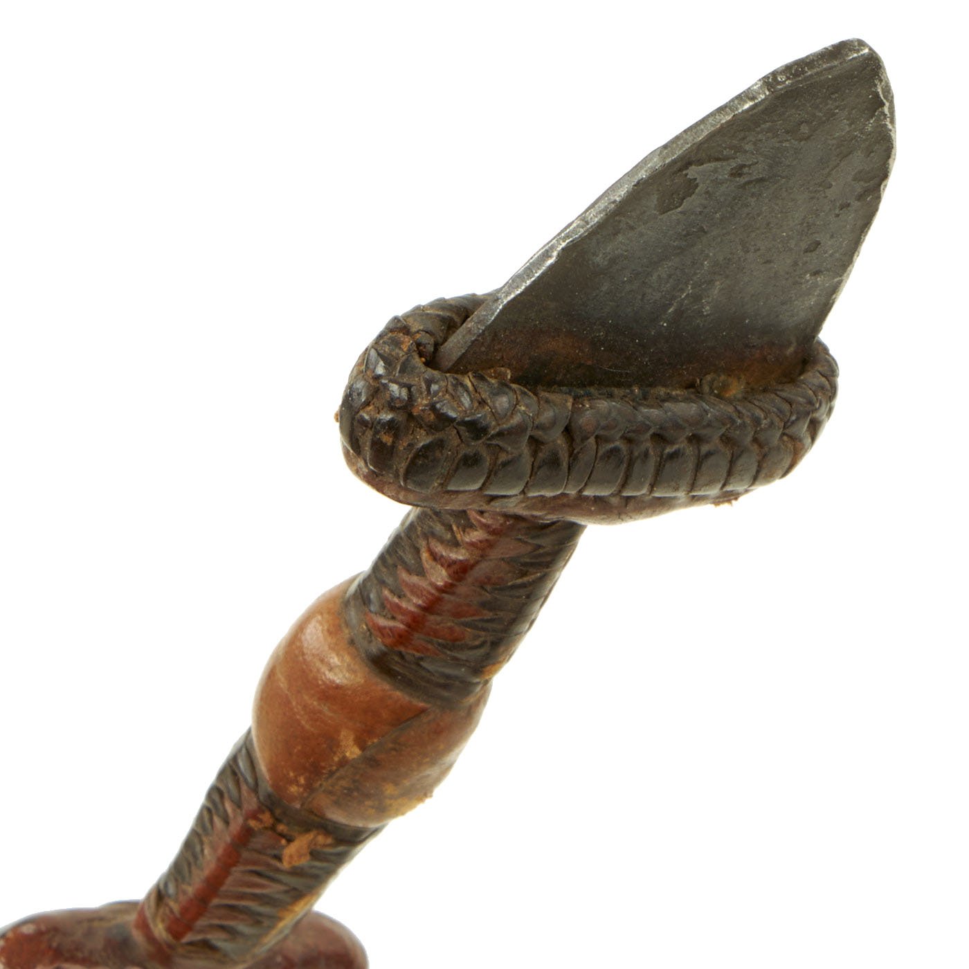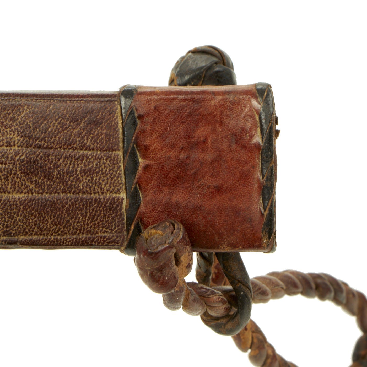 Here we have a particularly nice Dervish Arm Dagger with a "Skull Crusher" pommel. It is from the South of the Sudan and has 6 1/8" very tapered blade, double sided, and is 10 3/8" overall. The hilt has a 1 1/8" short dagger head on the pommel which can be used to penetrate into a man's skull. The grip is fully bound with plaited leather. The leather scabbard is decorated with impressed geometrical designs. It still retains its long leather throng used to bind the scabbard to the left forearm where it could be easily accessible to a Whirling Dervish. Its Sudanese owner probably slaughtered by the British Maxim guns used at the Battle of OMDURMAN in 1898.