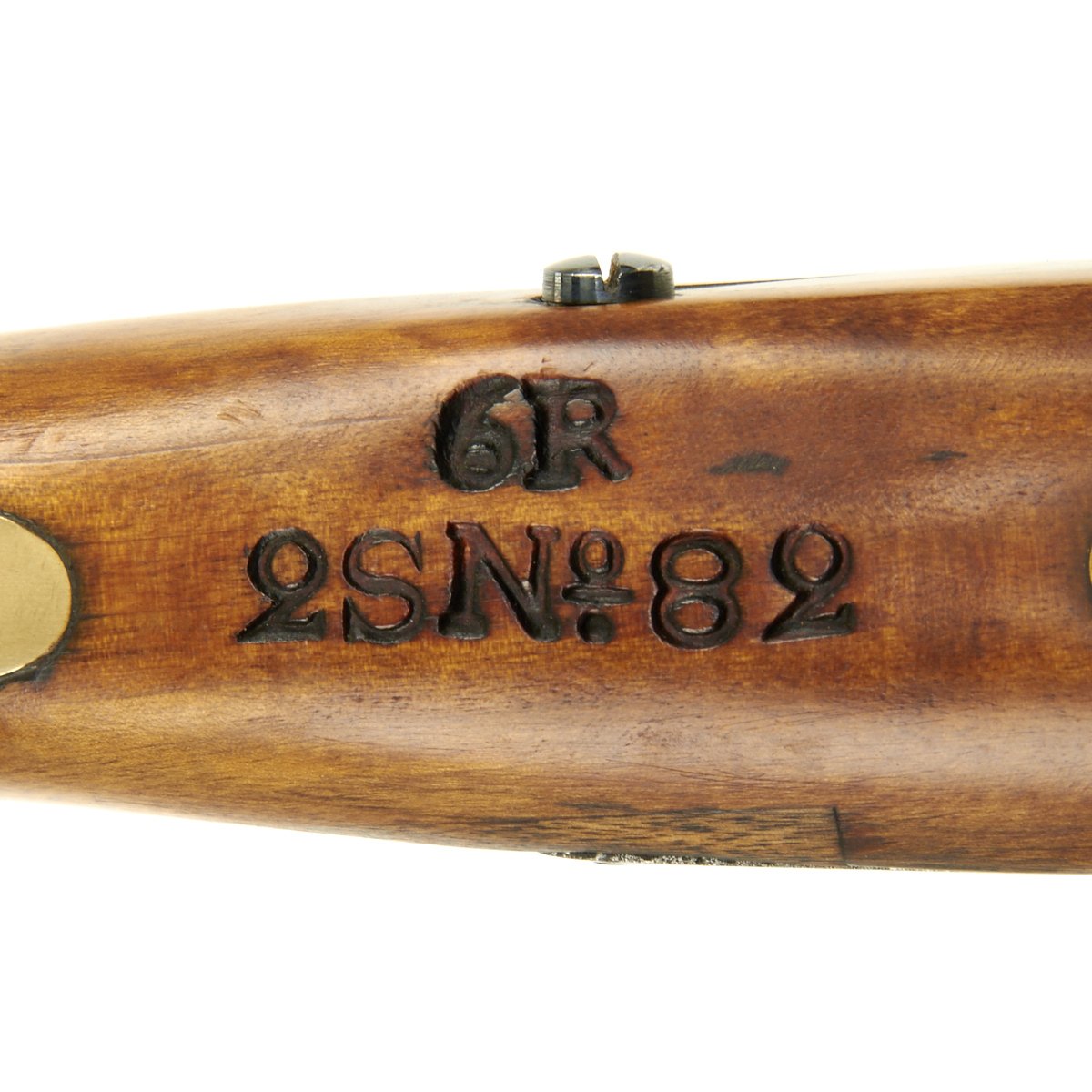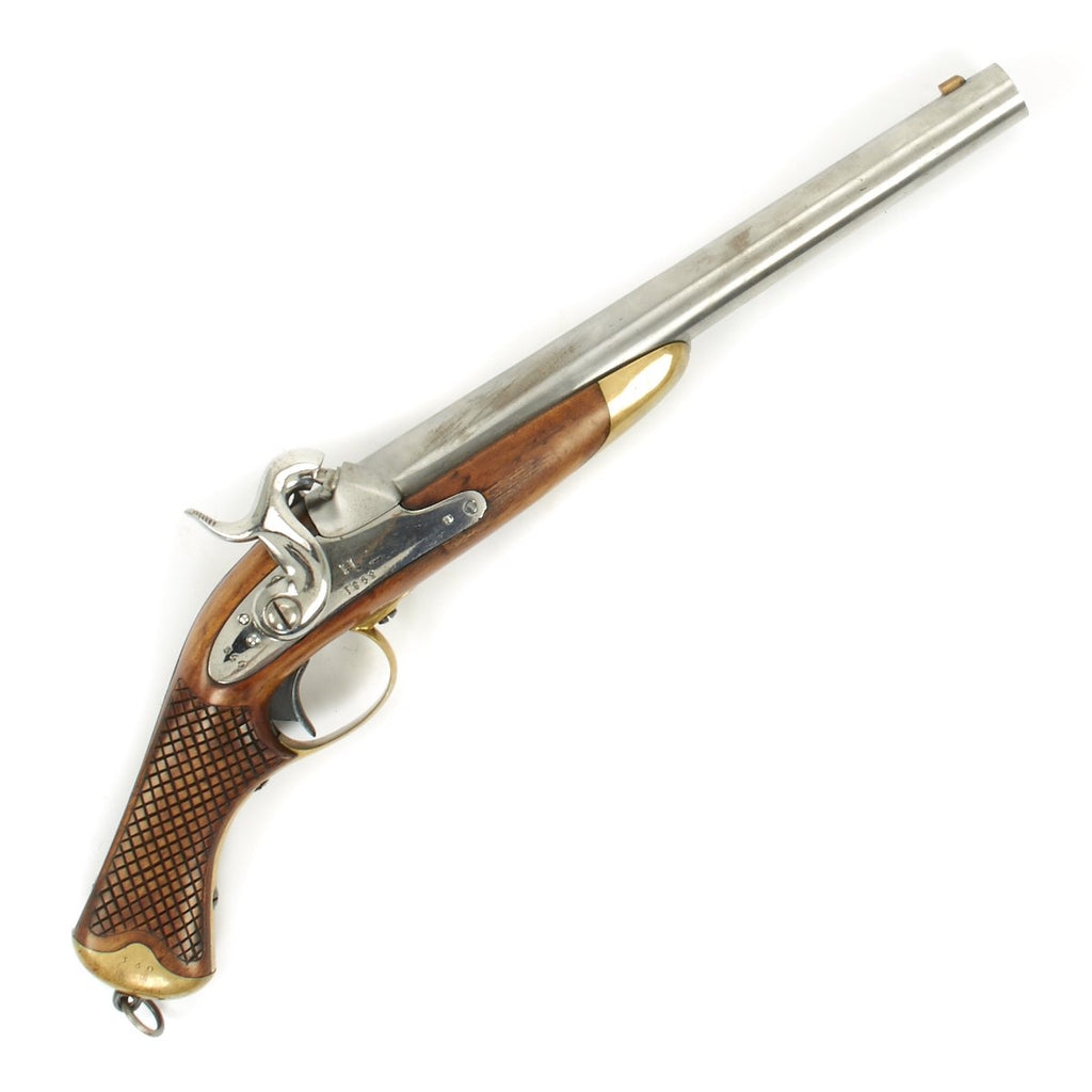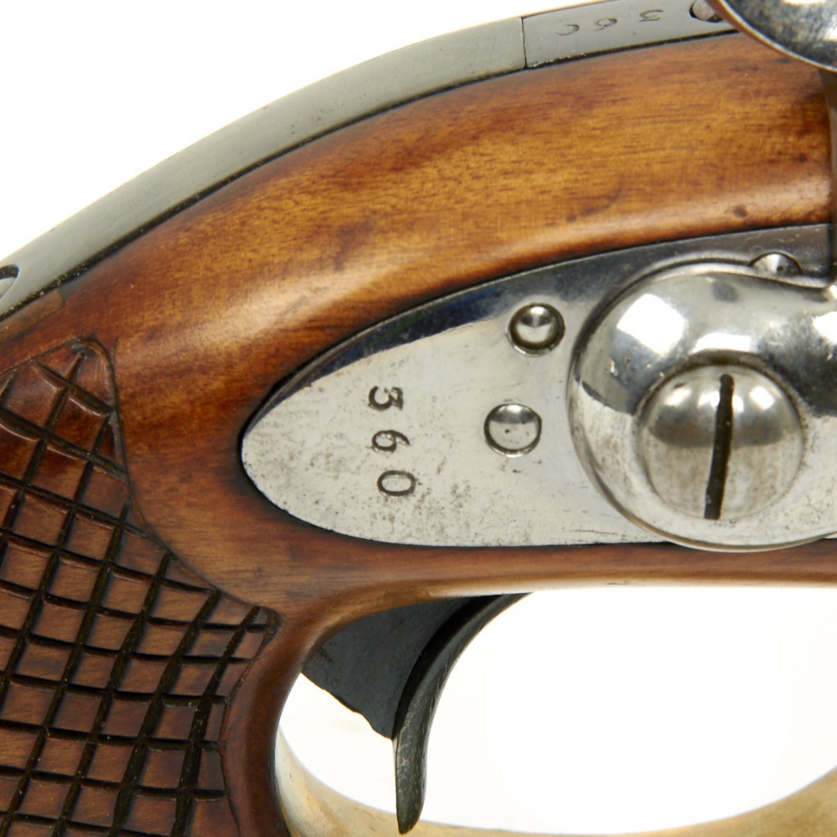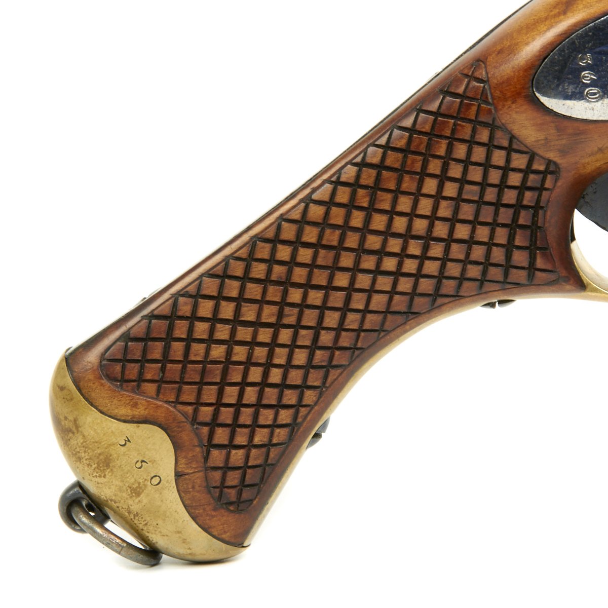 Original Item: Only One Available. This pistol is quite amazing. It bears regimental markings of 6 R / 2 S No.82 branded into the bottom of the stock. Serial number 360 is visible on most parts of the pistol, and it has a full deep checkered grip with brass mounts. This pistol really looks to be in like-issued condition. The Beech wood stock has two very small wood repairs, the metal work is polished to a high shine, and the lock plate is marked H over 1852 and has the serial number of 360 across the tail. H signifies that the manufacturer was Husqvarna, a firm that still exists to this day.