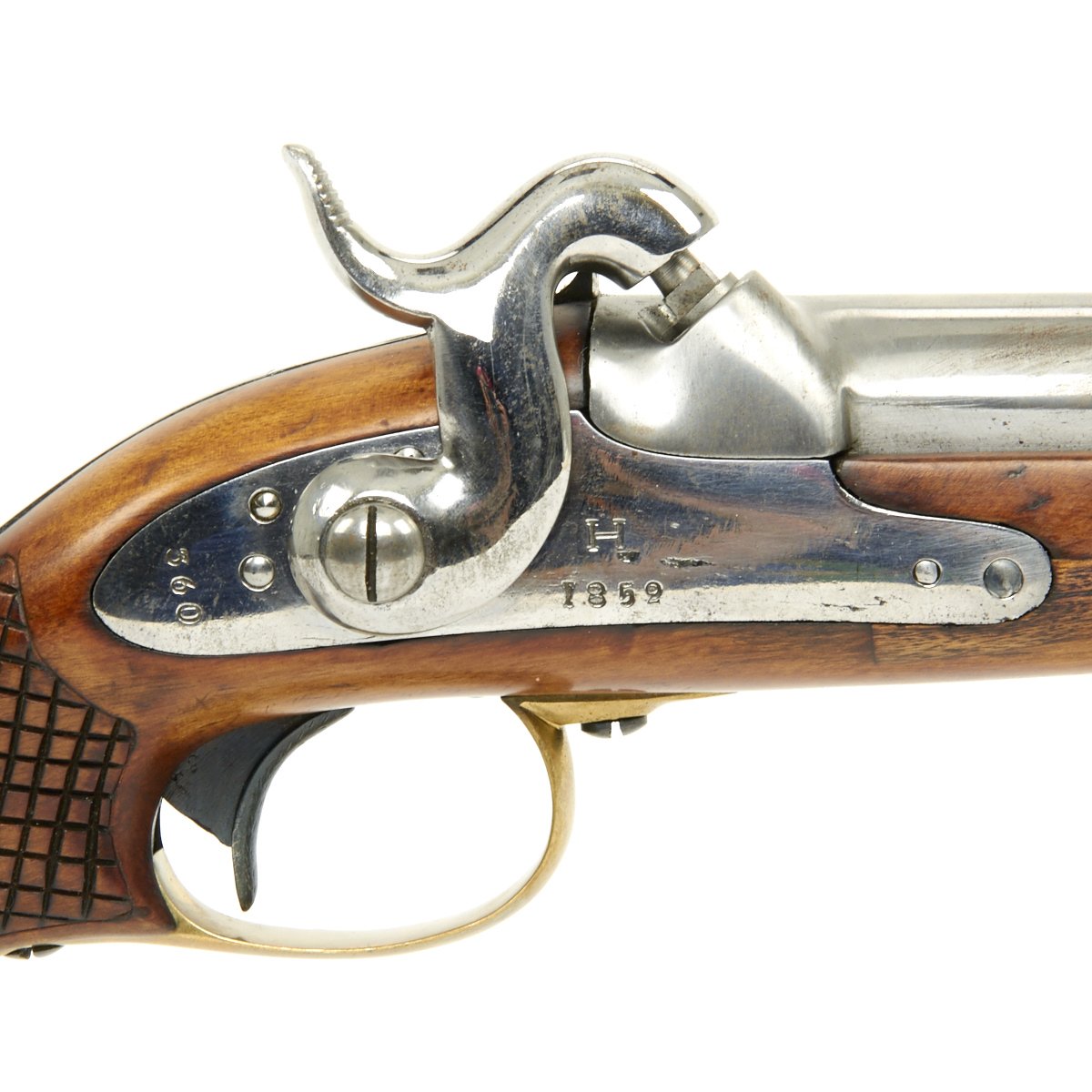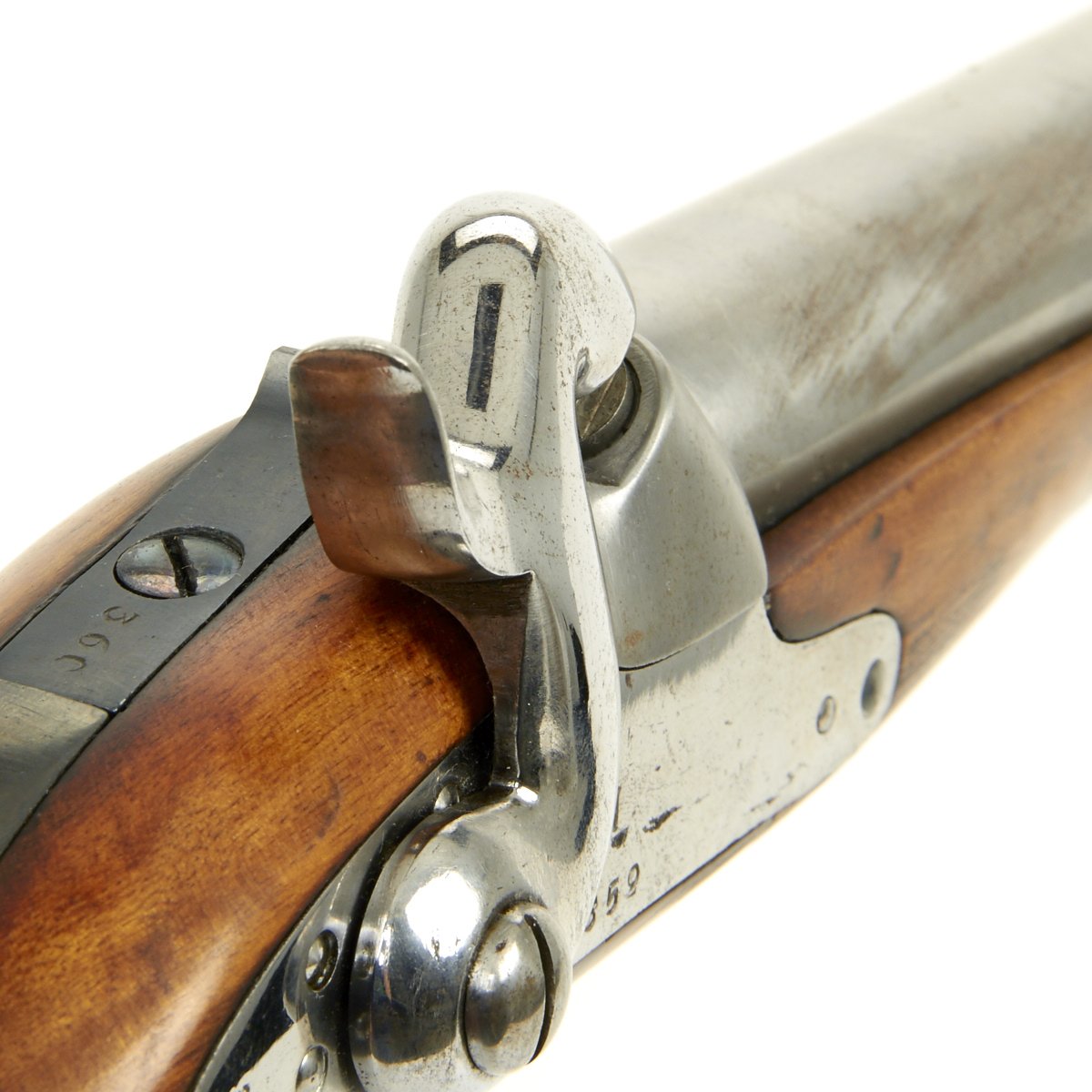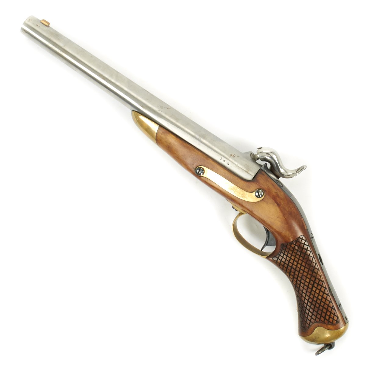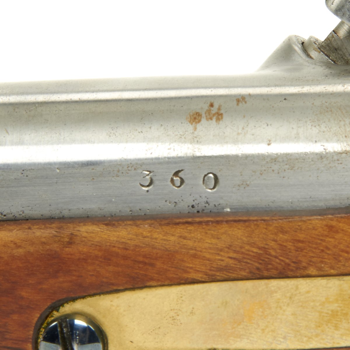 Original Item: Only One Available. This pistol is quite amazing. It bears regimental markings of 6 R / 2 S No.82 branded into the bottom of the stock. Serial number 360 is visible on most parts of the pistol, and it has a full deep checkered grip with brass mounts. This pistol really looks to be in like-issued condition. The Beech wood stock has two very small wood repairs, the metal work is polished to a high shine, and the lock plate is marked H over 1852 and has the serial number of 360 across the tail. H signifies that the manufacturer was Husqvarna, a firm that still exists to this day.