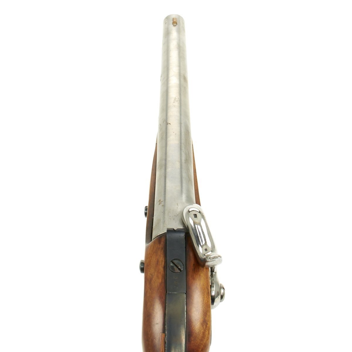 A very distinctive design, this is one of the very last single shot Military Pistols adopted by any European Nation. This wonderful example clearly having been kept either as a reference sample or on display may very well have never been fired. The heavily blued back strap shows the connection point of the attaching the optional wood shoulder stock unfortunately not included.