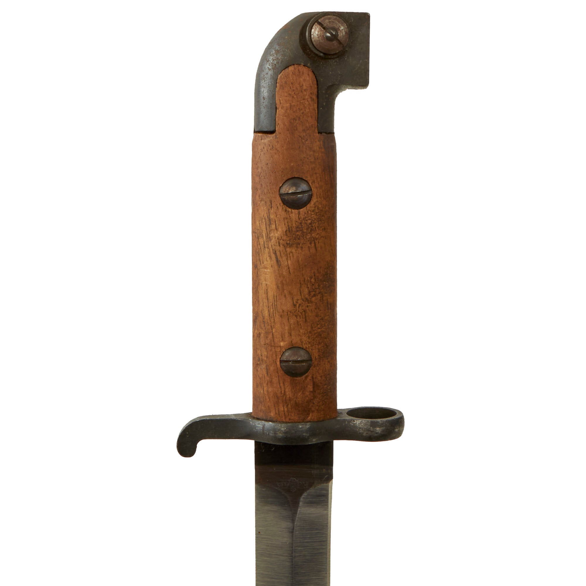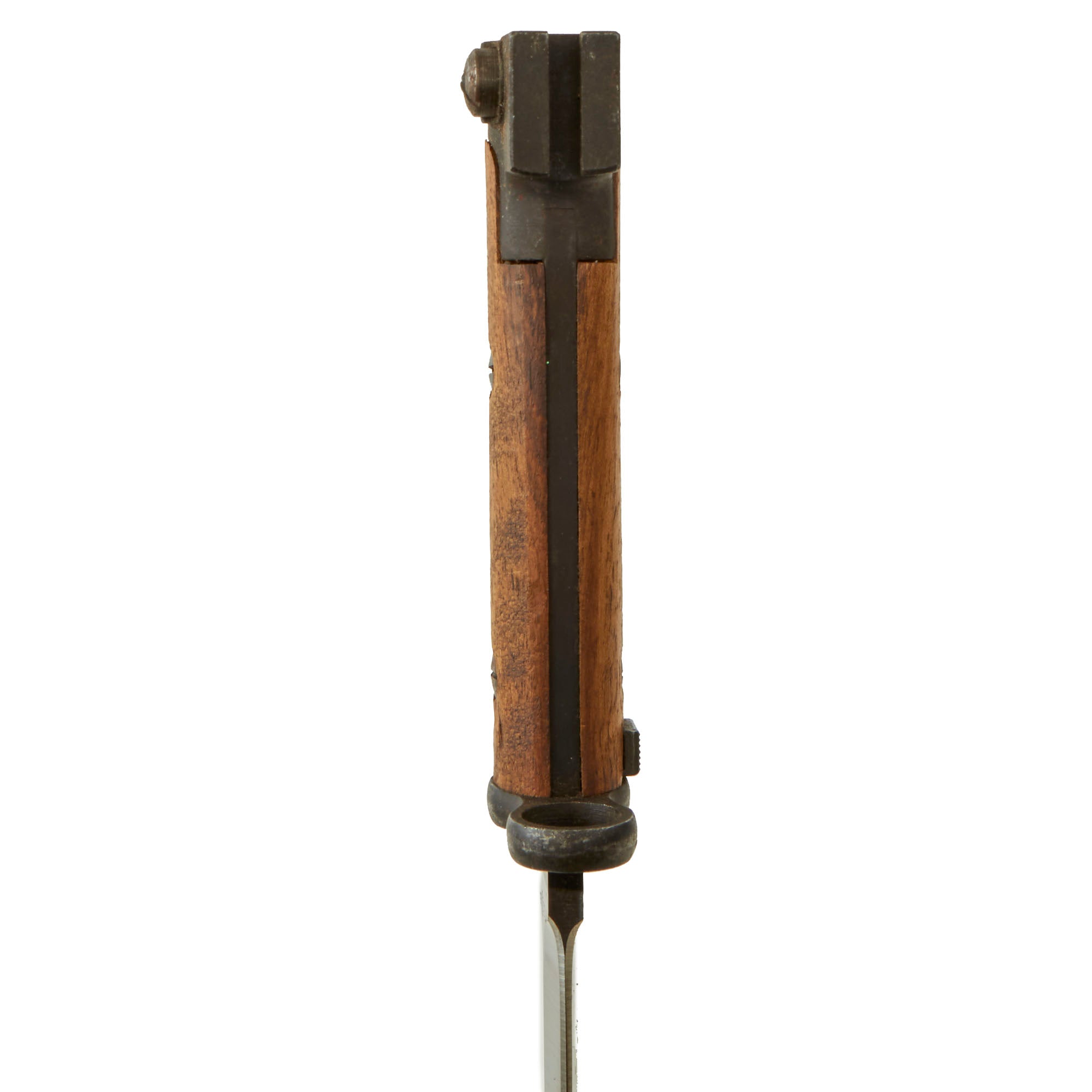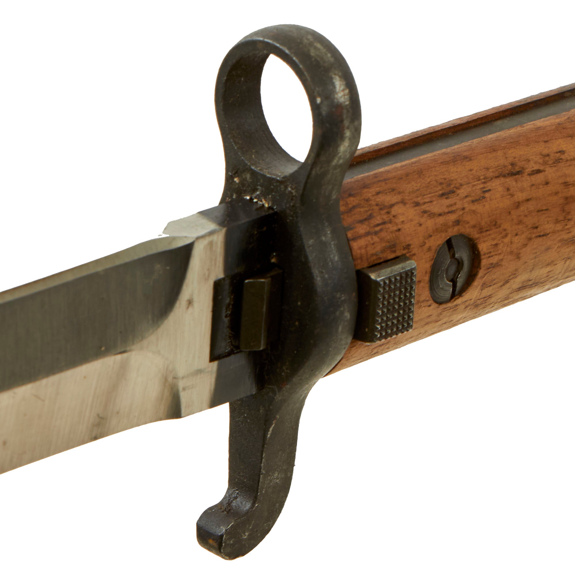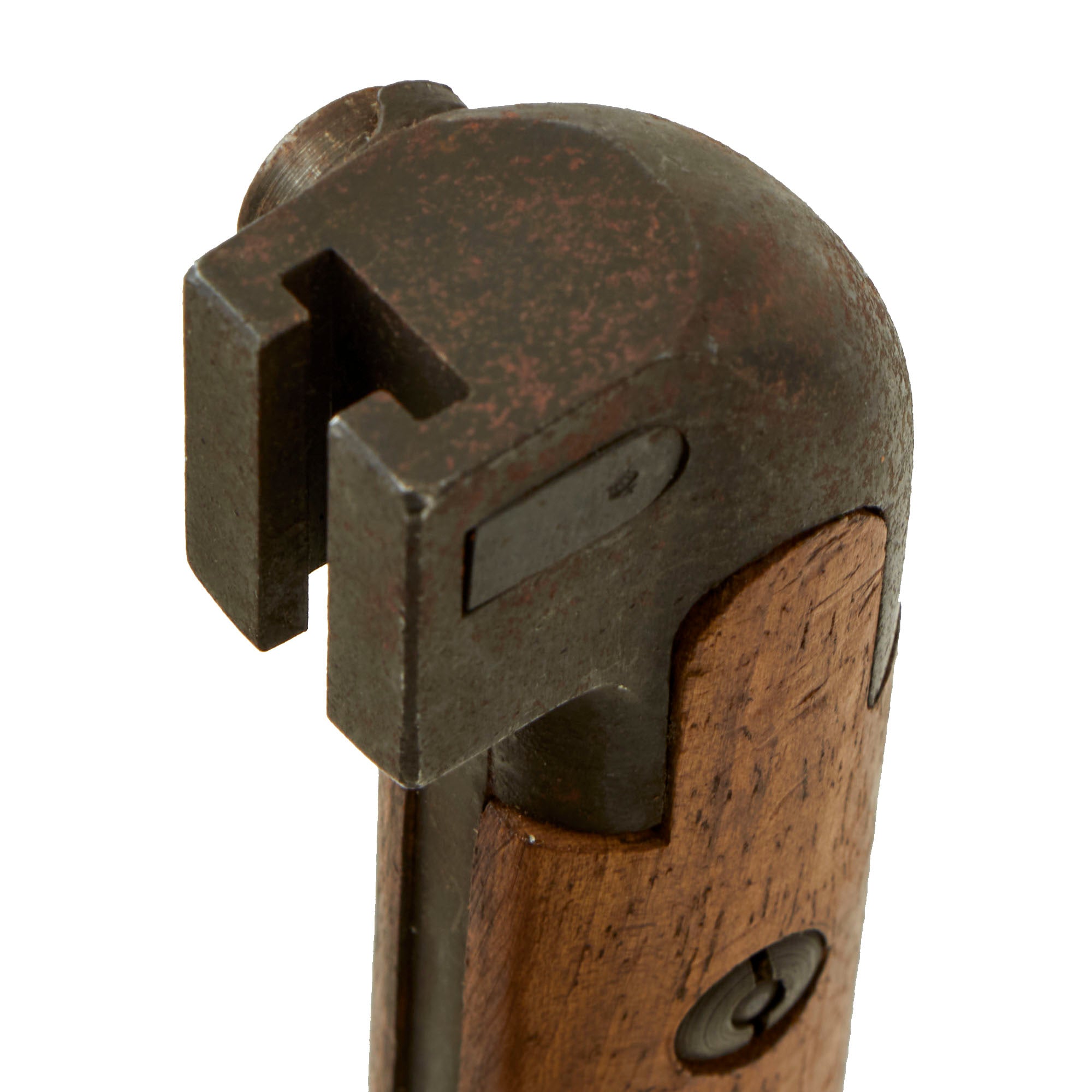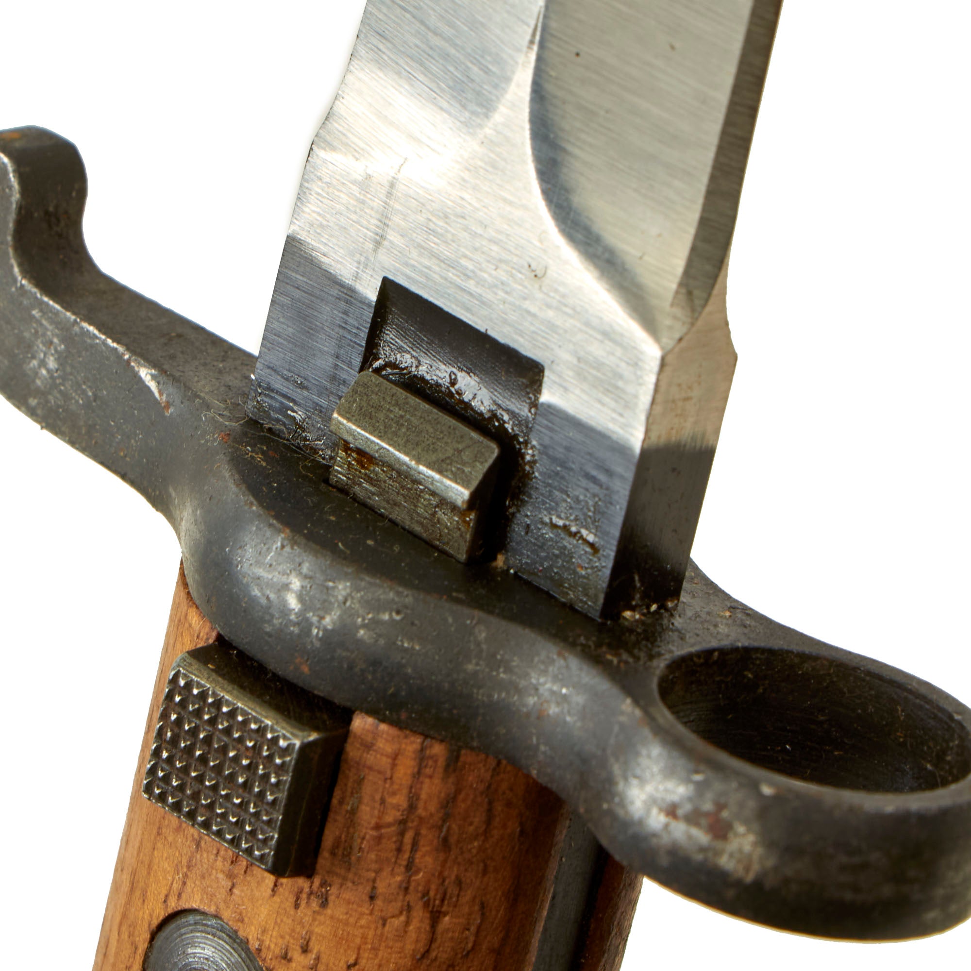The cross guard with muzzle ring and curved pommel with spring catch are in similar excellent condition. The wood grips are superb and secured by the correct screws. The grip is fitted with the correct scabbard retaining catch with a knurled top square button. The odd hilt design gives away that this is a bayonet designed for a rifle that wasn't originally designed to mount a bayonet. In 1914, M1894 Carbines were altered by the addition of a nose cap that incorporated a bayonet mount. The hilt incorporates a locking device to secure the bayonet to the scabbard. There is some scattered oxidation on the hilt.