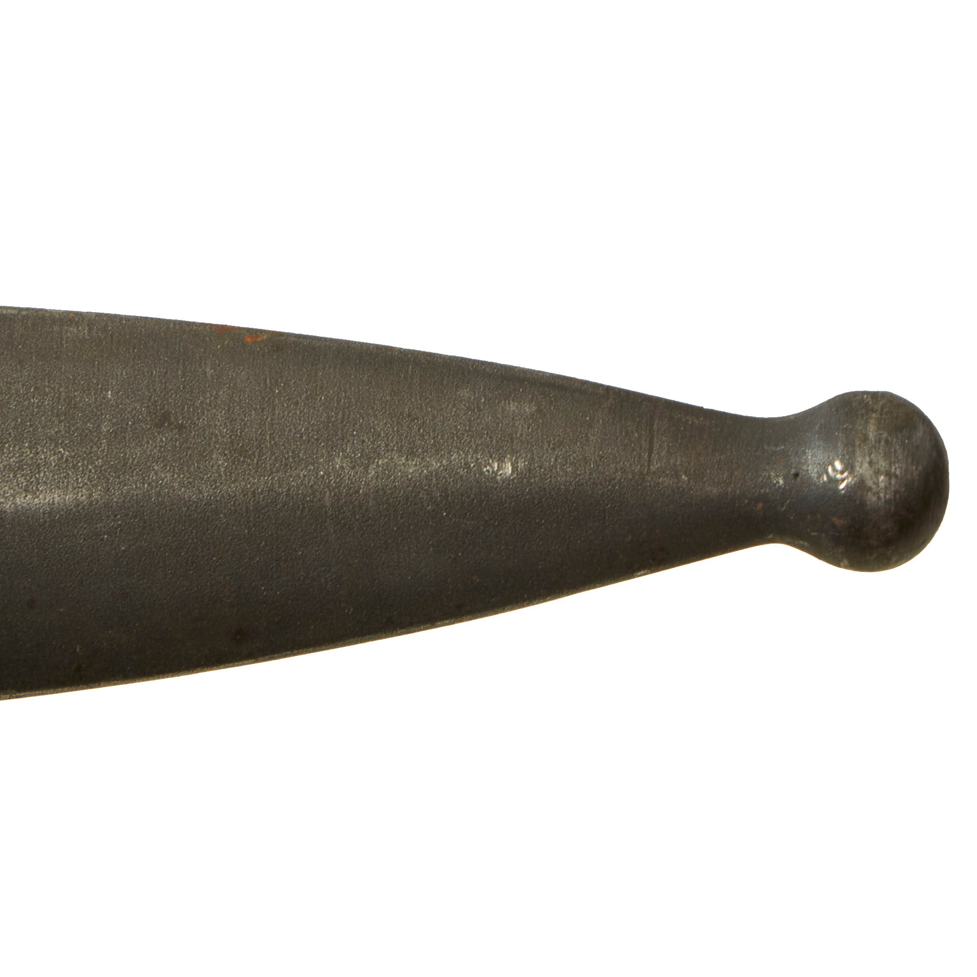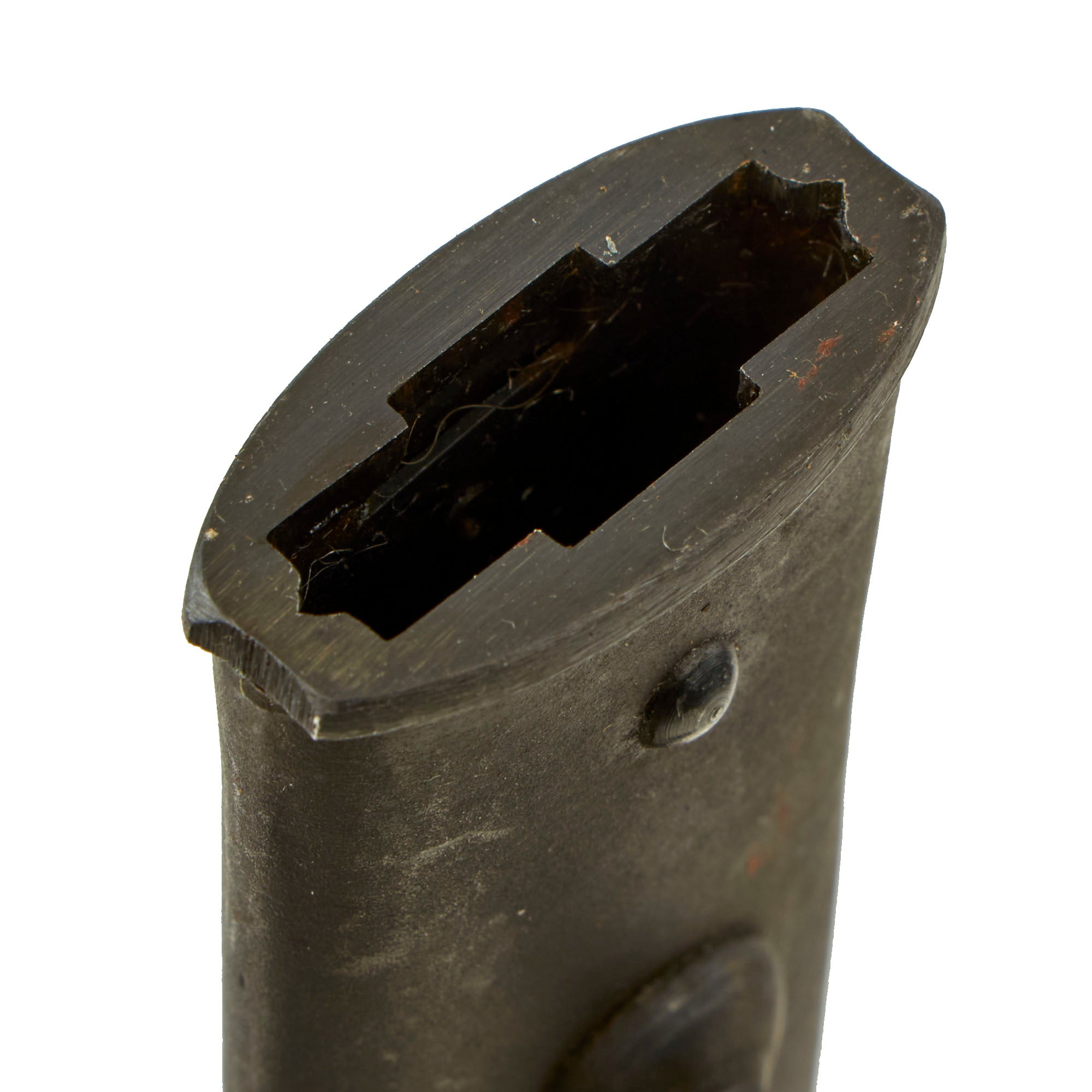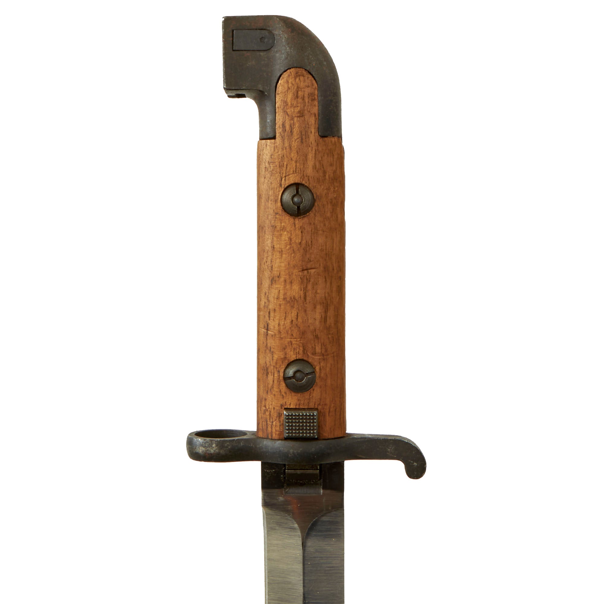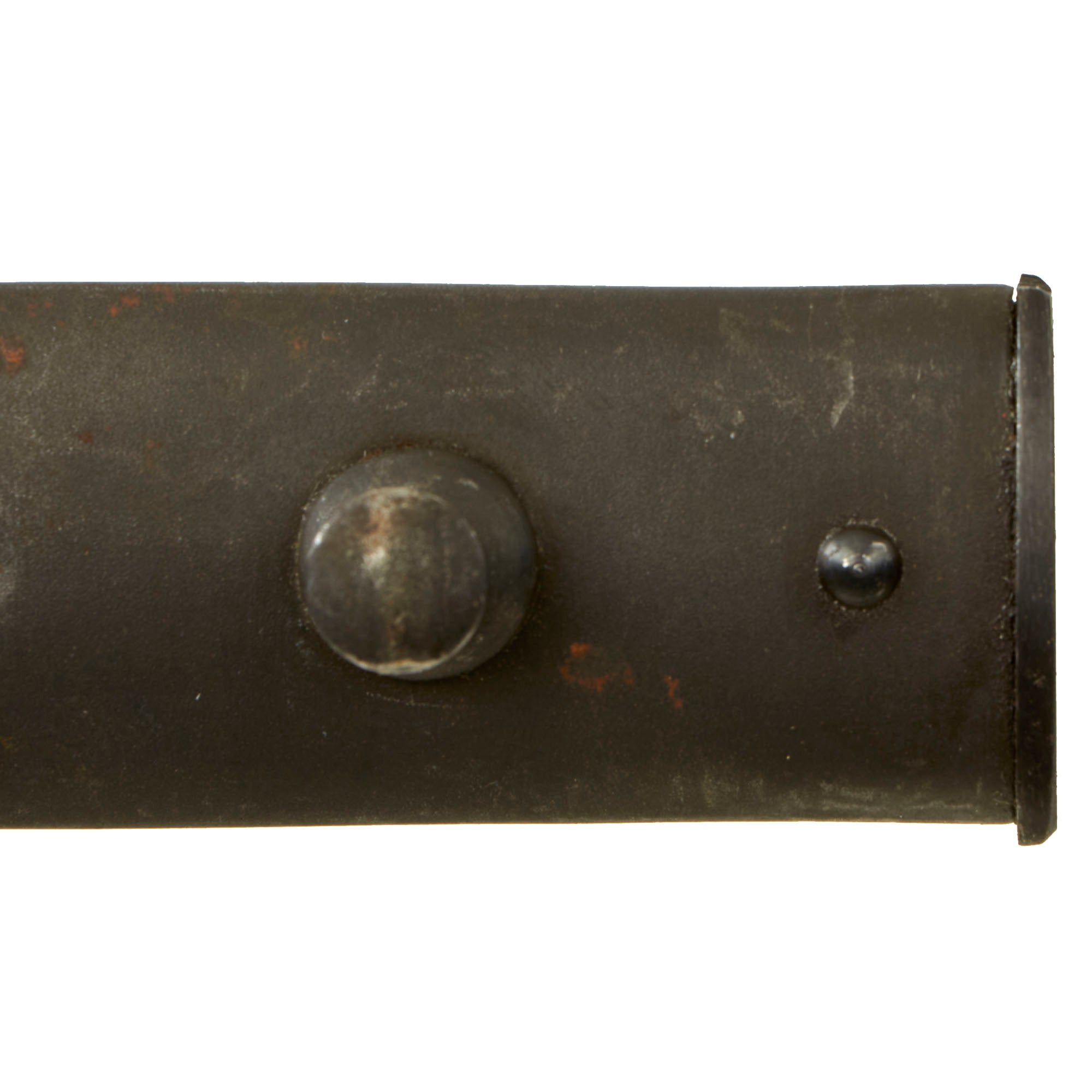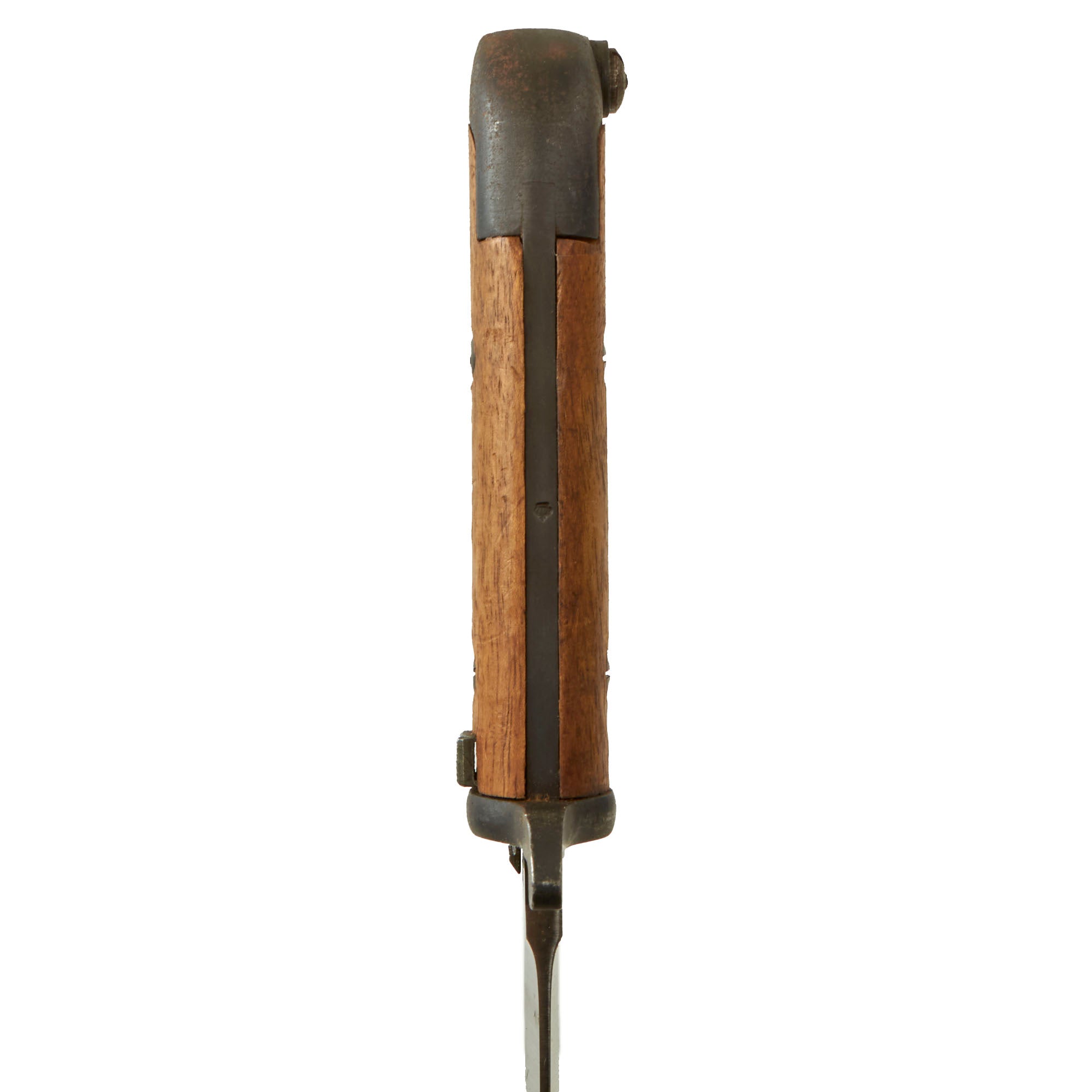 The cross guard with muzzle ring and curved pommel with spring catch are in similar excellent condition. The wood grips are superb and secured by the correct screws. The grip is fitted with the correct scabbard retaining catch with a knurled top square button. The odd hilt design gives away that this is a bayonet designed for a rifle that wasn't originally designed to mount a bayonet. In 1914, M1894 Carbines were altered by the addition of a nose cap that incorporated a bayonet mount. The hilt incorporates a locking device to secure the bayonet to the scabbard. There is some scattered oxidation on the hilt.