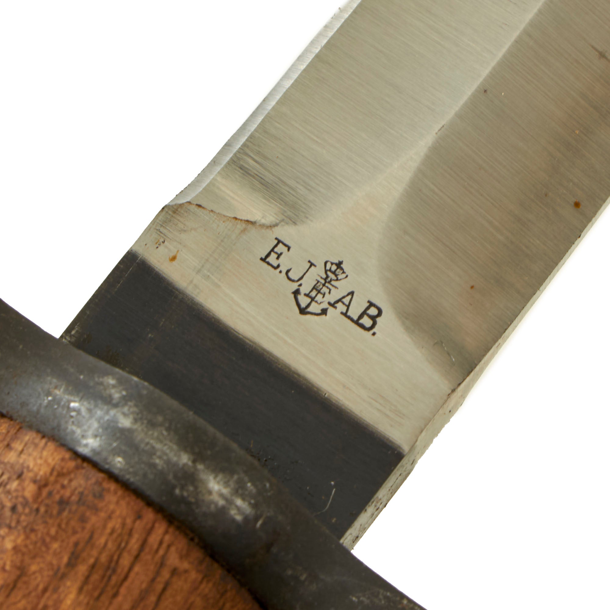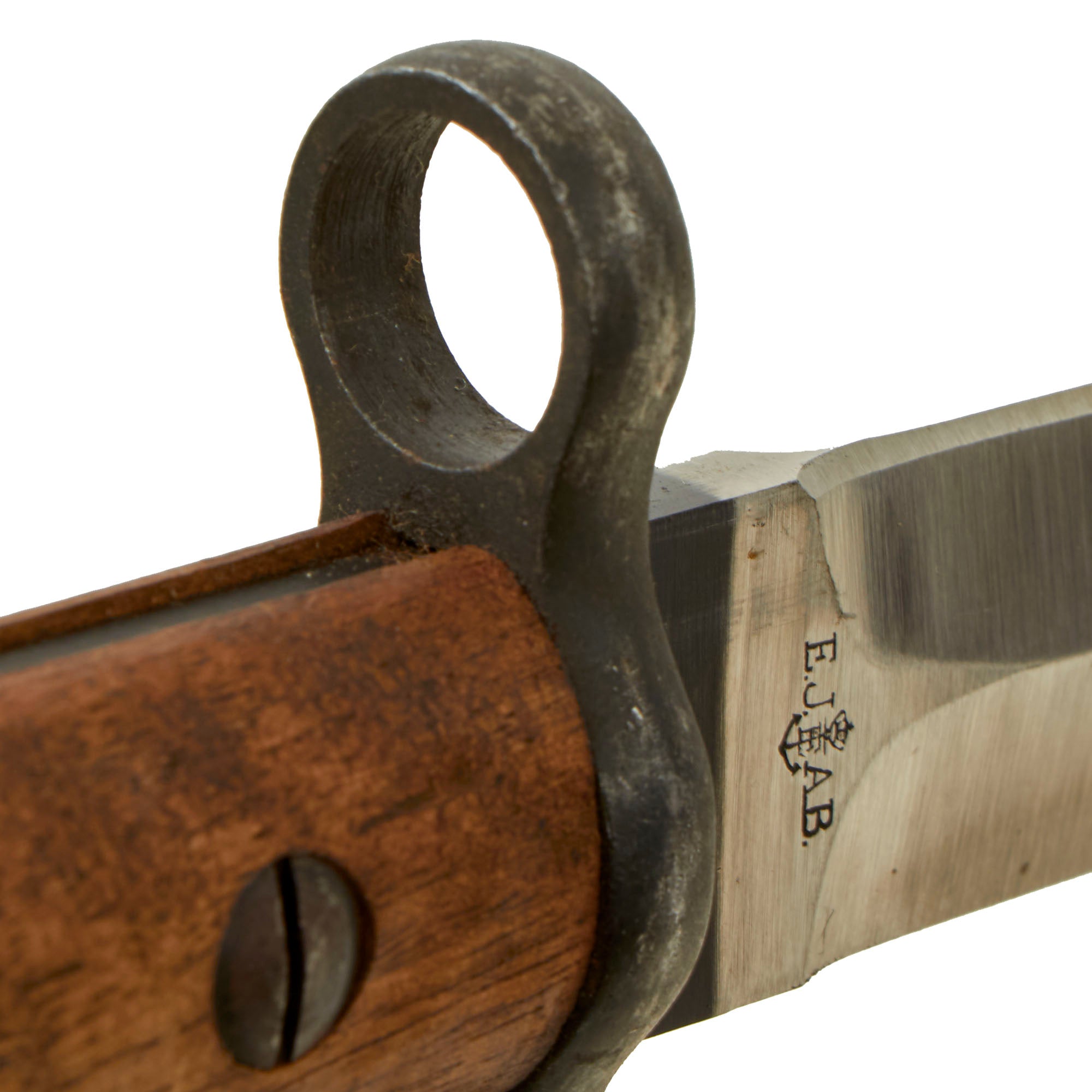 The bayonet measures 18 1/8" overall, with a 13" blade with medial ridge which is double edged for the last 5" to the tip. The ricasso is crisply marked by the manufacturer EJEAB combined with Crown and Anchor which is the maker's mark of Eskilstuna Jernmanufactur AB (Eskilstuna Iron Manufacturing, Inc.). Blade is in unissued condition except for runner marks.