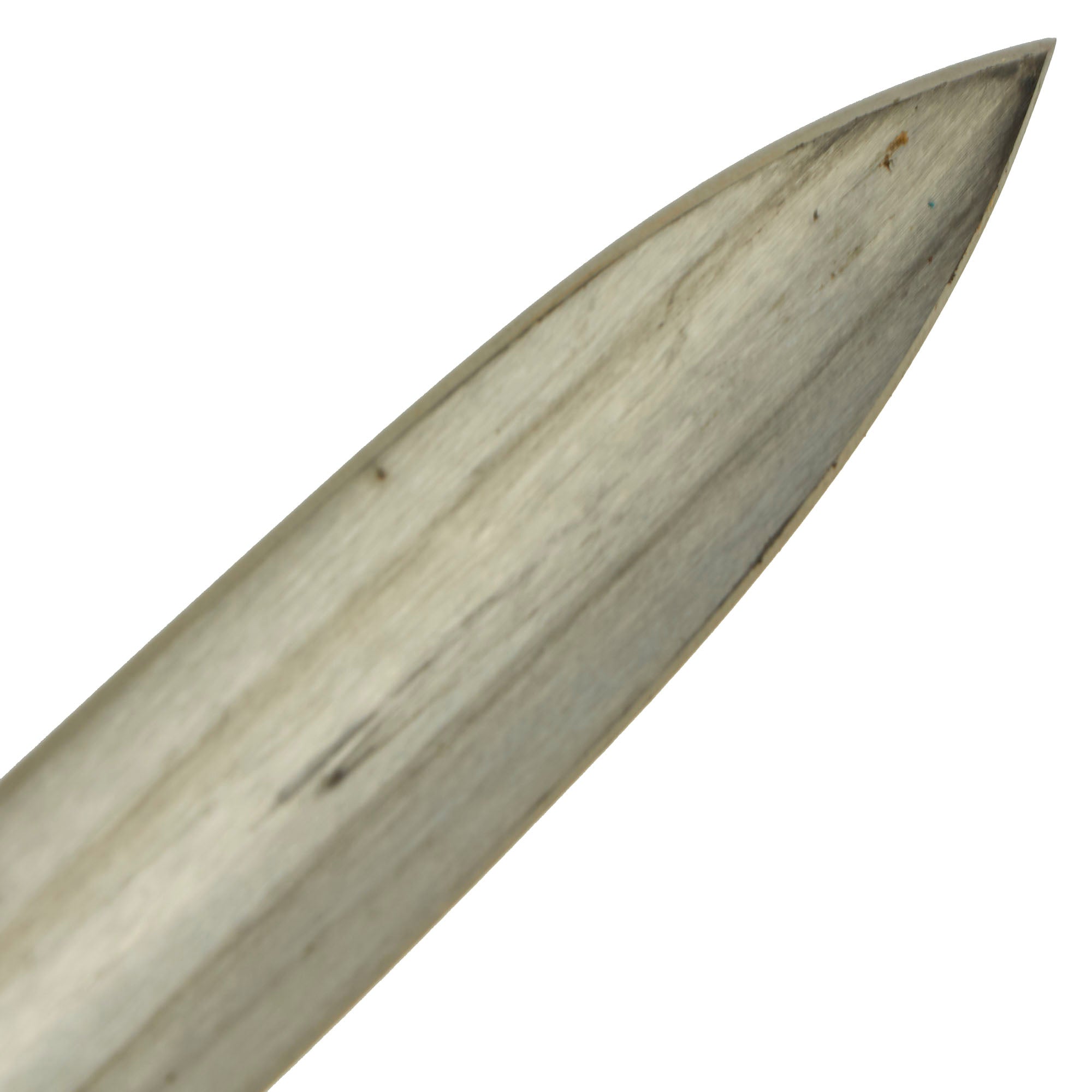 The bayonet is complete with its flat steel scabbard with frog stud and tear drop end. The body of the scabbard is dent free, though years of storage have The tear drop end is stamped with a 'Crown' mark. There are not any regimental marks, indicating that this bayonet was never issued.