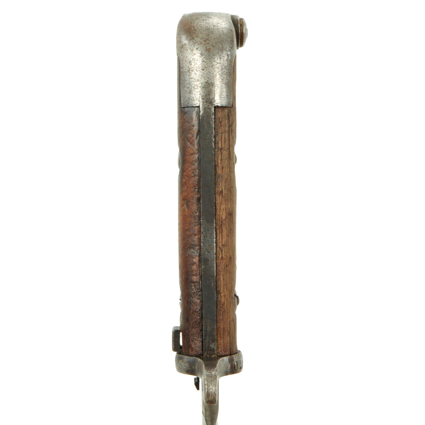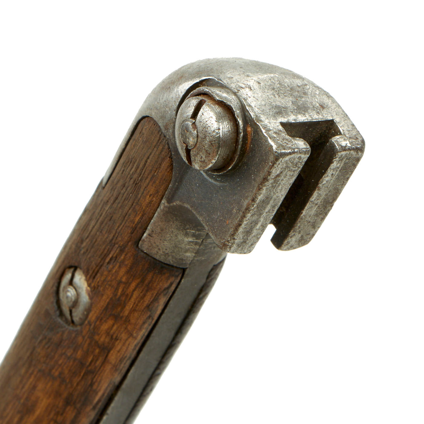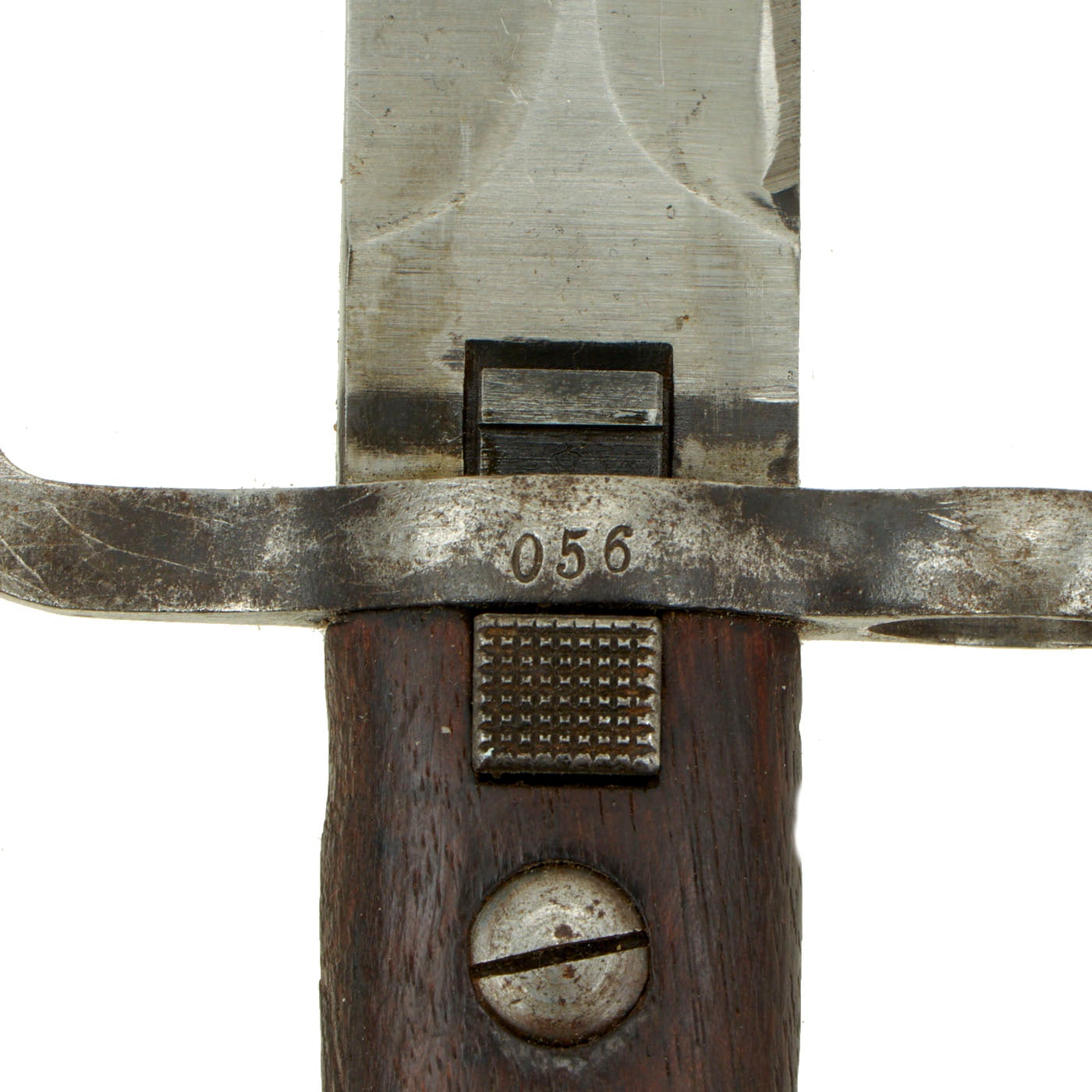 The cross guard with muzzle ring and curved pommel with spring catch are in similar excellent condition. The wood grips are superb and secured by the correct screws. The grip is fitted with the correct scabbard retaining catch with a knurled top square button. The odd hilt design gives away that this is a bayonet designed for a rifle that wasn't originally designed to mount a bayonet. In 1914, M1894 Carbines were altered by the addition of a nose cap that incorporated a bayonet mount. The hilt incorporates a locking device to secure the bayonet to the scabbard.