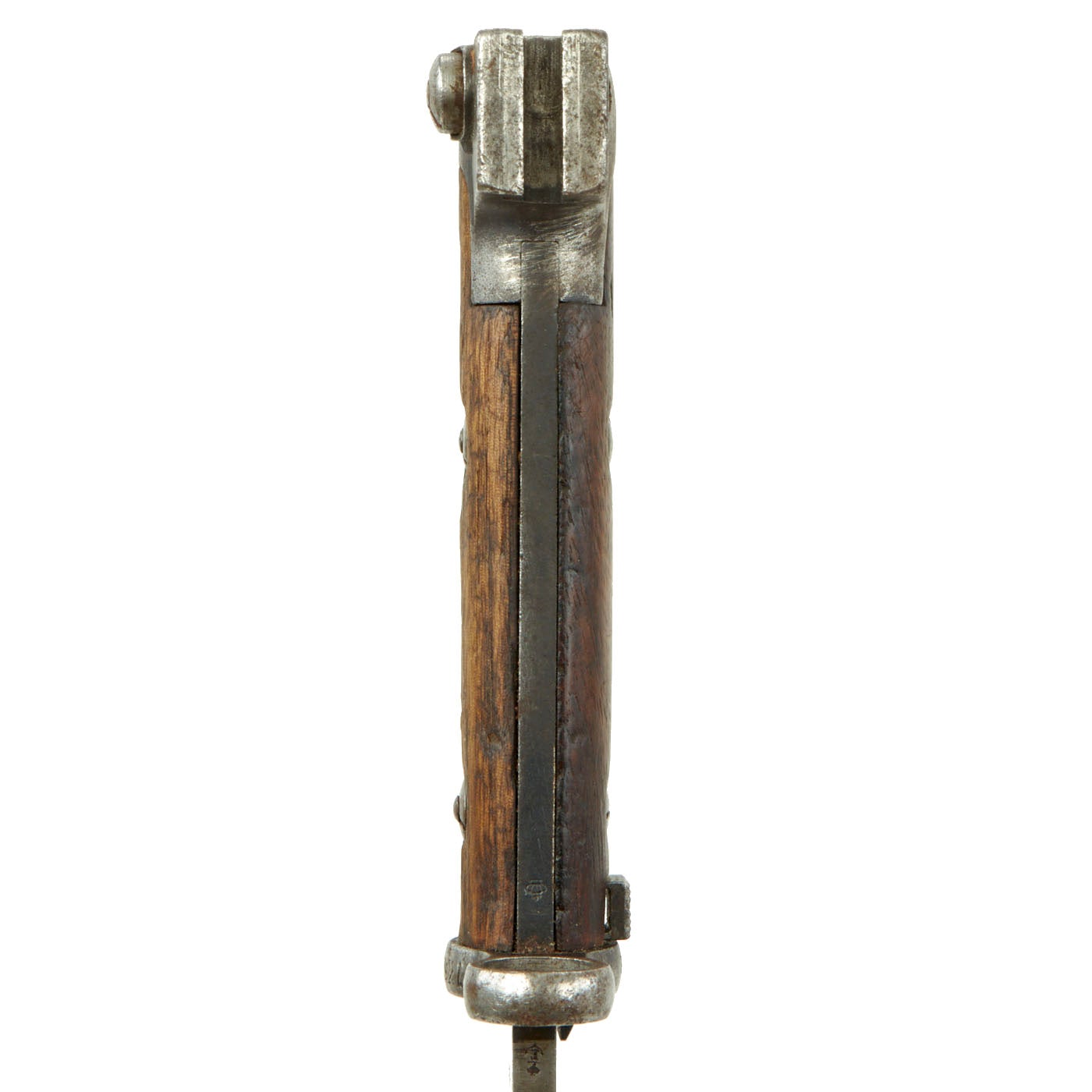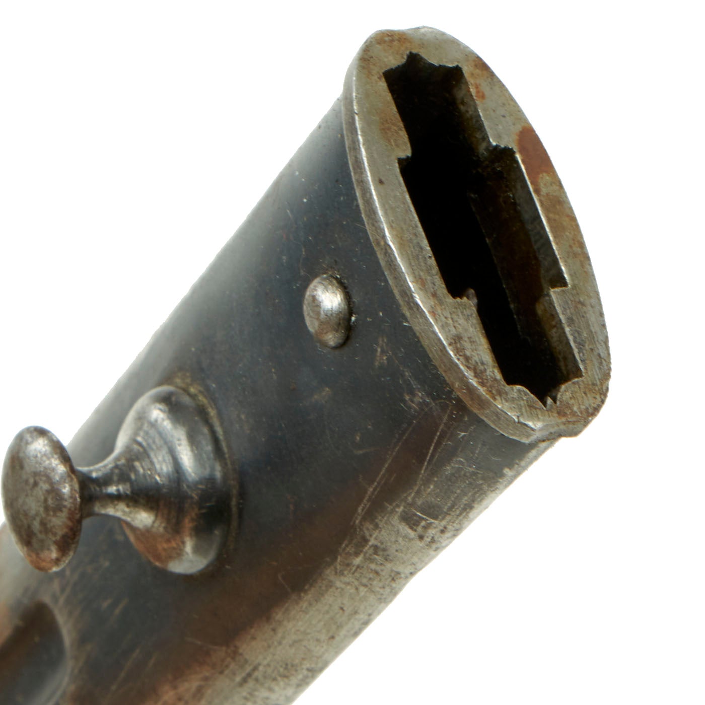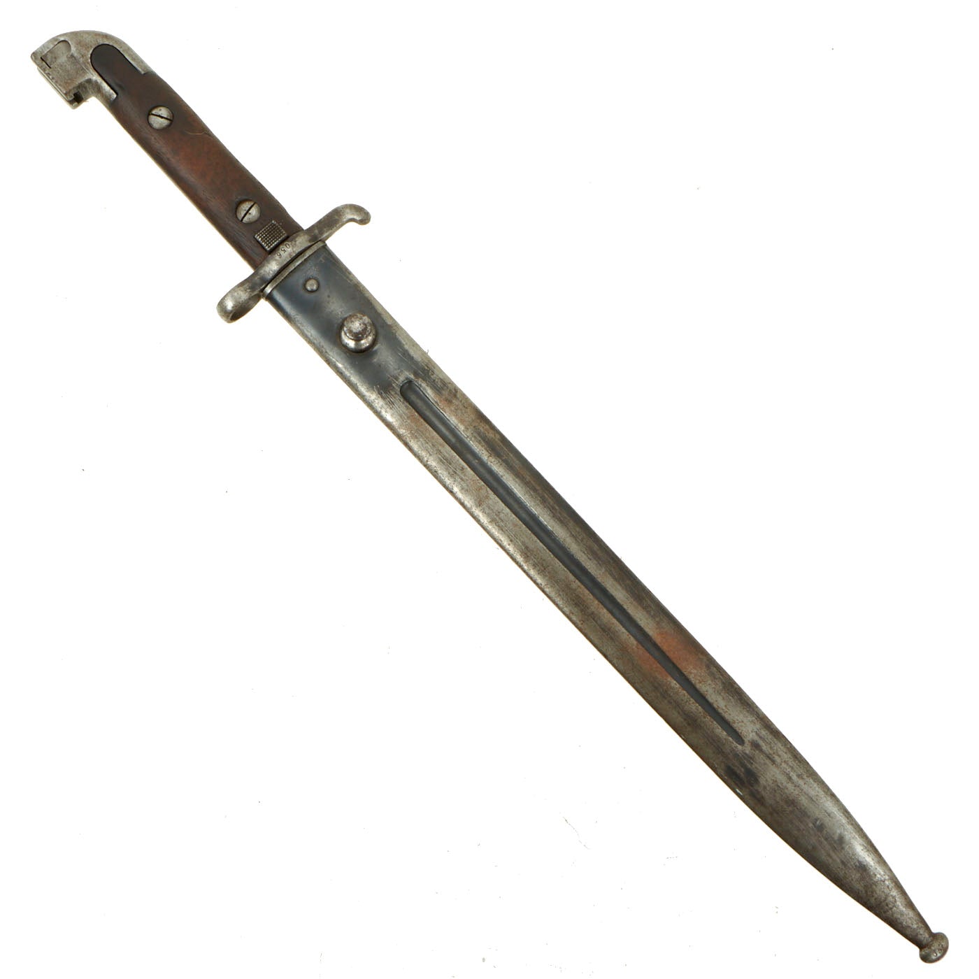 The cross guard with muzzle ring and curved pommel with spring catch are in similar excellent condition. The wood grips are superb and secured by the correct screws. The grip is fitted with the correct scabbard retaining catch with a knurled top square button. The odd hilt design gives away that this is a bayonet designed for a rifle that wasn't originally designed to mount a bayonet. In 1914, M1894 Carbines were altered by the addition of a nose cap that incorporated a bayonet mount. The hilt incorporates a locking device to secure the bayonet to the scabbard.