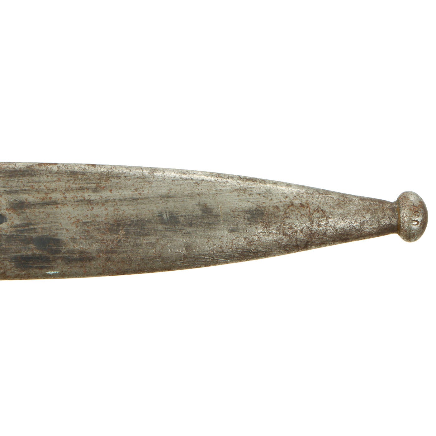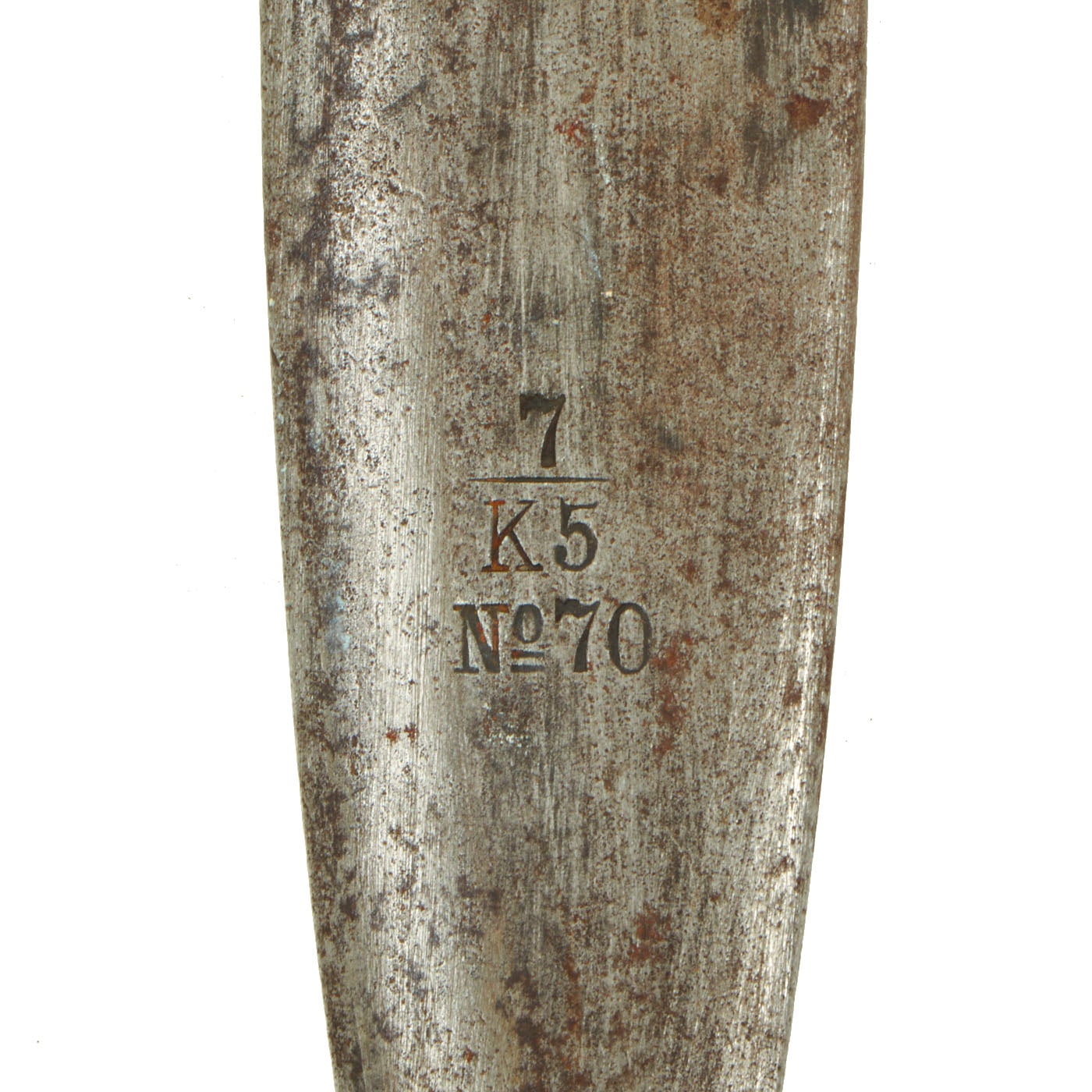 The bayonet measures 18 1/4" overall, with a 13" blade with medial ridge which is double edged for the last 4 ½” to the tip. This example is early production at Eskilstuna Jernmanufactur AB (Eskilstuna Iron Manufacturing, Inc.), as evidenced by the maker's trademark on the spine, which is on anchor on the blade spine and a crown on the grip spine. Most were marked on the ricasso. It is not known when EJEAB changed from marking the spine to marking the ricasso. Later examples produced by Carl Gustaf Stads were marked on the ricasso.