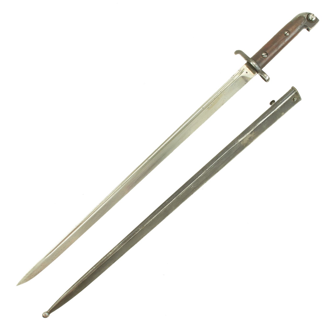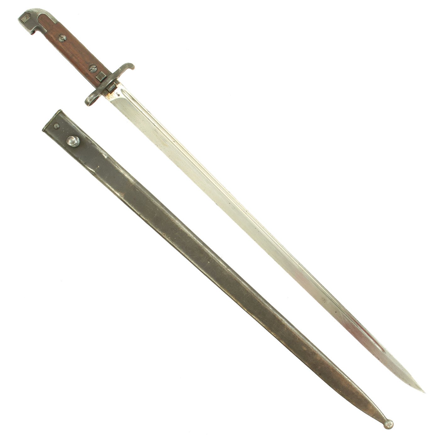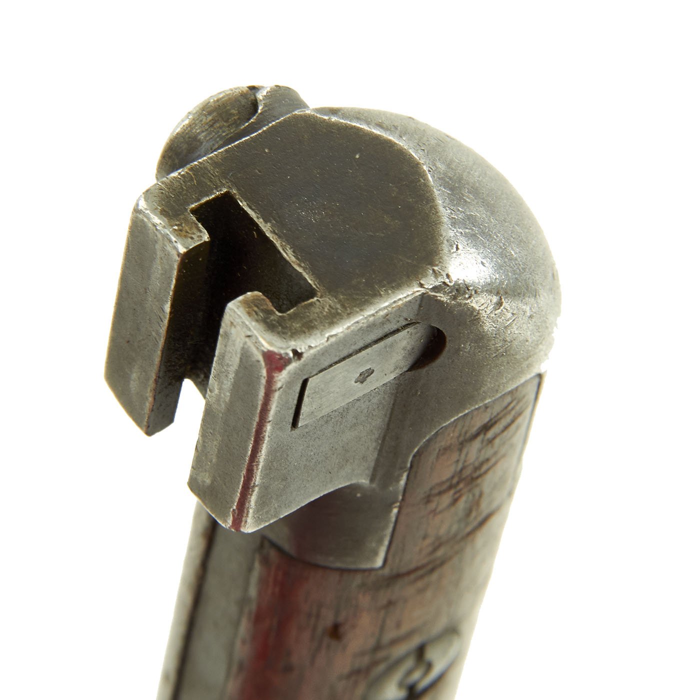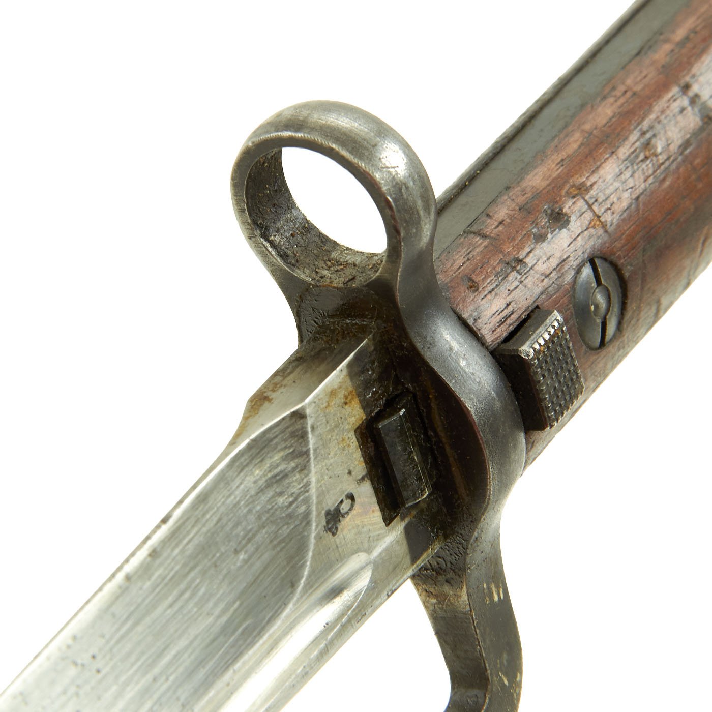 So rare few collectors have ever seen one in the flesh, only in books. Comes complete with its long all steel scabbard that locks onto the bayonet and freed by pressing the knurled release button at the front of the wood grip. Rack number 22 is stamped on the bayonet's pommel, and there is a Crown over "C" proof on the ricasso, which is the maker's mark of Carl Gustafs Stads Gevärsfaktori (Carl Gustafs City's Gun Factory). The scabbard throat is marked similarly, indicating it was made by the same manufacturer. There is also a Swedish crown proof on the blade's reverse ricasso.
