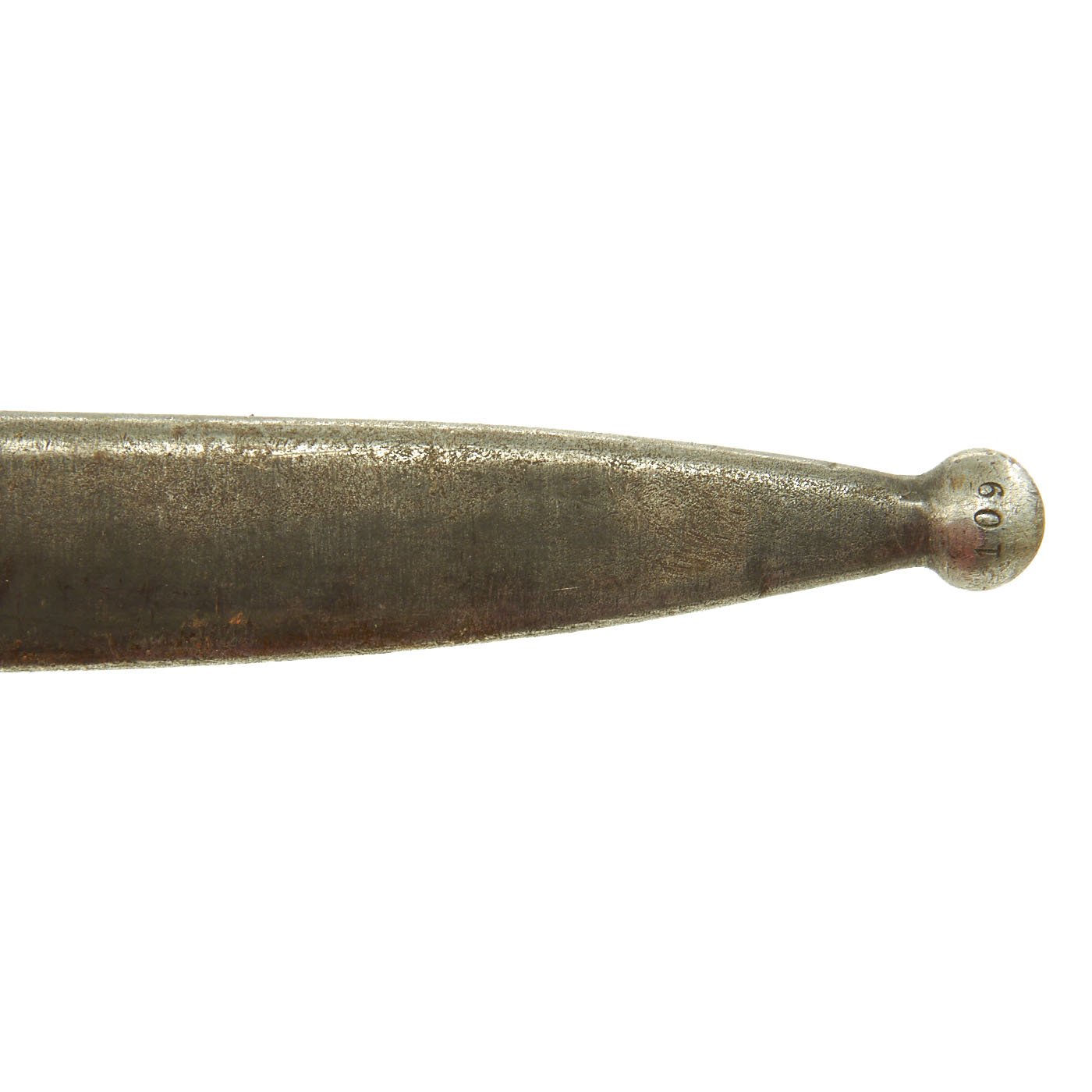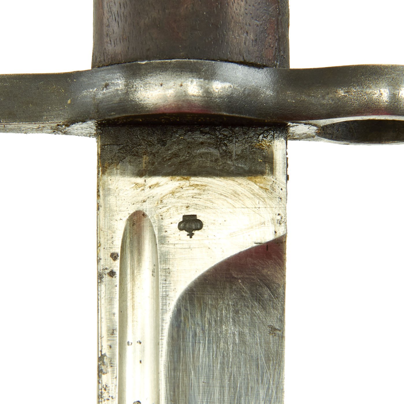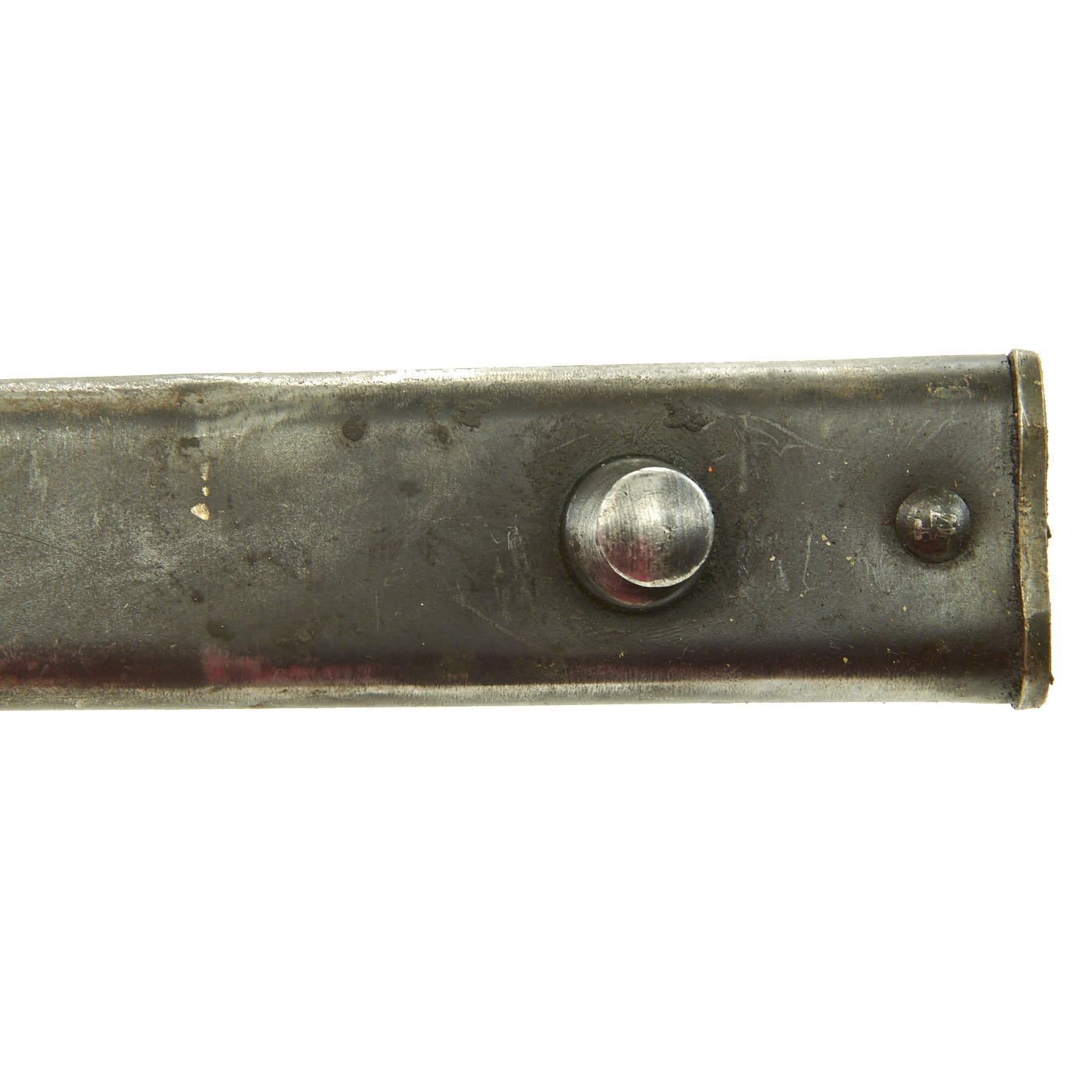 Overall condition is very nice, with just a bit of staining and peppering on the blade. The cross guard with muzzle ring and curved pommel with spring catch are in similar very good condition. The wood grips are solid and secured by the correct screws. The odd hilt design gives away that this is a bayonet designed for a rifle that wasn't originally designed to mount a bayonet. In 1914, M1894 Carbines were altered by the addition of a nose cap that incorporated a bayonet mount. There are dents and wear in the scabbard body as shown, but they do not interfere with the fit of the scabbard.