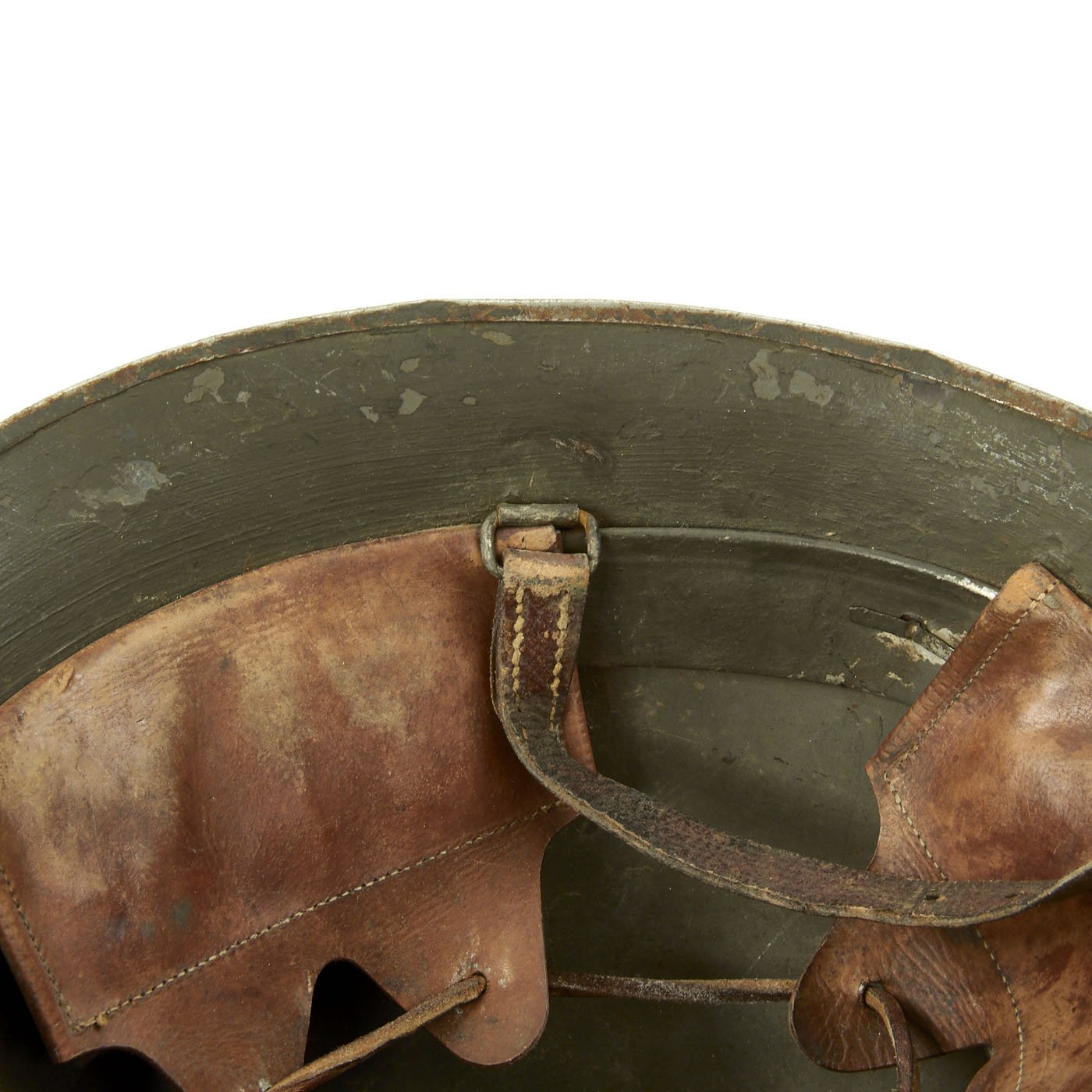The skull has a slight rib or brim running from the nape of the neck to just above the steel helmet plate. The steel badge on front has three raised crowns and worn blue and yellow decals to each side also showing the three crowns. The early style three pad leather liner comes with a full adjustable leather chinstrap.