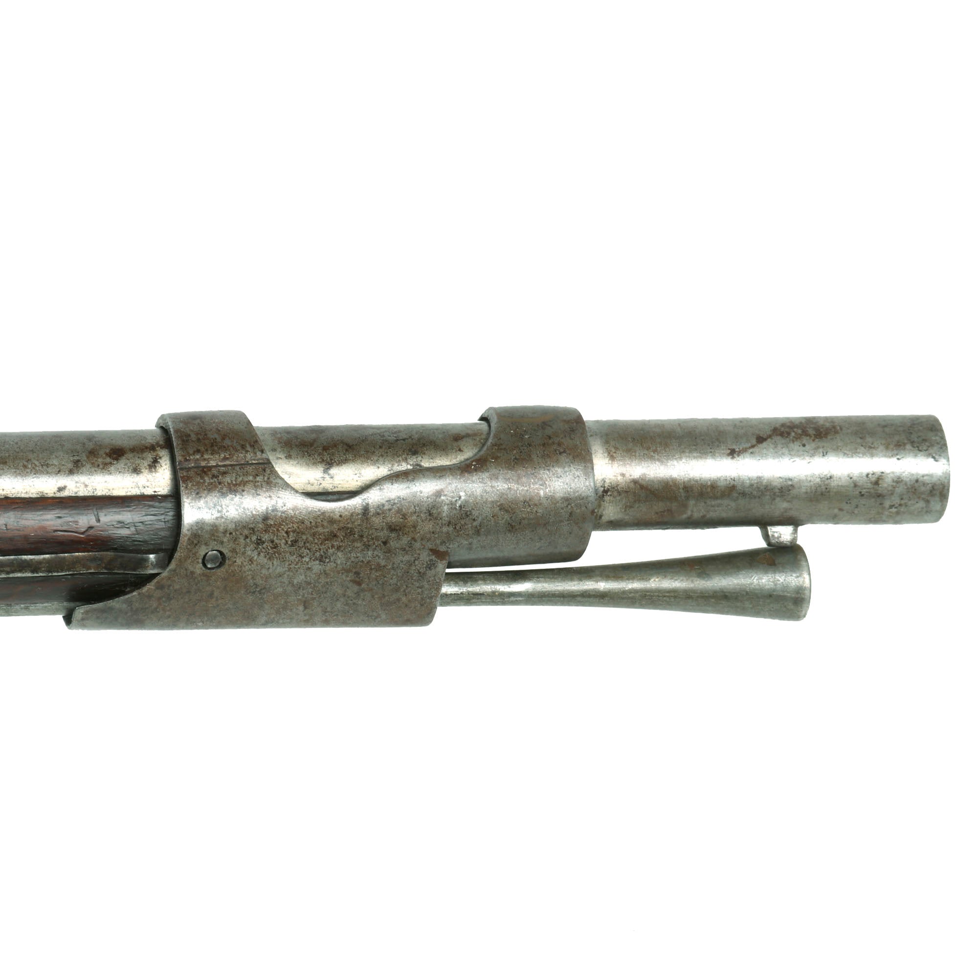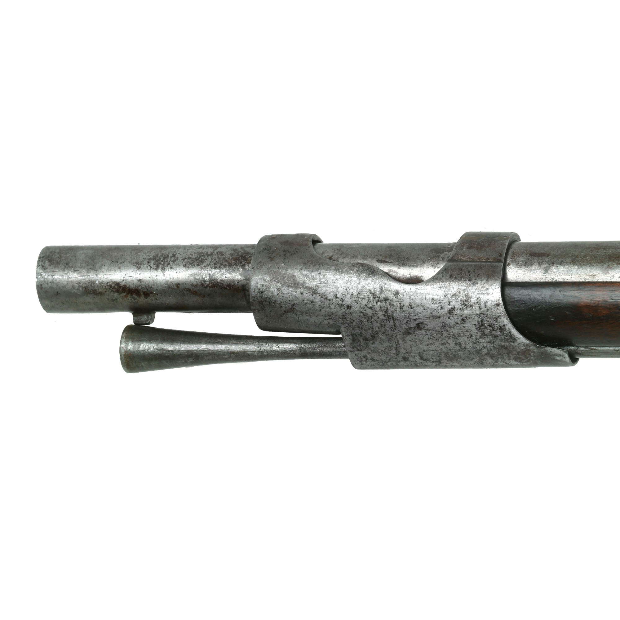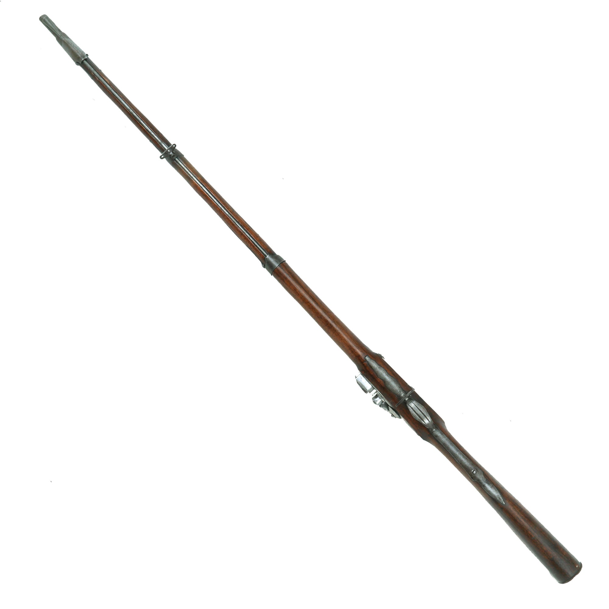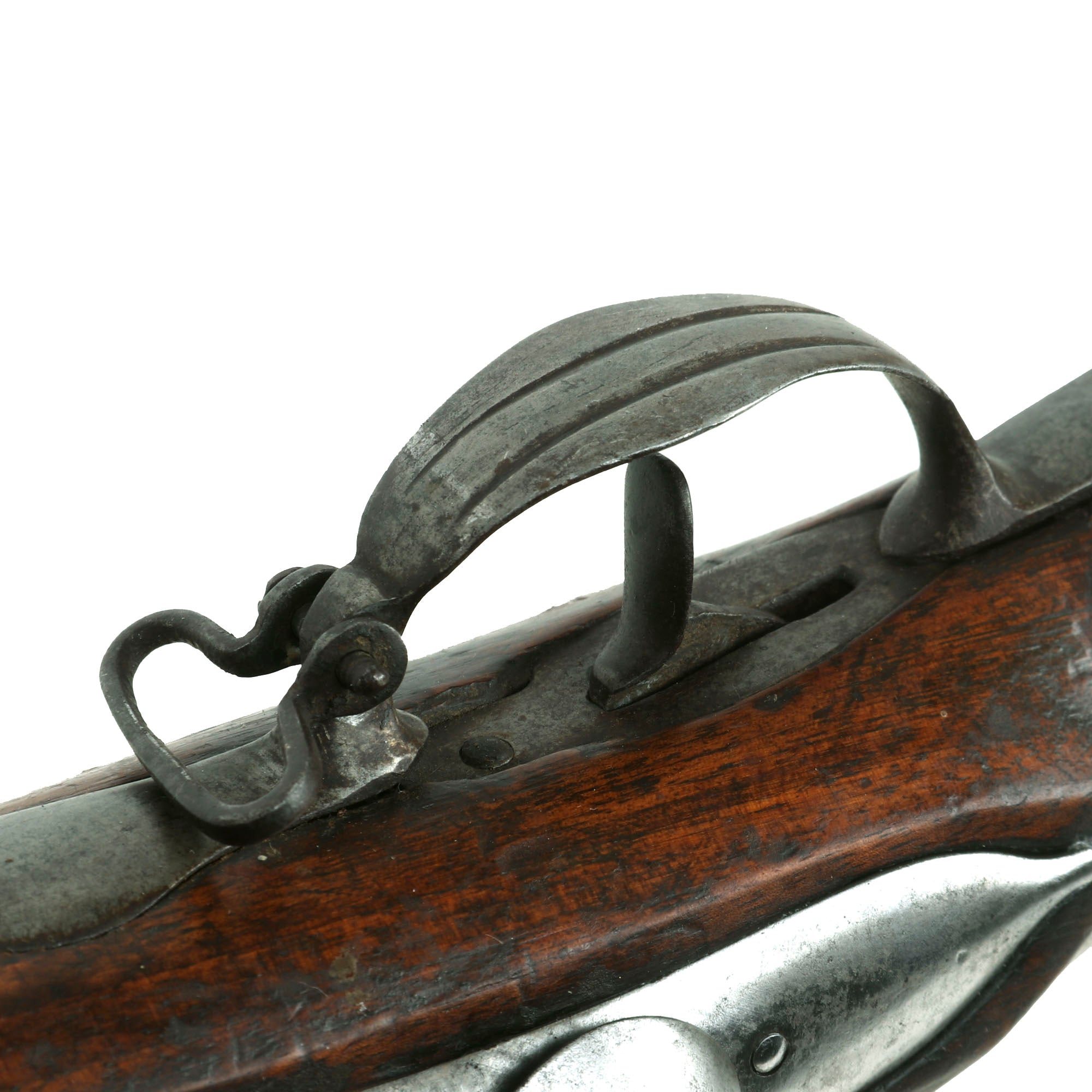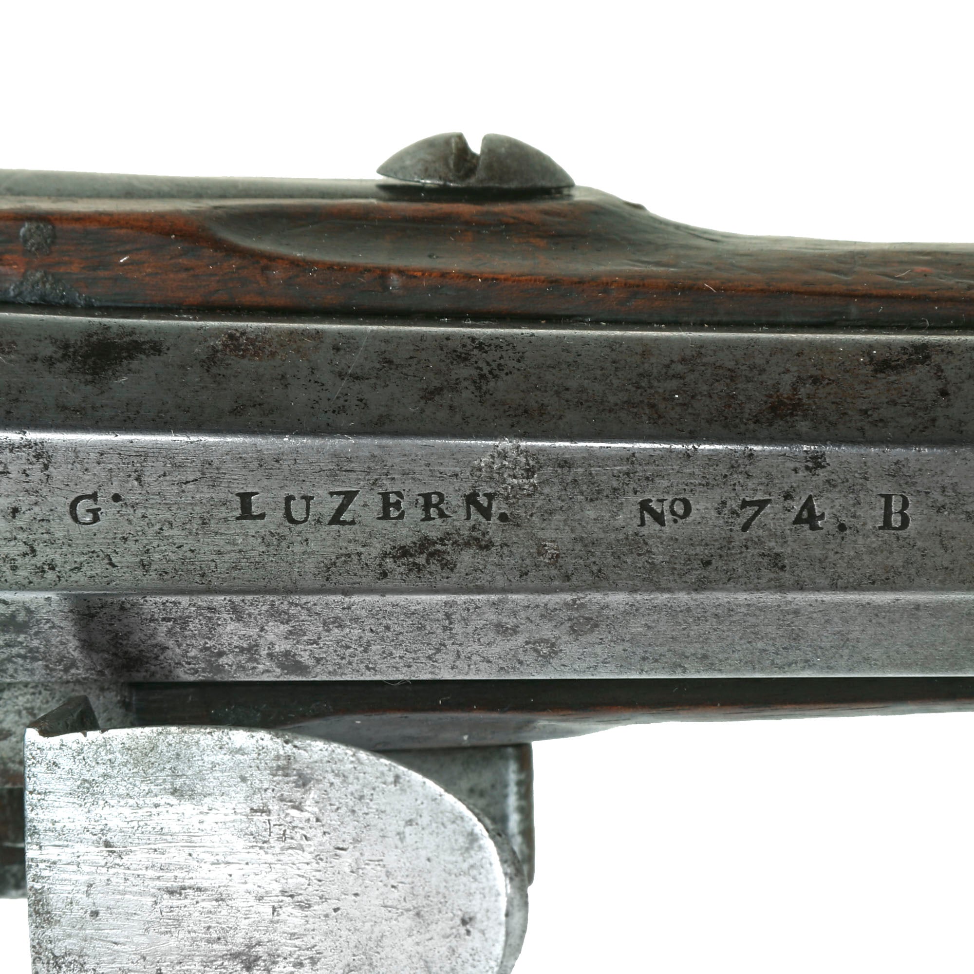 This indicates it was in the stocks of the Swiss canton of Luzern (Lucerne), located in central Switzerland. This example is quite similar to another example we have seen, which was serial 700. This example however has a rounded side plate, and an octagonal barrel. As with the other example, it is all steel mounted, with a double strap nose cap, and spring retained solid barrel bands, somewhat similar to French muskets of the time. It has a lovely cheek rest cut into the left side of the stock. Condition is very good overall, with a lovely patina of age. Both sling swivels are still present, as is the ramrod, and and the lock is still functional, though it does not hold at half cock. The stock is lovely, showing no major damage.