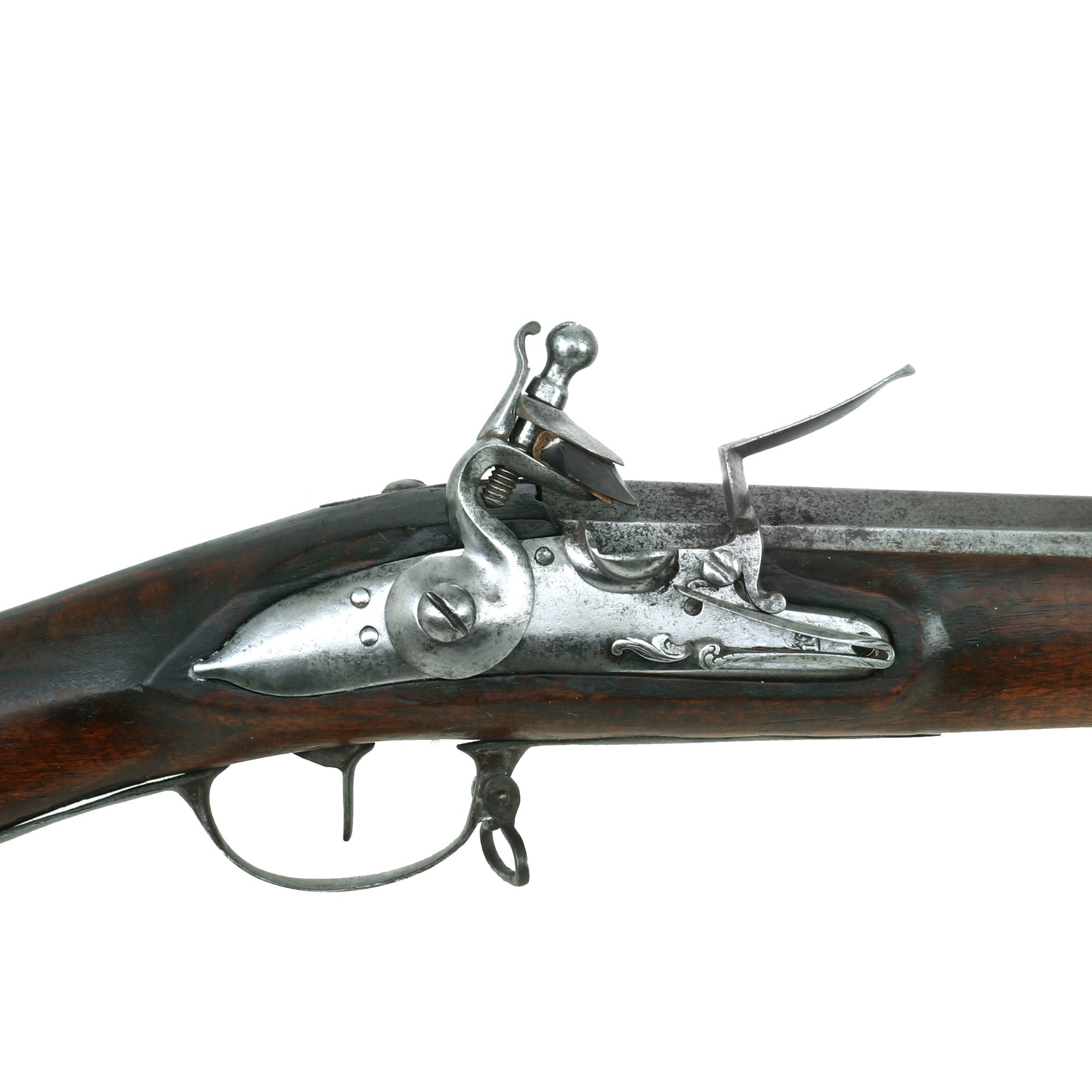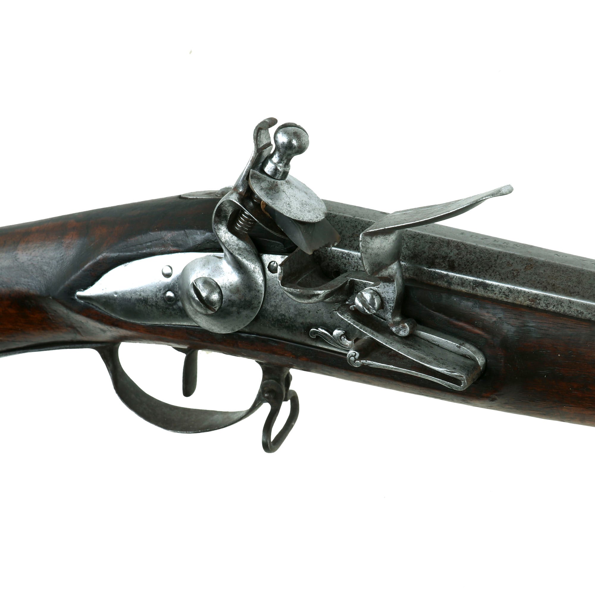 This example is very similar to other examples that we have seen, and looks to be of Swiss manufacture. It measures 56 3/4 inches in overall length, with a two stage part octagon 41 3/4 inch barrel in .69" caliber, correct for this type of musket. The only marking on the entire musket is on the top flat of the barrel, which reads: