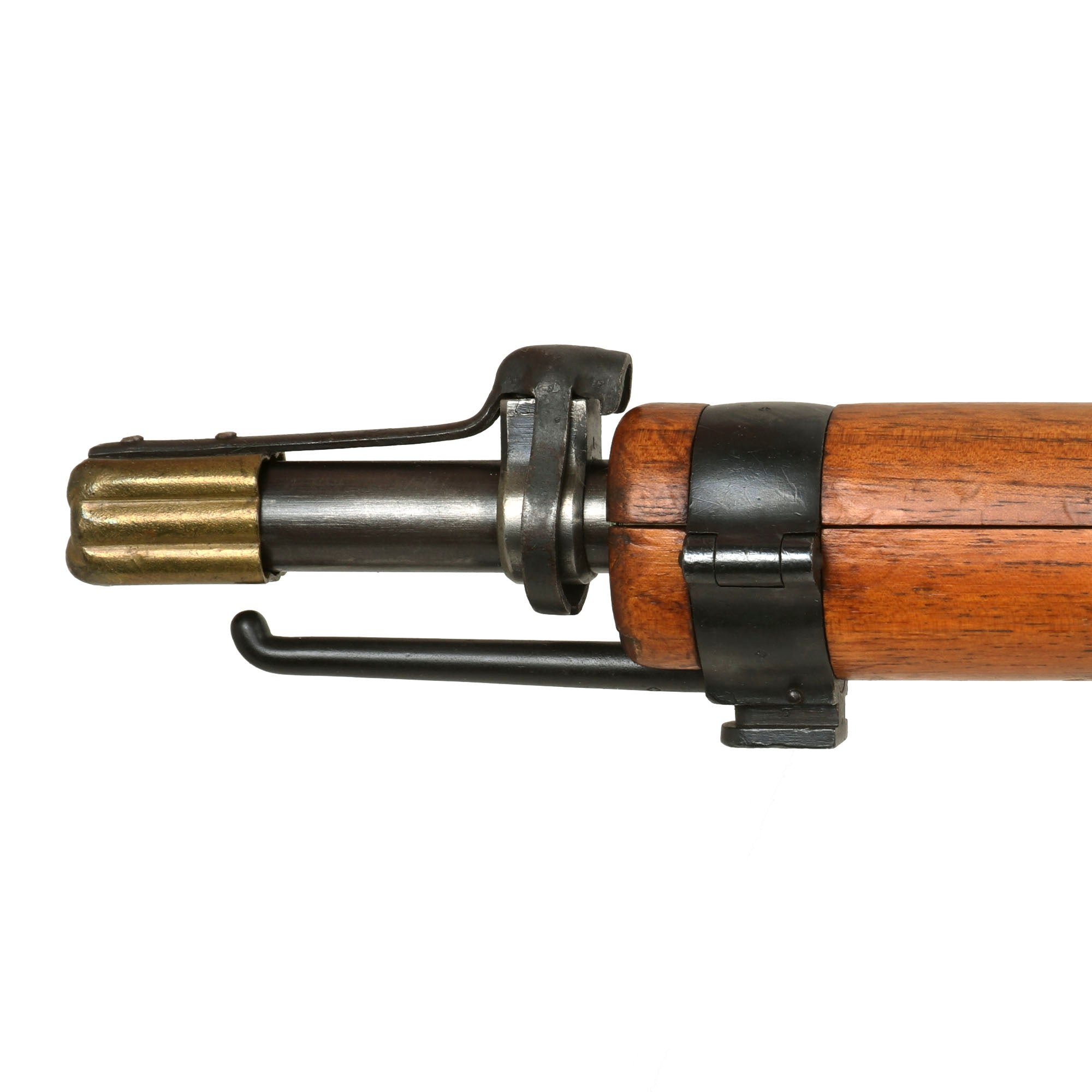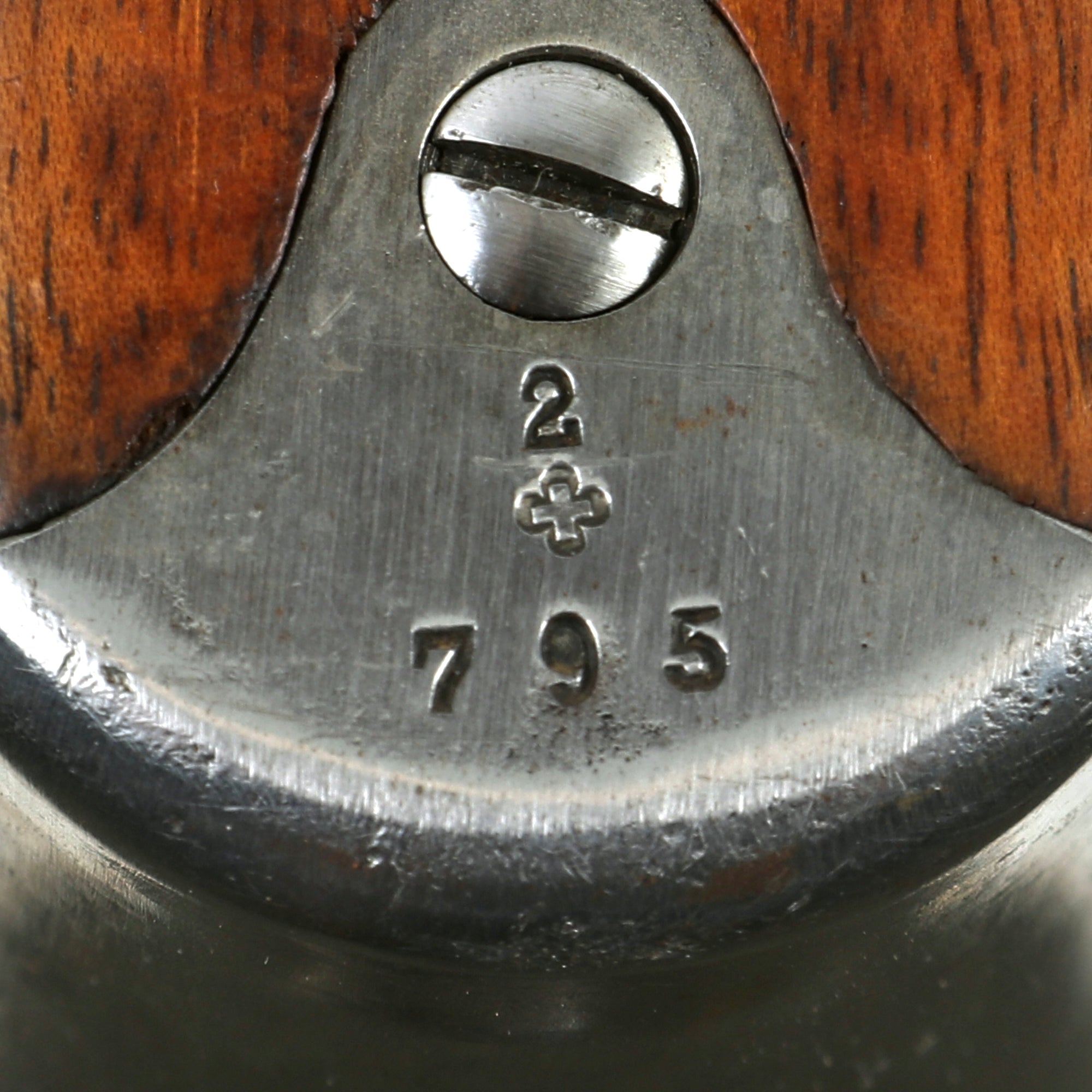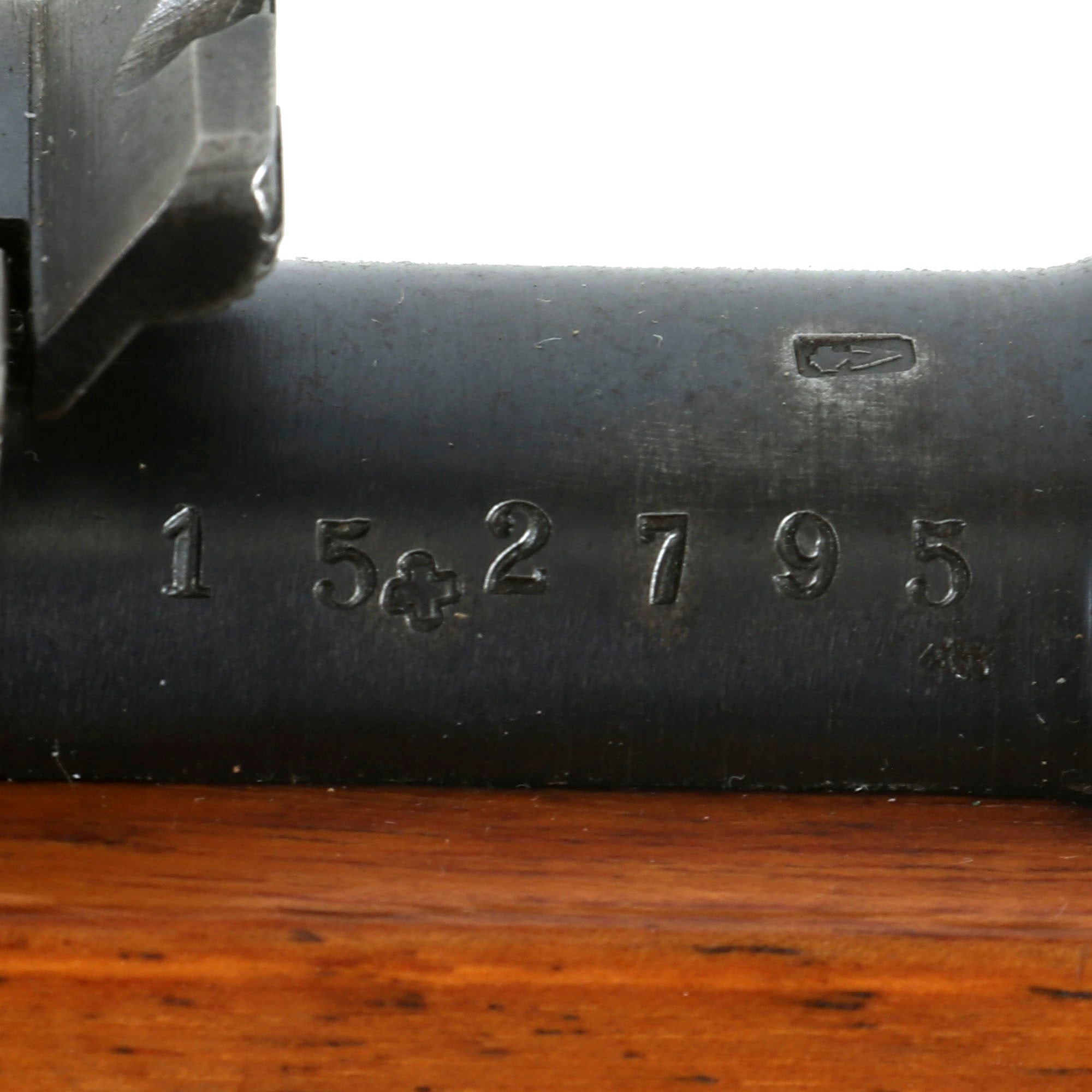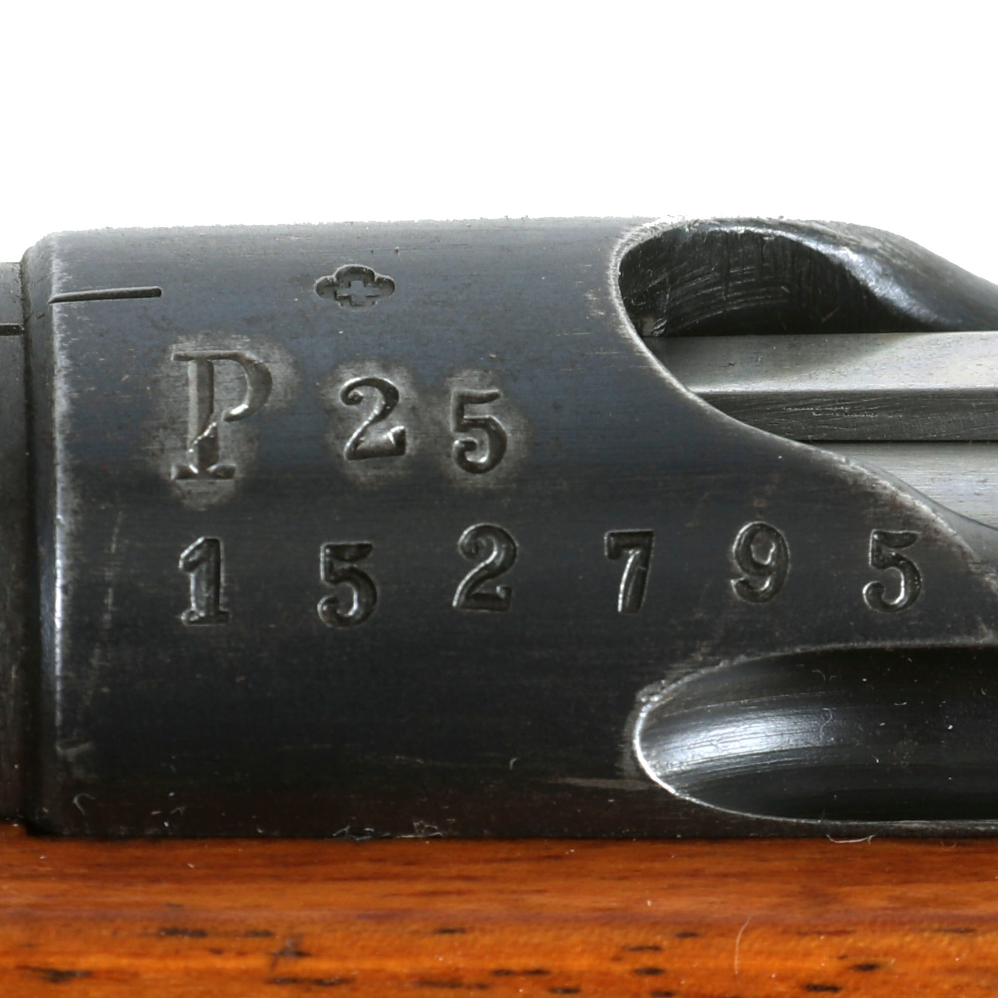 This example is in excellent condition, with a great look, showing signs of only age and light use. Serial number 152795 is present on all components of the rifle including the bolt & magazine, with shortened number 795 even being stamped on all parts of the rear sight and several other components including the butt plate. Some parts, such as barrel bands, do not usually have serial number markings. We would consider this to be an "ALL MATCHING" example and it's a great one! There is a P 25 stamped on top of the reciever, a marking that we do not understand. It even comes complete with an original brass and steel muzzle cover, and features a lovely untouched stock crisp cartouches.