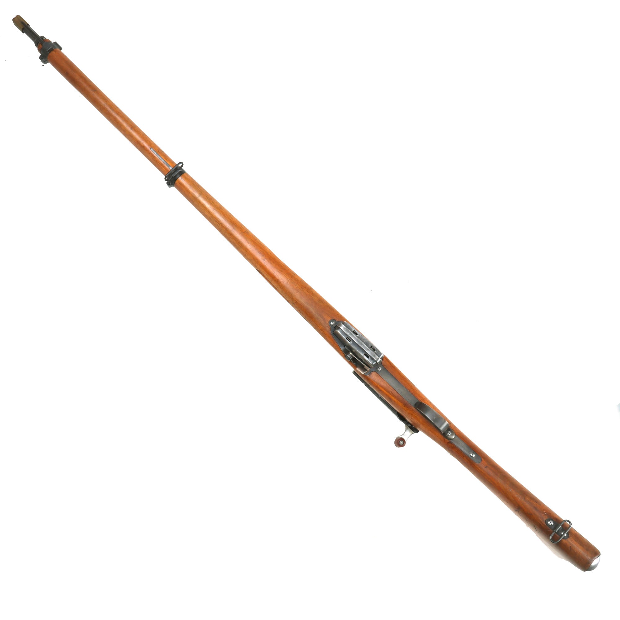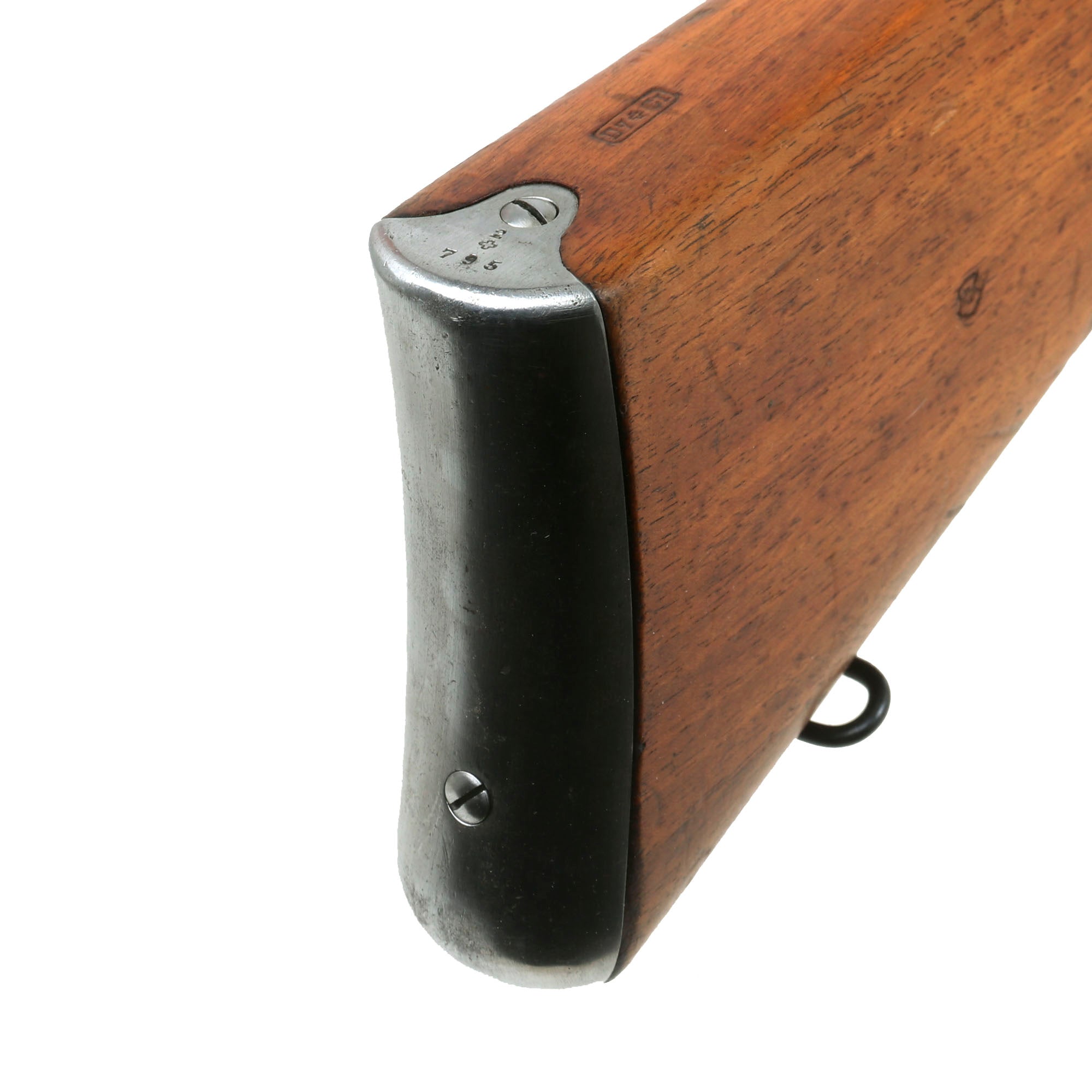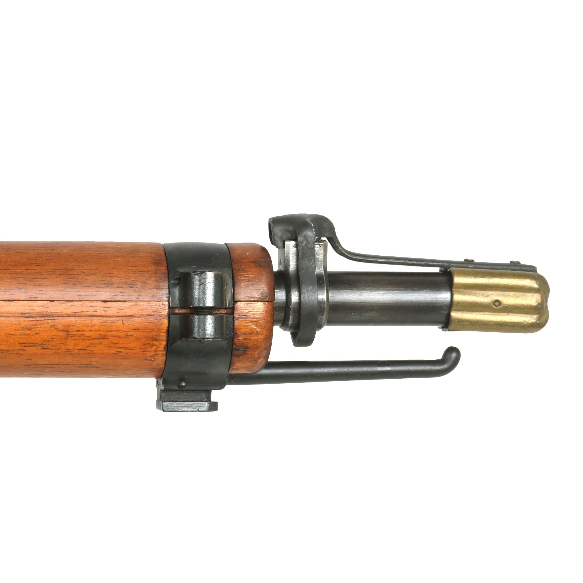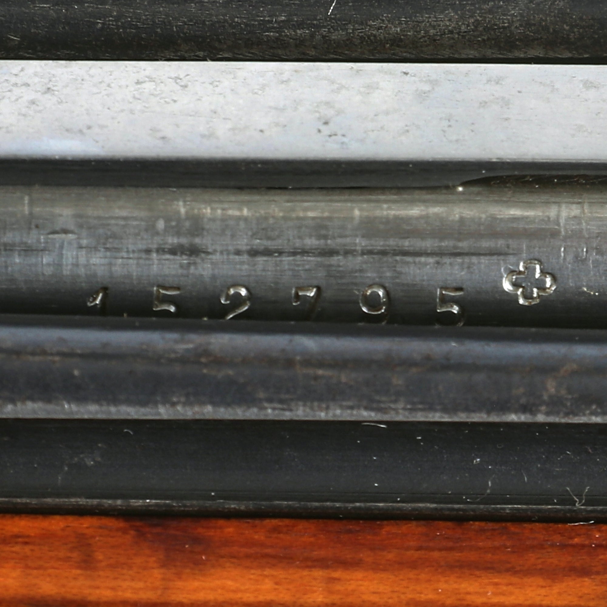 This example is in excellent condition, with a great look, showing signs of only age and light use. Serial number 152795 is present on all components of the rifle including the bolt & magazine, with shortened number 795 even being stamped on all parts of the rear sight and several other components including the butt plate. Some parts, such as barrel bands, do not usually have serial number markings. We would consider this to be an "ALL MATCHING" example and it's a great one! There is a P 25 stamped on top of the reciever, a marking that we do not understand. It even comes complete with an original brass and steel muzzle cover, and features a lovely untouched stock crisp cartouches.