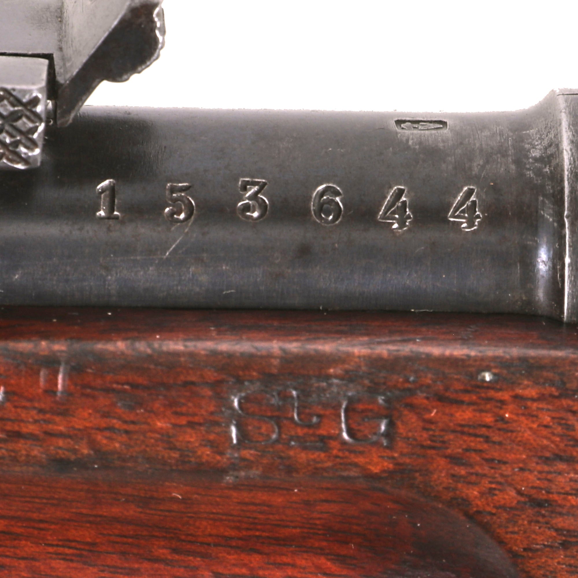 This example is in very good condition, with a great lightly used look, and a fantastic bore. It does not appear to have been arsenal reconditioned at any time, so this looks to be all original wear, and the stock still has its original oil finish. Serial number 153644 is present on all components of the rifle including the bolt & magazine, with shortened number 644 even being stamped on all parts of the rear sight and several other components including the butt plate. Some parts, such as barrel bands, do not usually have serial number markings. We would consider this to be an "ALL MATCHING" example and it's a great one!