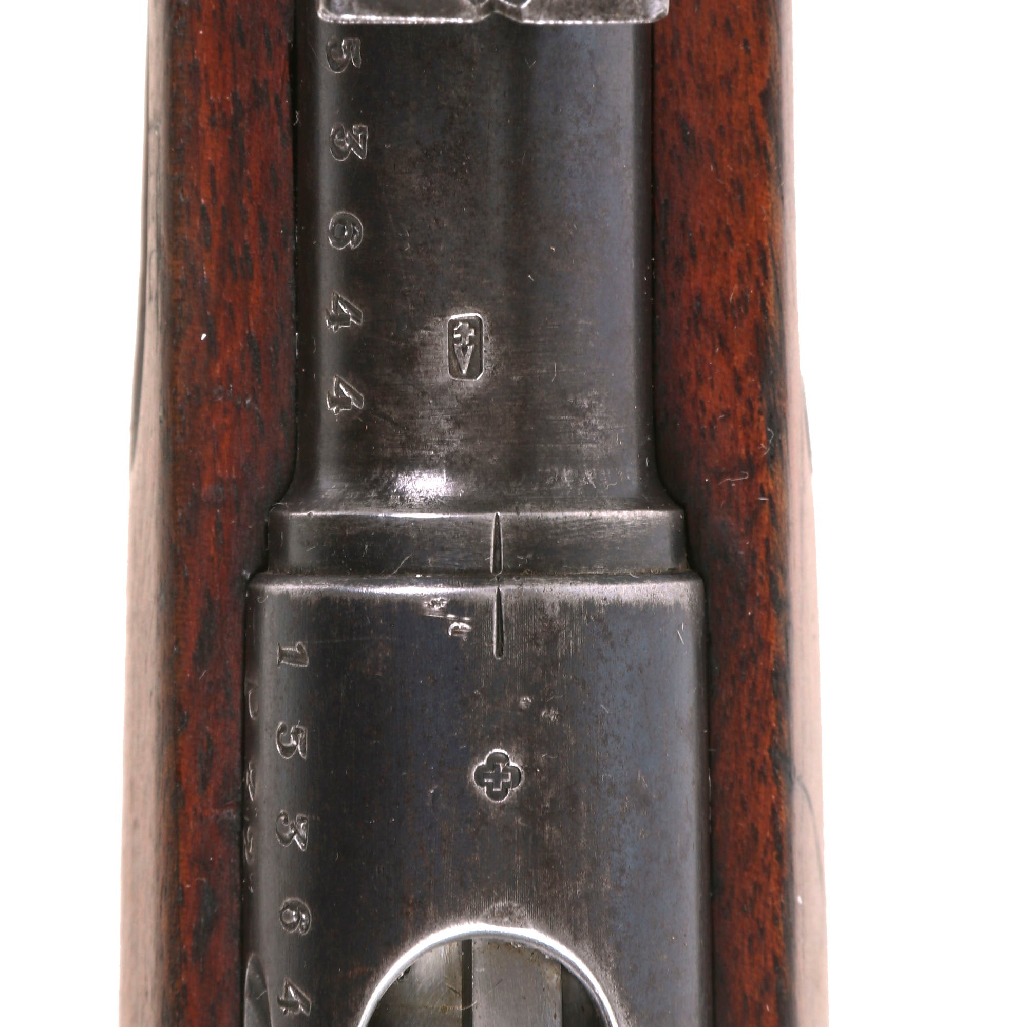 There are multiple Swiss Cross proof marks on the metal components of a gun, which are in very good condition, displaying a lovely warn patina, with many areas still displaying much of the original blued finish. The bolt is still bright steel, with just a bit of light staining, and the red fiber bolt handle is in great shape, with no cracks or chips we can see.