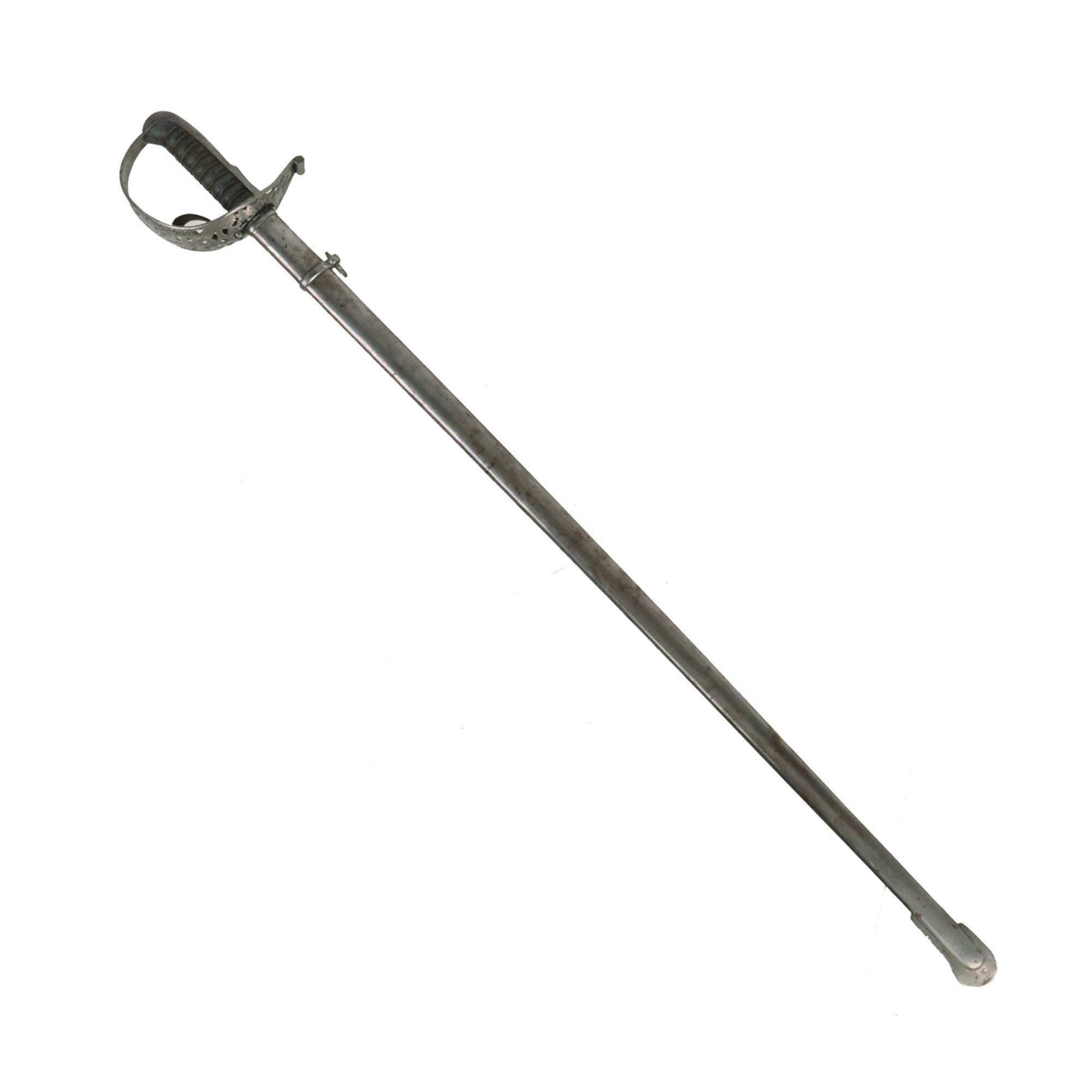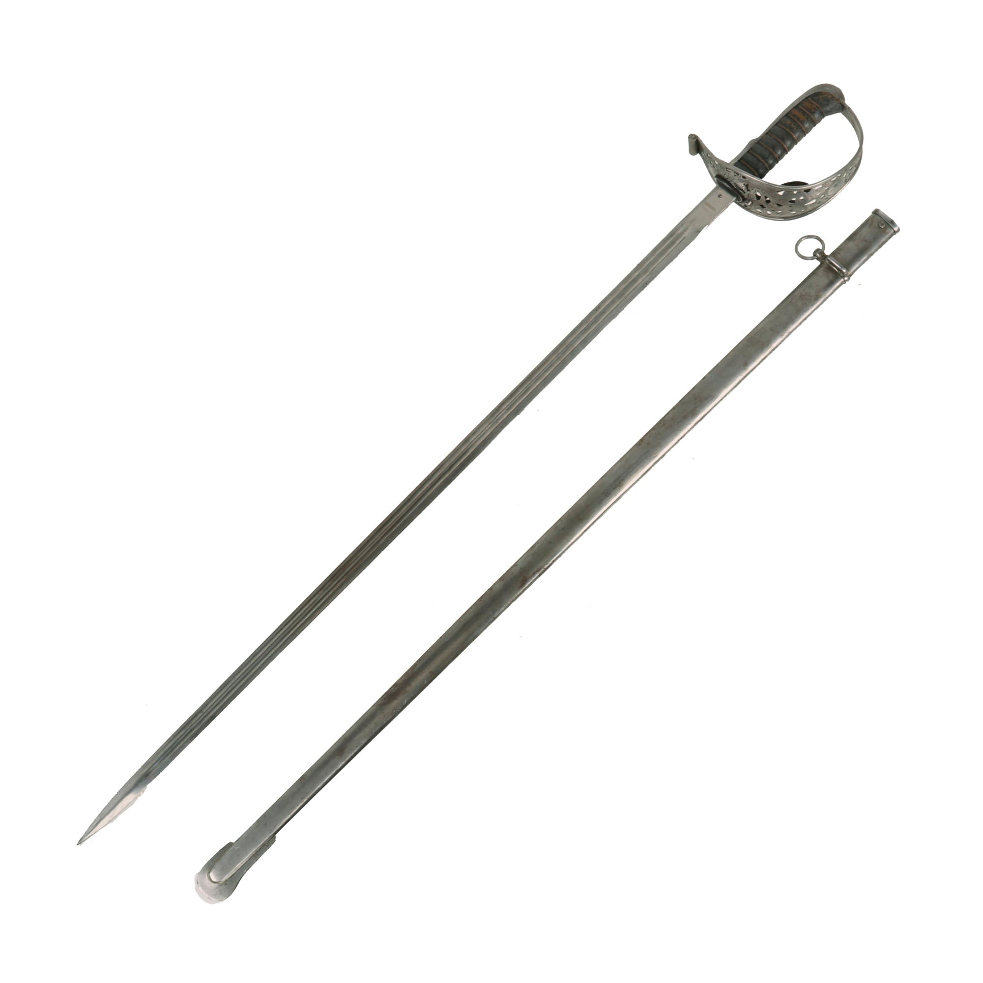 Original item: Only One available. This is a textbook example of a Swiss Model 1899 Officer's sword, made domestically at the Swiss weapons factory in Neuhausen. The sword comes complete with its scabbard. Unlike other examples we have had before, this is not a nickel plated dress sword, but a real Government issued example for real service. The blade, handle, and scabbard are all bright steel, showing wear from use and service.