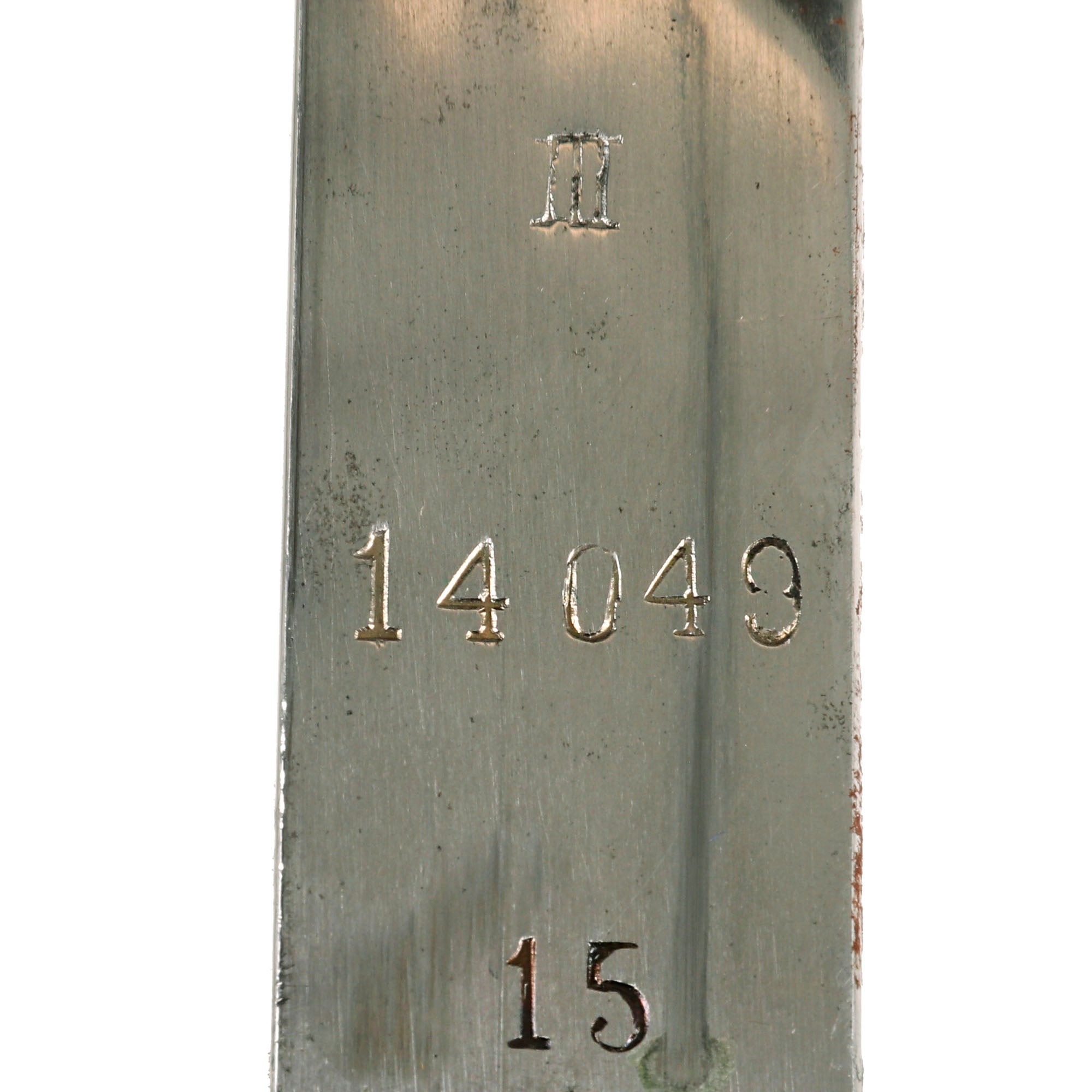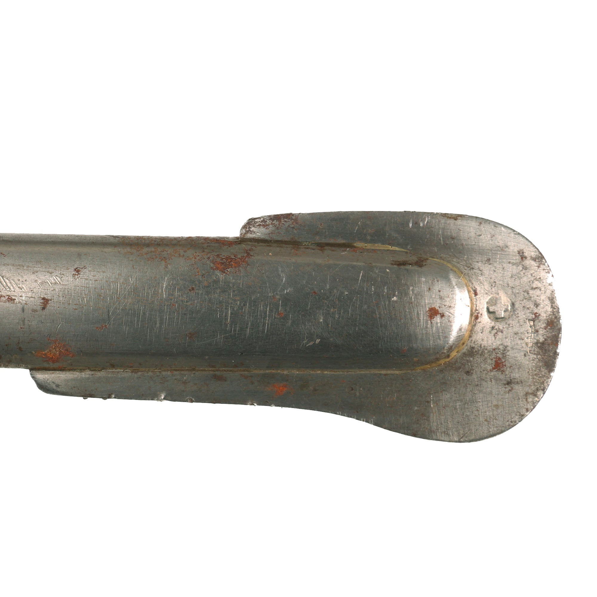 Condition is very good, showing the usual wear and tear from service, and it now shows a lovely polished steel look overall. The blade is in very good shape, and shows denting and bending on the edge, but no major chips or nicks. The scabbard is still mostly straight, showing just a bit of waviness, and the hanger loop is still present.