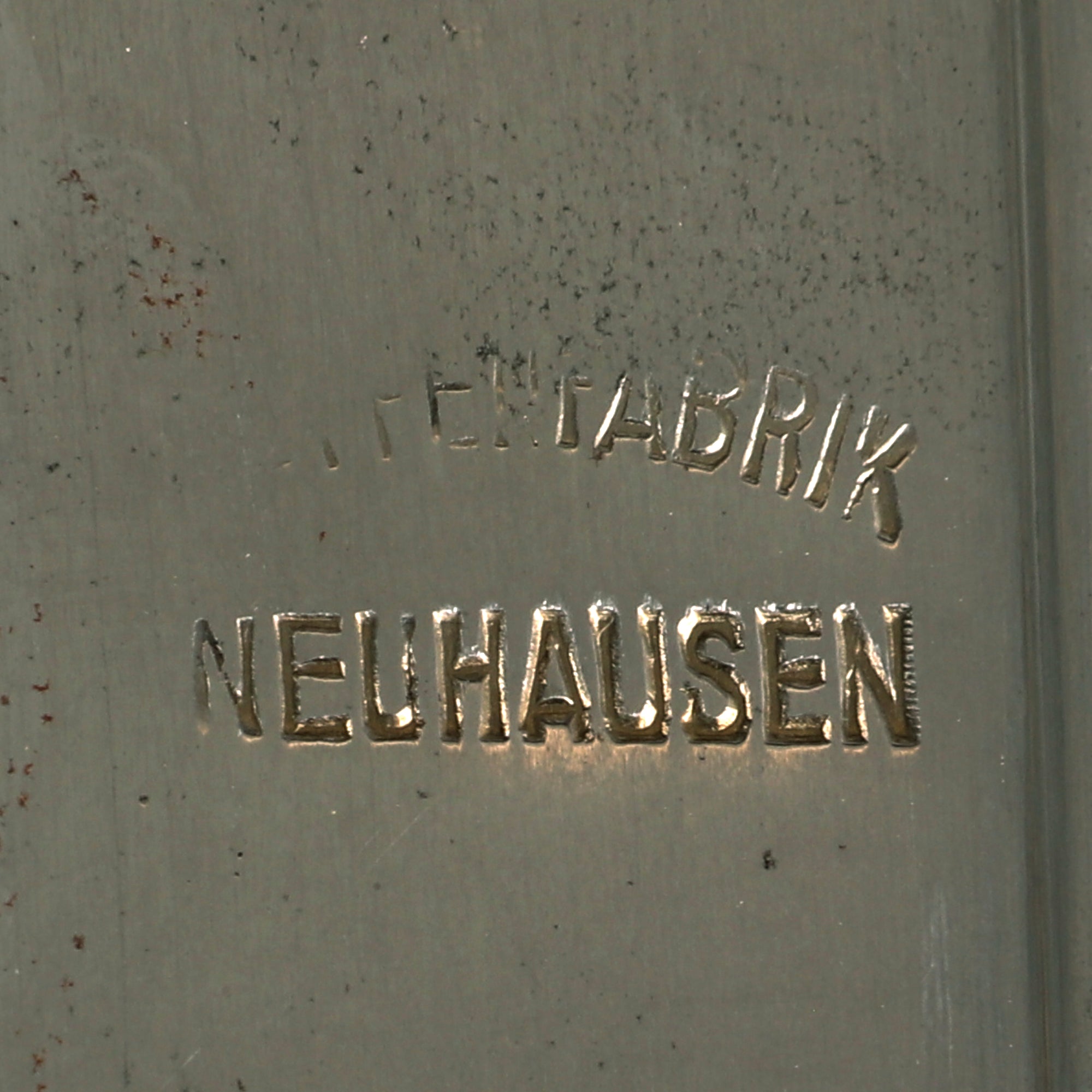 The name simply translates to "Weapons Factory Neuhausen," which was one of the primary edged weapon suppliers in the first half of the 20th century. Below this is a Swiss "Geneva" cross proof mark in a circle, while the opposite ricasso is marked with serial number 14049.