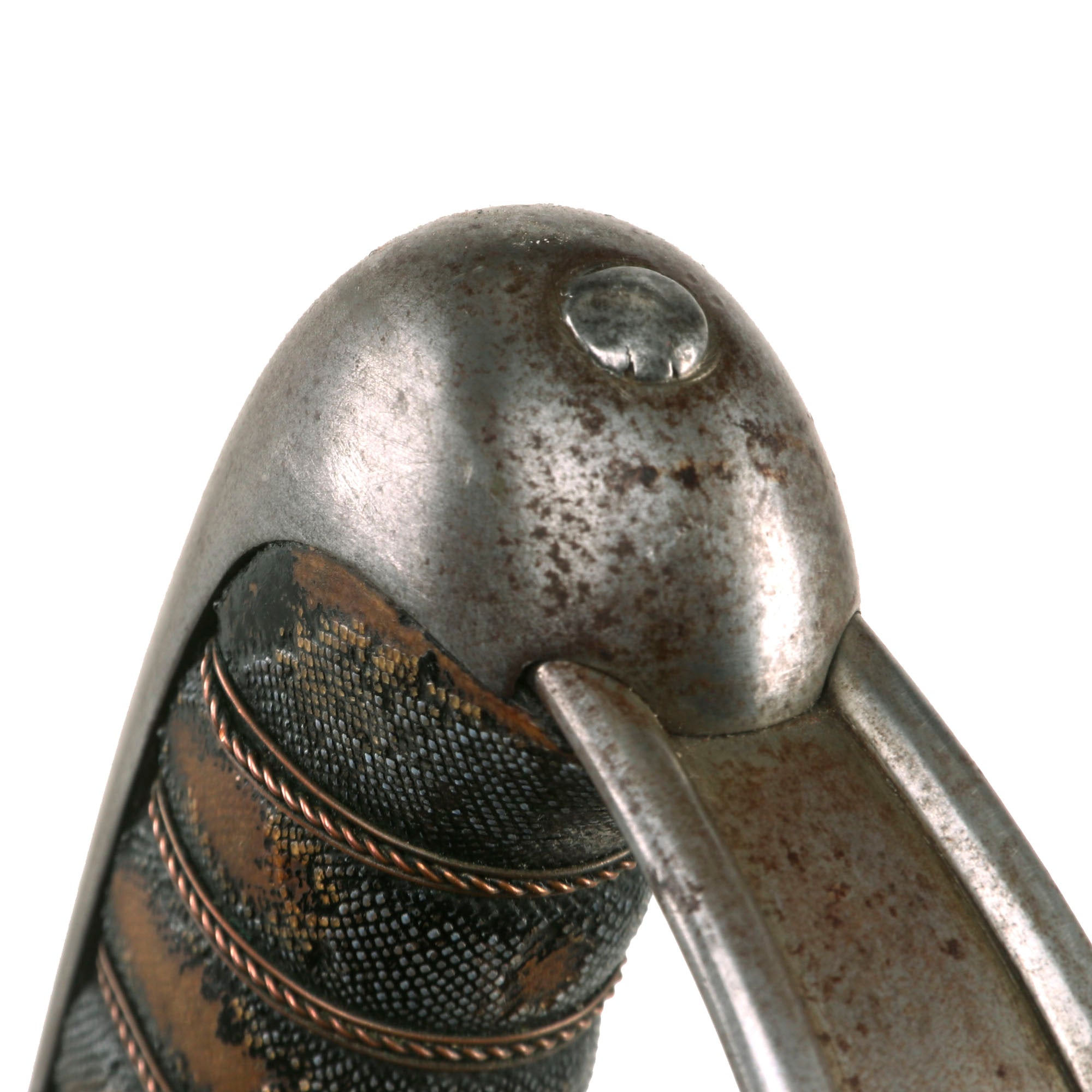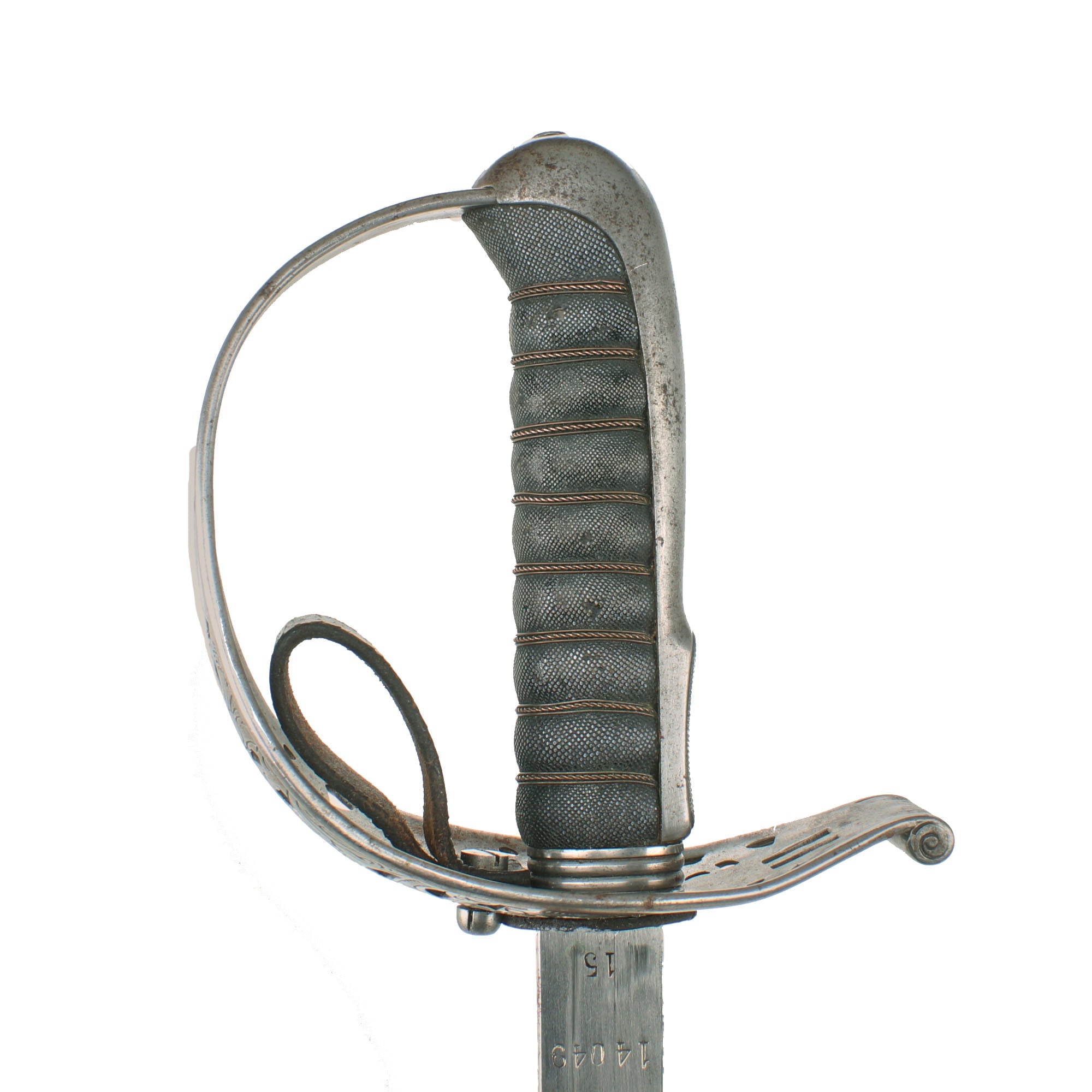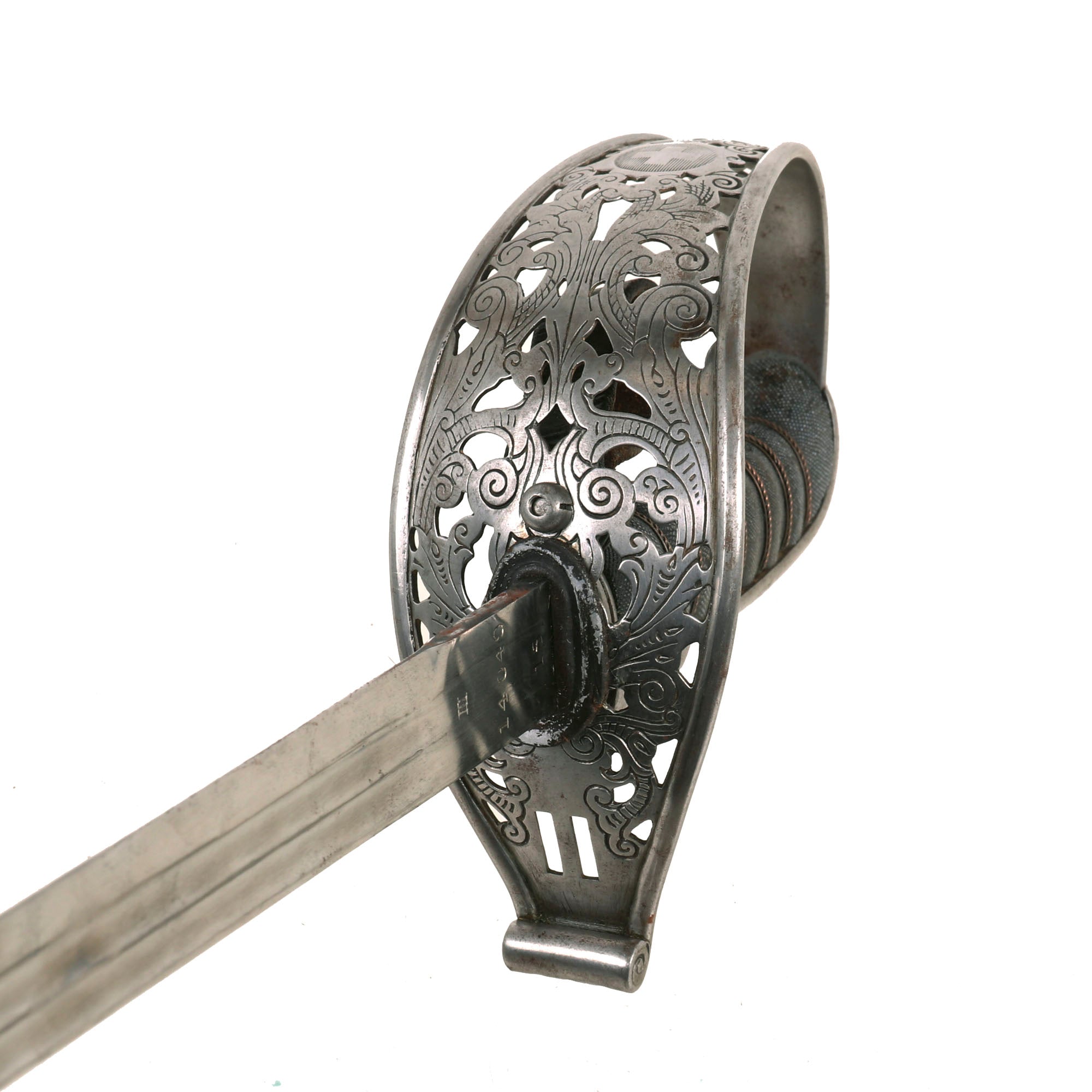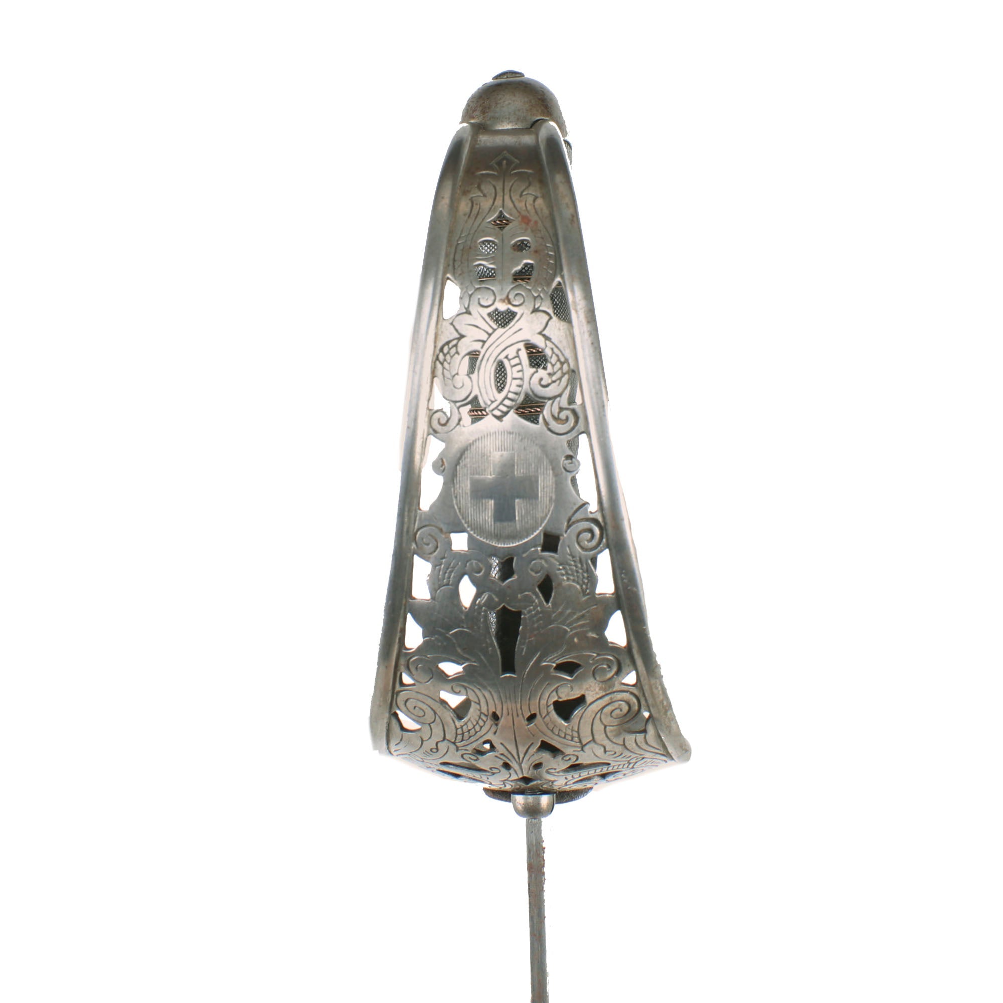 The grip is wire wrapped sharkskin shagreen, and in form the sword is quite similar to other officer's swords used around the world at the time. The grip has four wire wrapping, with the center pair being twisted. The steel handguard is symmetrical, and somewhat narrower than we see on those from other countries, and can have a leather finger loop on the interior. It is perforated and decorated with floral designs showing the Swiss "Geneva Cross" in the middle of the guard. The scabbard is fairly standard, with a single hanger ring and the rectangular loop on the rear for a belt hook.