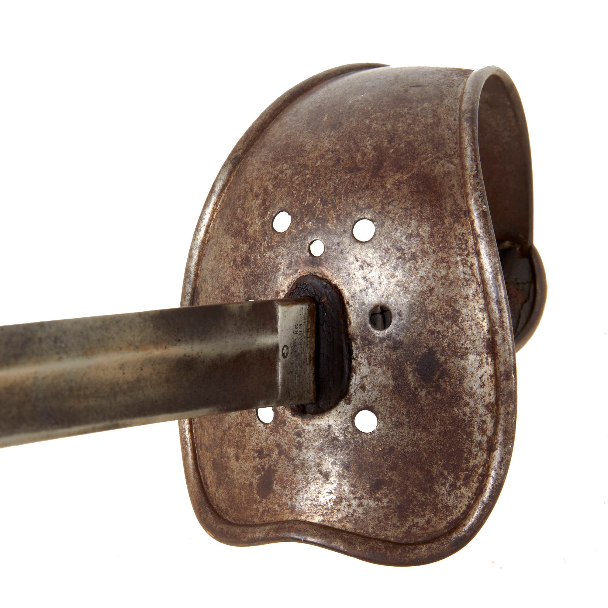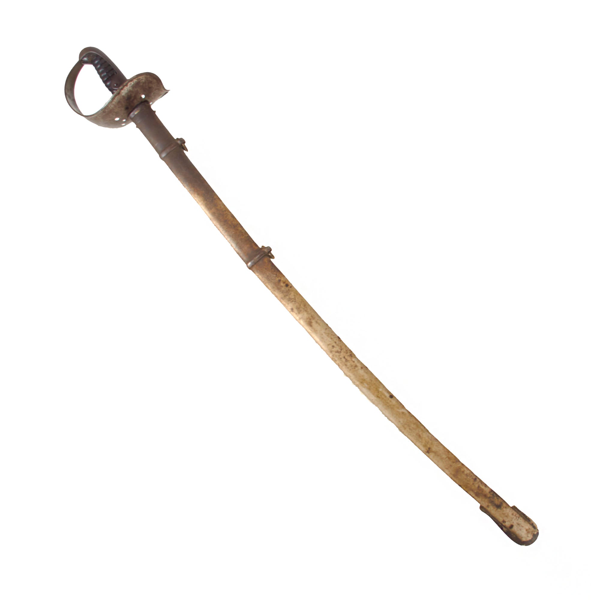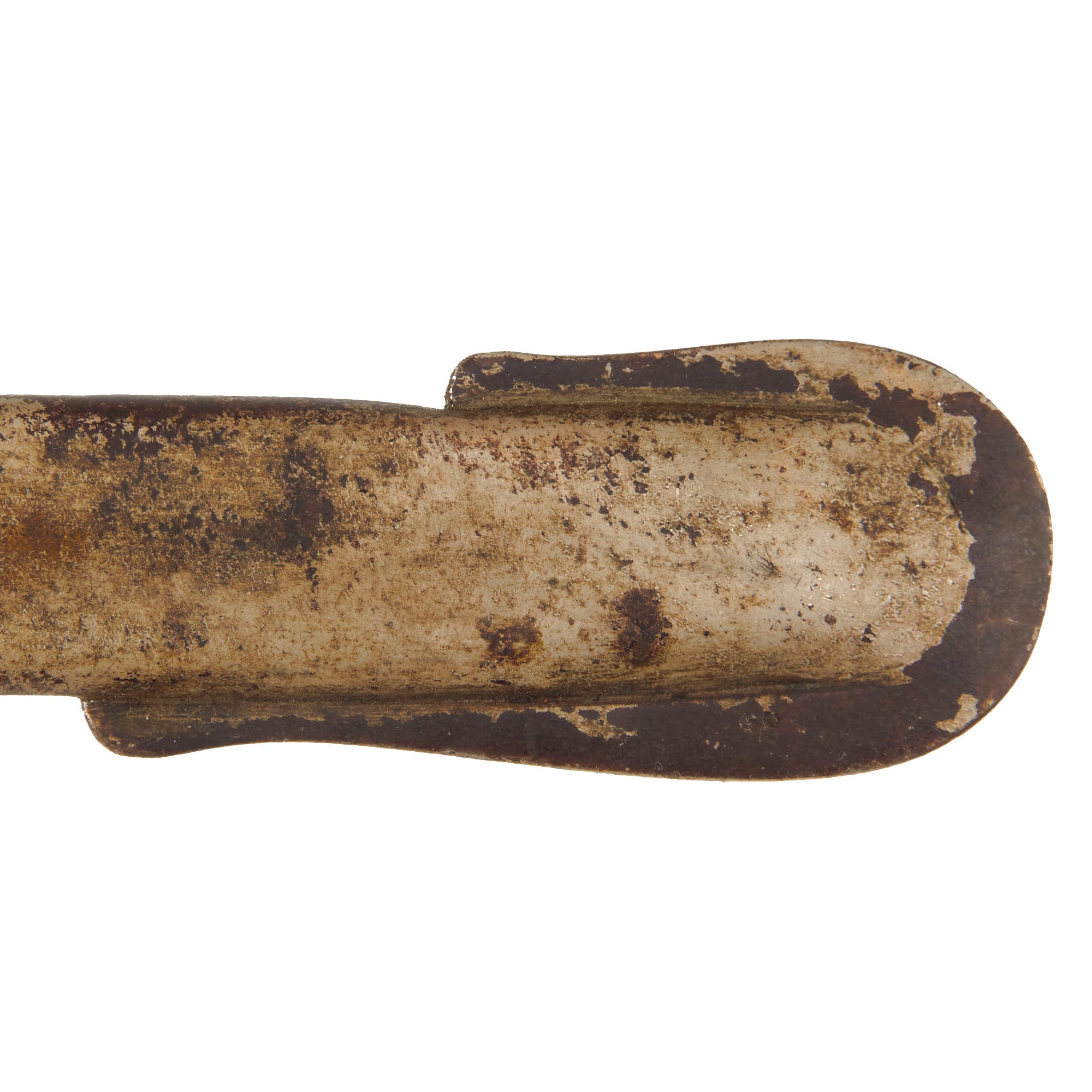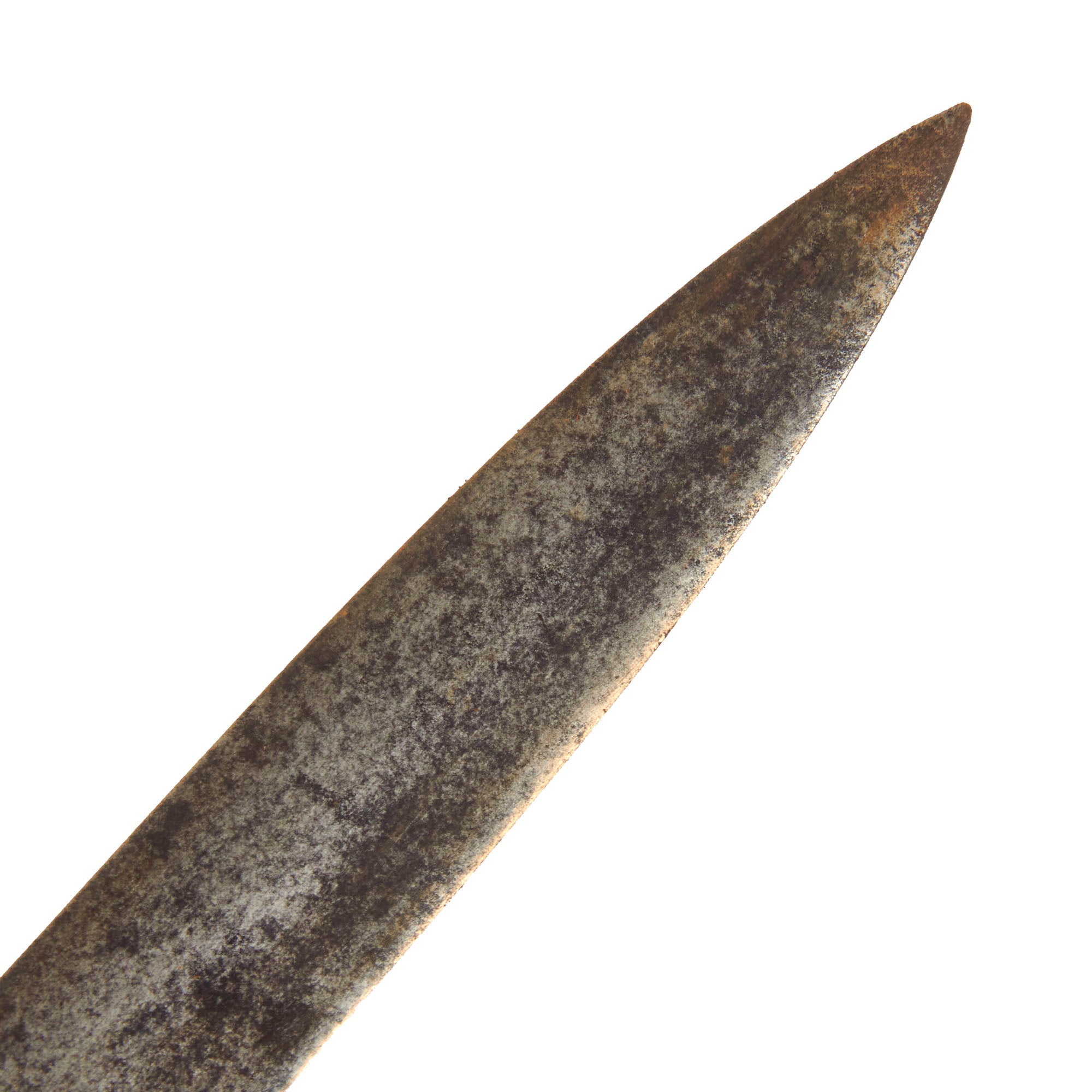 The blade is very nice, with good age and patina overall. The leather blade buffer is retained, rare to see. The exposed metal areas, original bright steel, now have a dark patina, with areas of surface rust as well as dirt. The wooden handle has cracked through, and some leather pieces are missing. The blade, protected by the scabbard, still retains much of the original bright finish, with small areas of staining. The scabbard, aside from the patination, is in a heavily worn condition with heavy oxidation, denting, and some small holes in the metal.