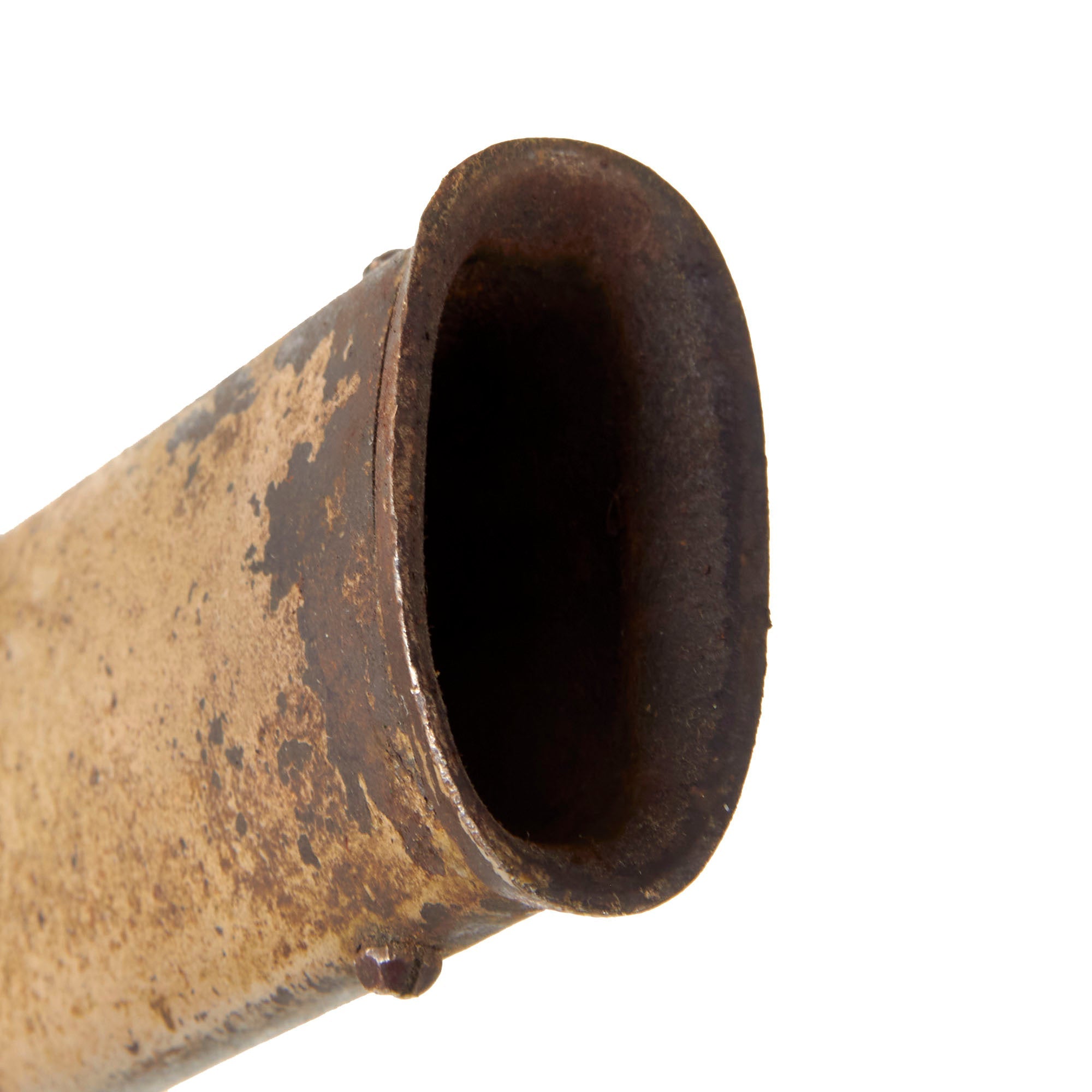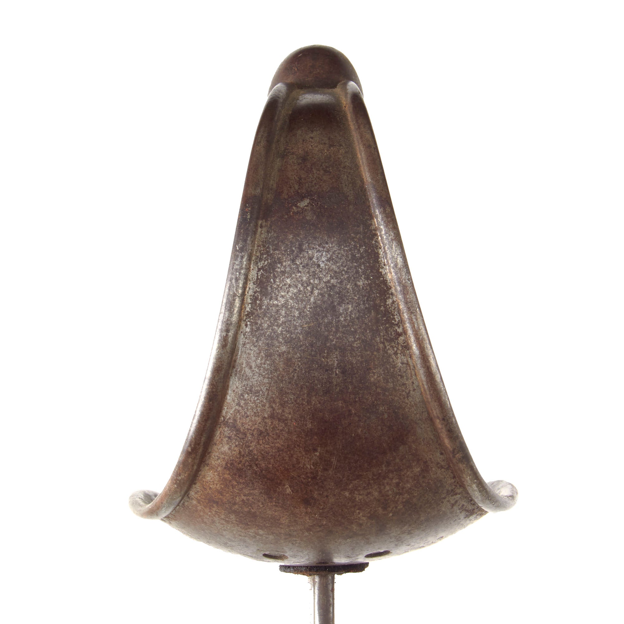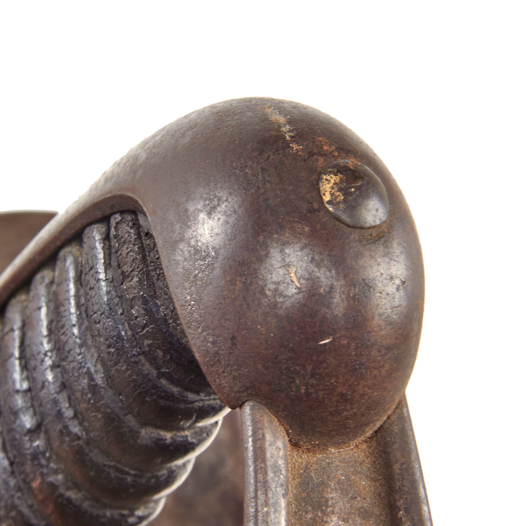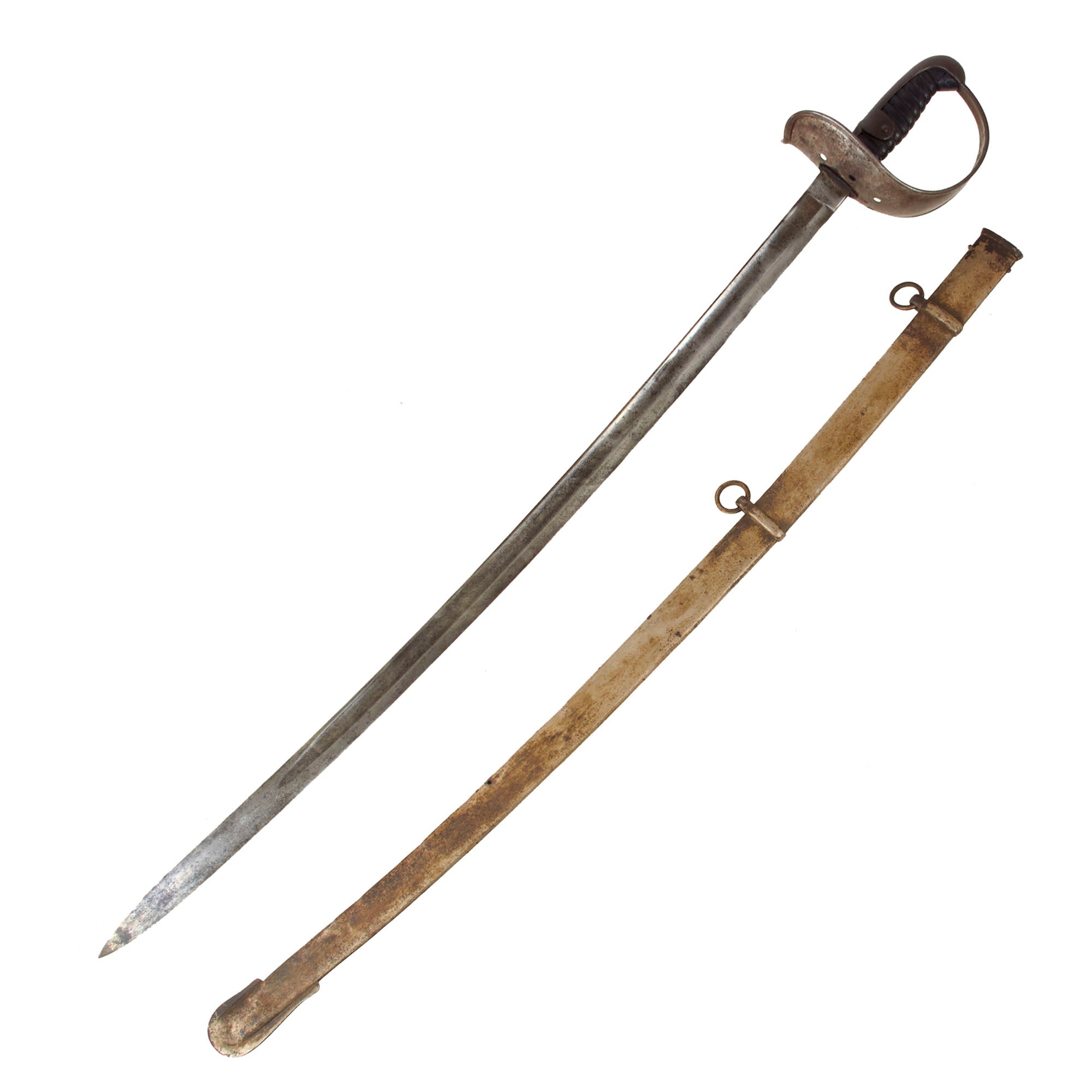 The blade is very nice, with good age and patina overall. The leather blade buffer is retained, rare to see. The exposed metal areas, original bright steel, now have a dark patina, with areas of surface rust as well as dirt. The wooden handle has cracked through, and some leather pieces are missing. The blade, protected by the scabbard, still retains much of the original bright finish, with small areas of staining. The scabbard, aside from the patination, is in a heavily worn condition with heavy oxidation, denting, and some small holes in the metal.