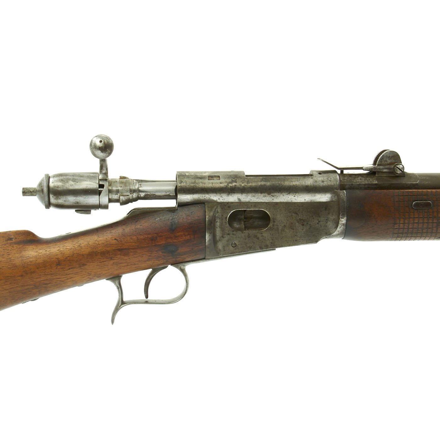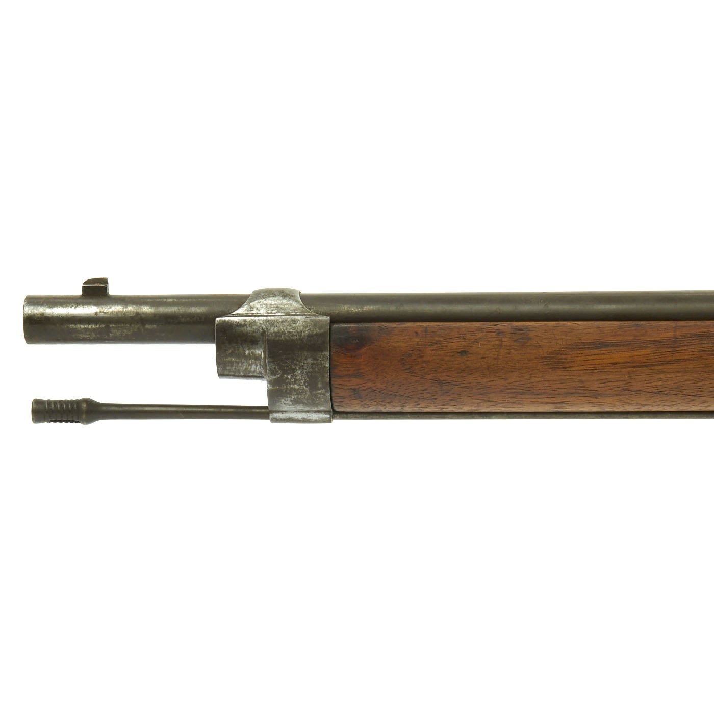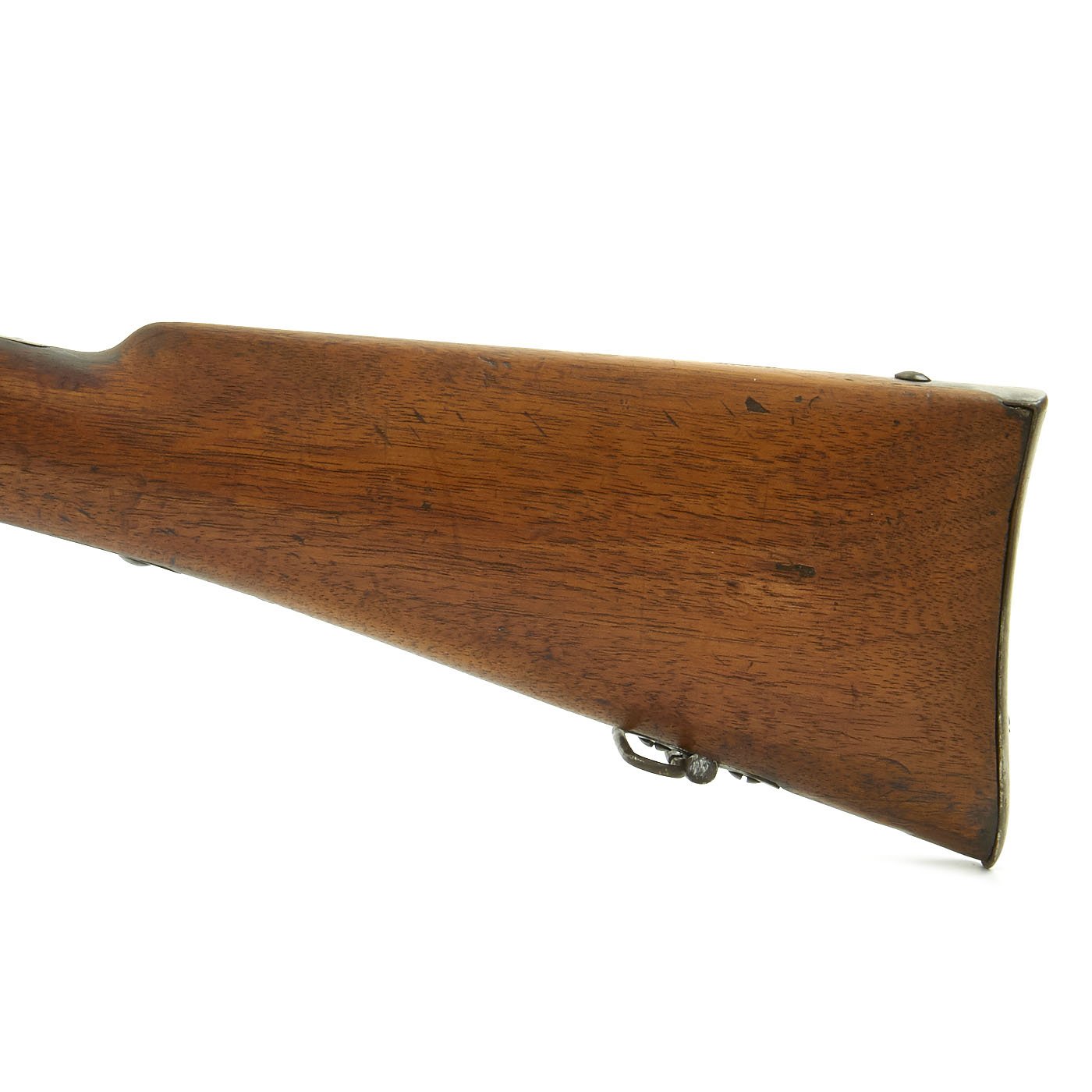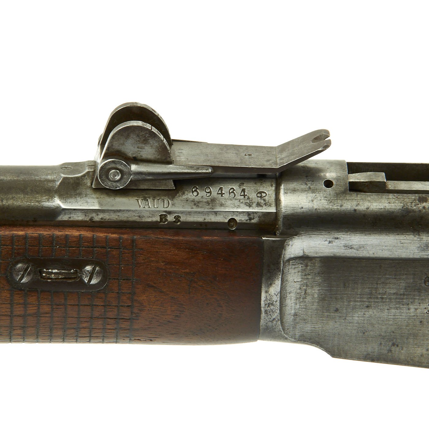 Offered in very good condition, this was a rifle serving at the time of Britain's legendary Martini-Henry Single Shot Rifle, also introduced in 1871 and not replaced with a magazine rifle until 1888. Wood stock is in great condition, with the expected wear and dents of age. It has a beautiful light brown color, with a nice patina, and there are Swiss proof marks stamped in various places. The bore does show lands and grooves, but also much fouling, especially towards the muzzle. The Cleaning rod is in good shape, and has a faded proof mark. Action cycles nicely, though it takes a strong bolt pull to present the ejector/feed block, as intended. Also the U-shaped striker is missing.