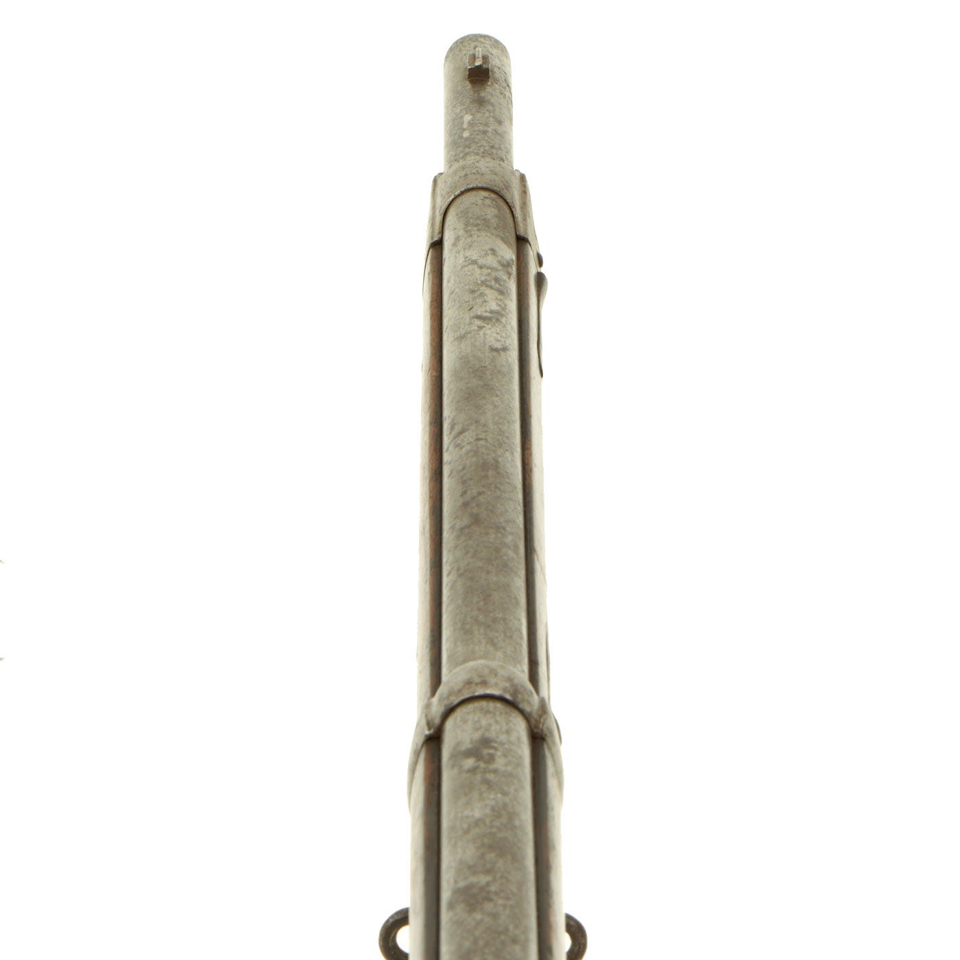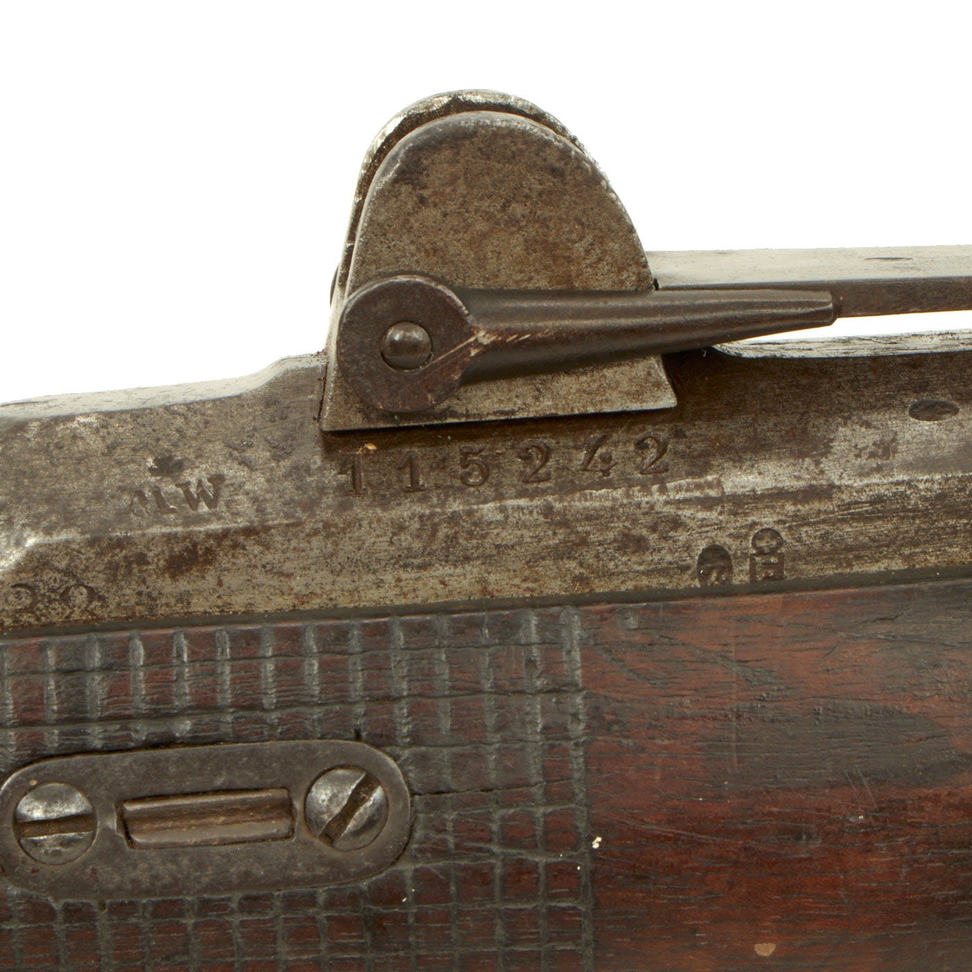 Overall the metalwork shows staining and patination, which we have left intact to preserve the history. Both sling swivels are present, and the rear sight is still functional. the cleaning rod has unfortunately gone missing in the 100+ years since the rifle was produced.