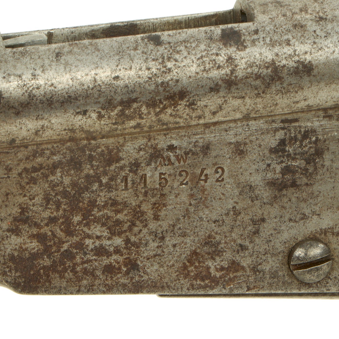 Serial number 115242 is found on the receiver below the maker mark, as well as on the chamber end of the barrel and on the right side of the butt stock. The maker mark indicates production by Eidgenössische Montier-Werstätte (Federal Assembly Workshop in Bern, Switzerland. This is the first example of this rare maker that we have seen. There are additional proof marks on metal components of the rifle, as well as some on the stock.