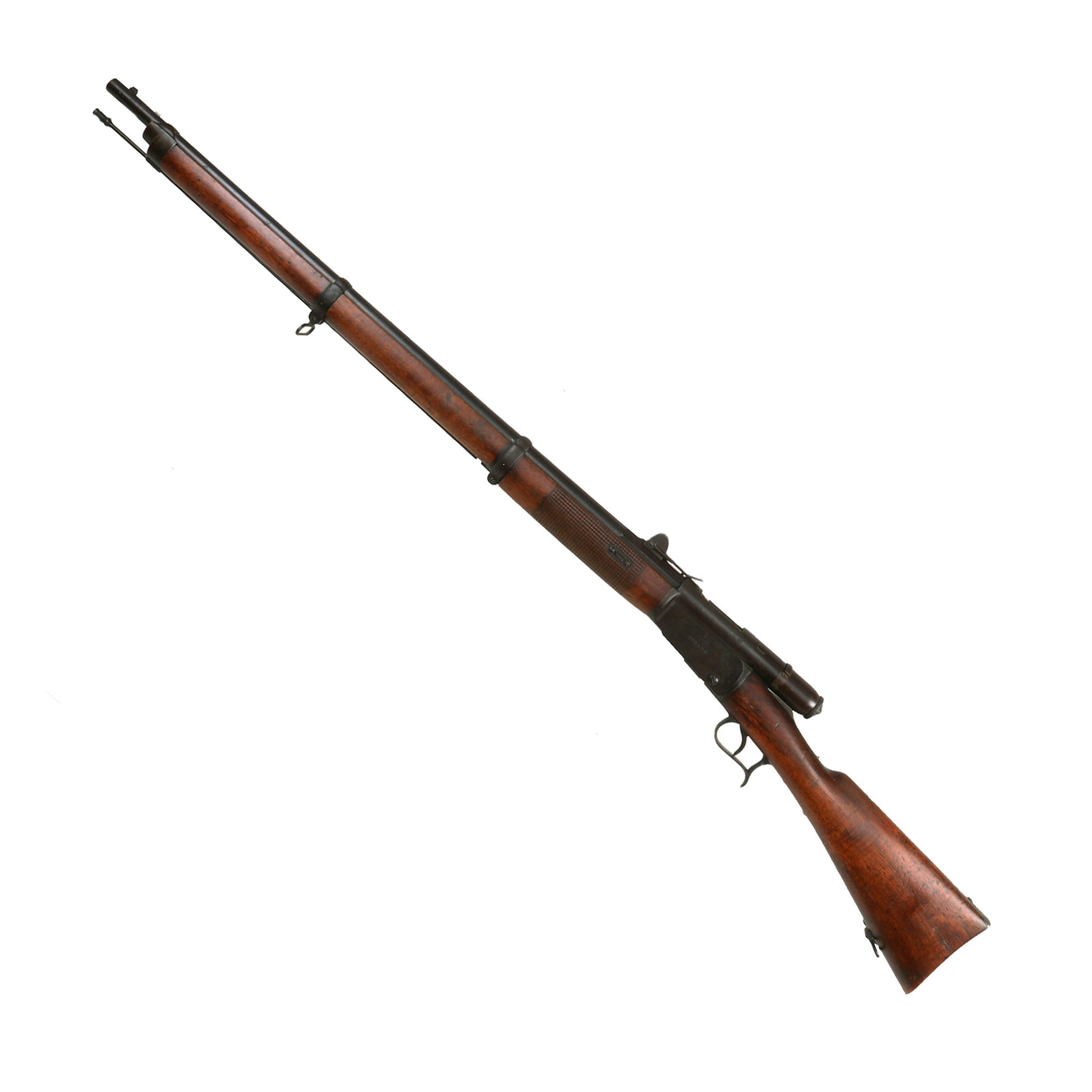 Offered in very good condition, this was a rifle serving at the time of Britain's legendary Martini-Henry Single Shot Rifle, also introduced in 1871 and not replaced with a magazine rifle until 1888. The metalwork shows a lovely dark gray patina, faded from the original bluing. The wood stock is in very good condition, with some minor dents and scrapes, with a few stains. The bore is in very good condition, showing a mostly bright finish with strong lands and grooves. There is just a bit of wear to the lands and oxidation to the grooves.