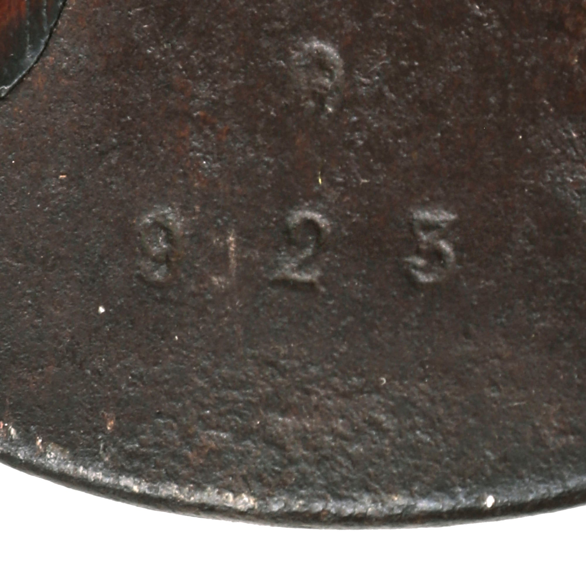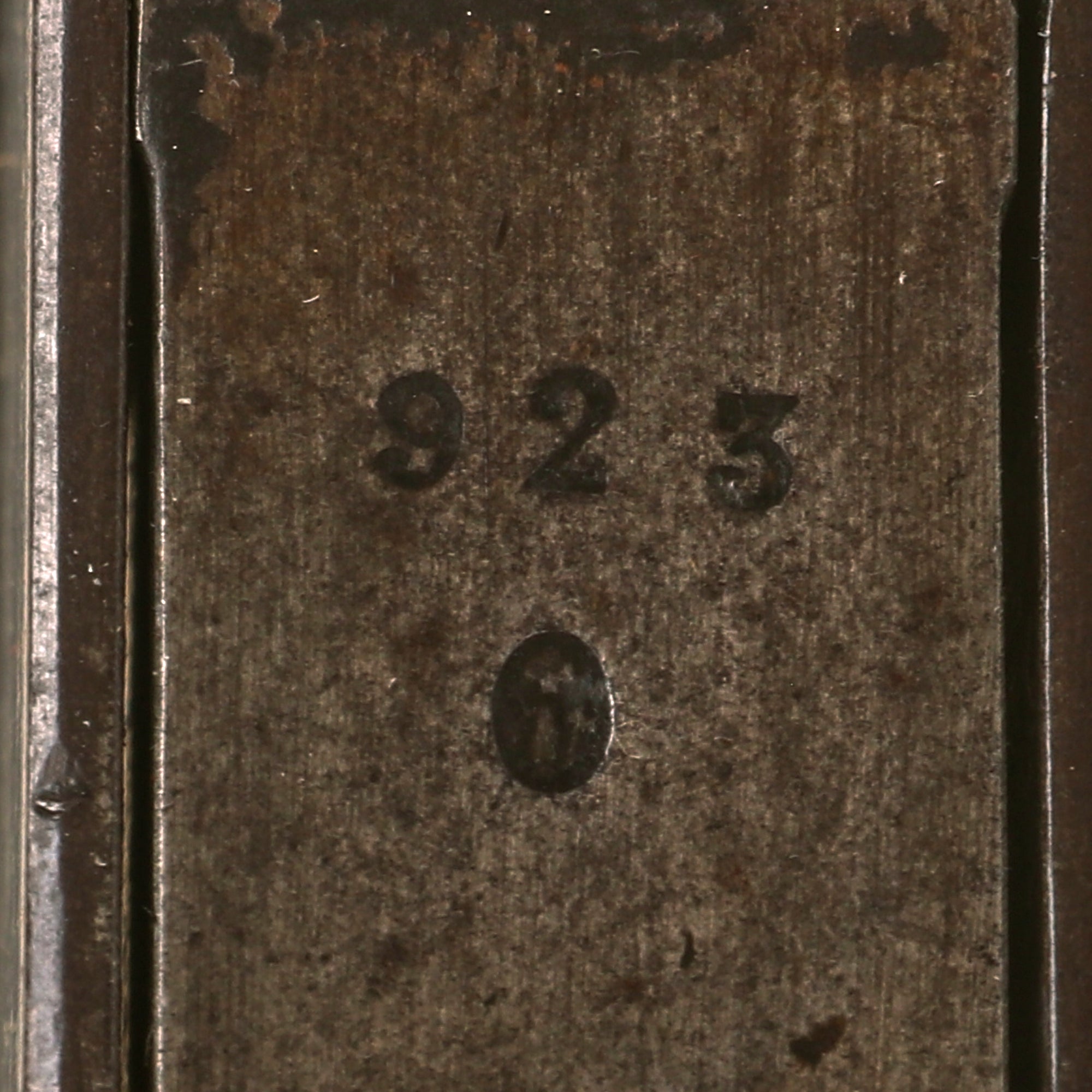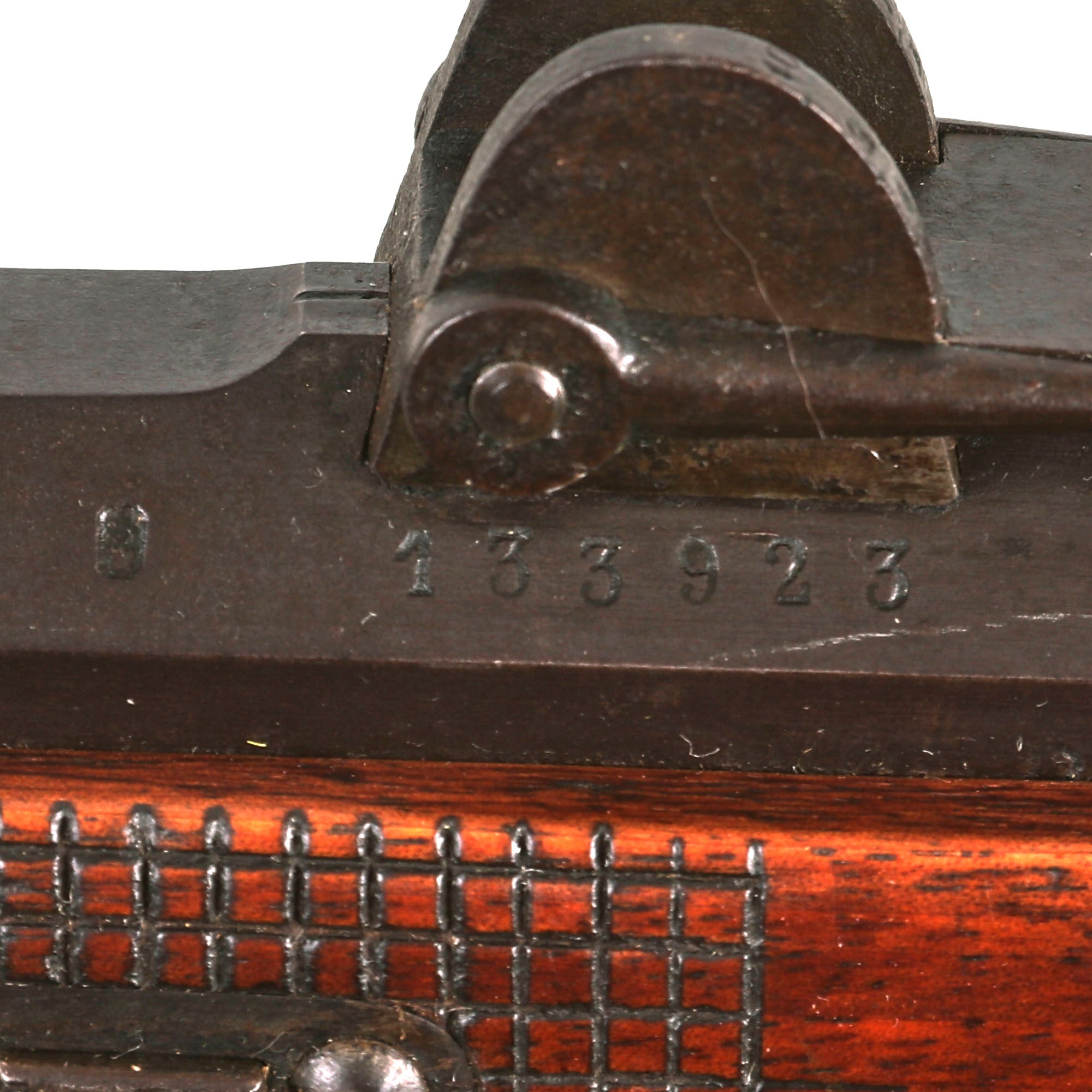 Serial number 133923 is found on the receiver below the maker mark, as well as on the chamber end of the barrel and 923 on the bottom of the feed block/ejector, sight base, and on the butt plate (faint). There are additional proof marks on metal components of the rifle, as well as some on the stock.