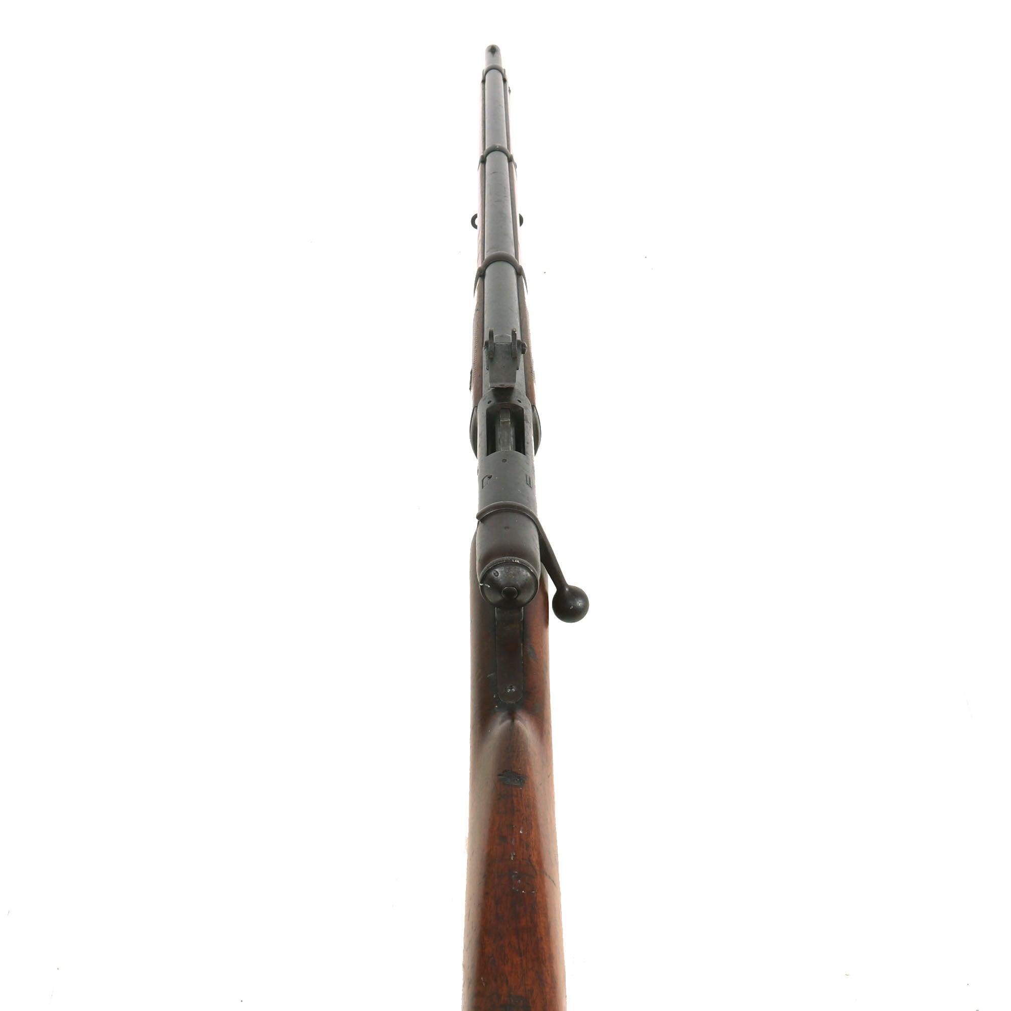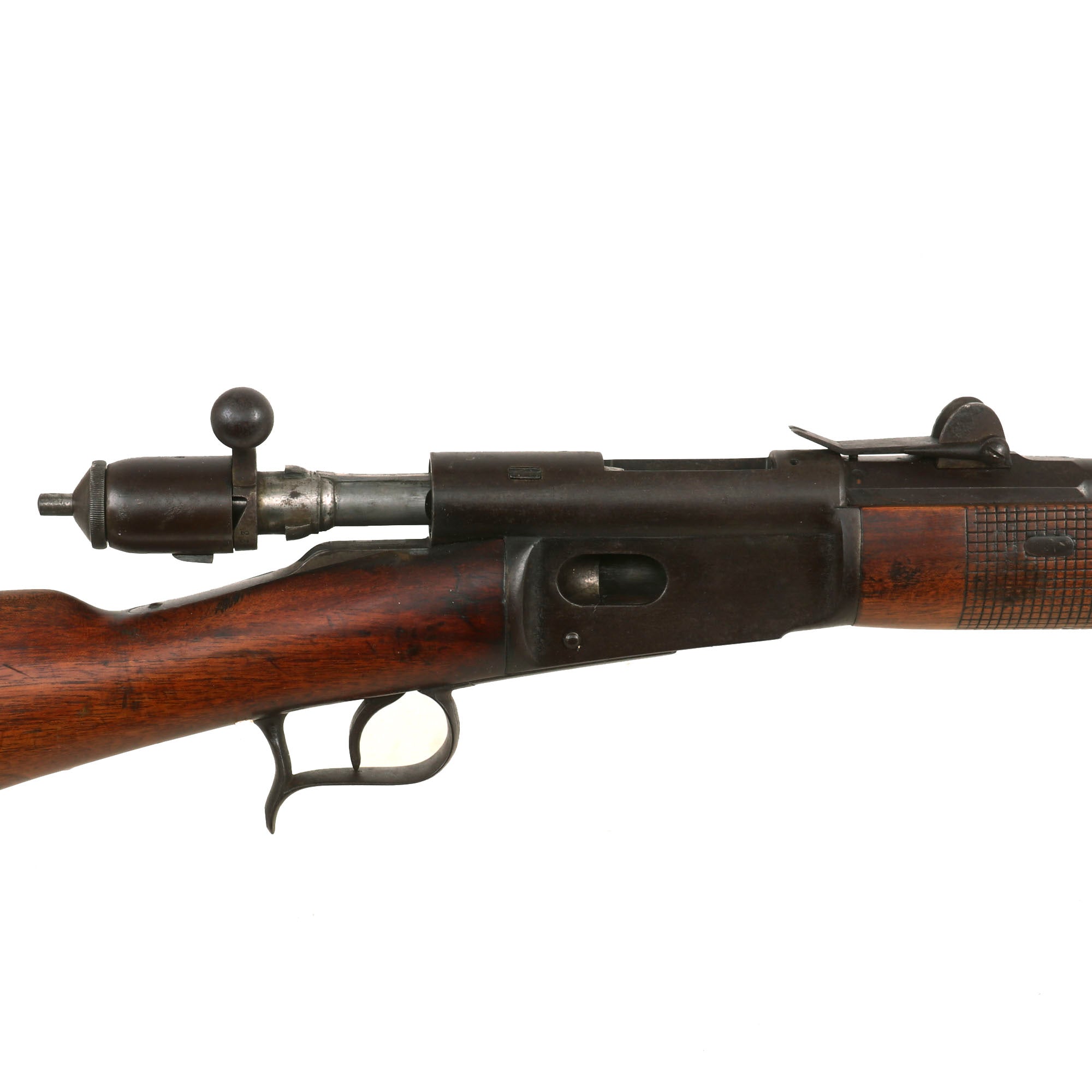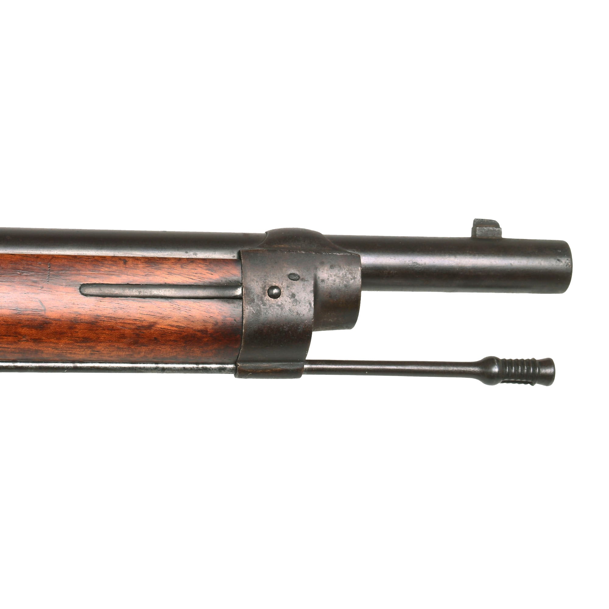 Original Item: Only One Available. Introduced in 1867, the Vetterli rifle system utilized the "Winchester" tube magazine system for cartridge storage under the barrel. The original 1867 model had an external hammer, like a Winchester, but in 1868 this was changed to an internal cocking bolt spring. The cleaning rod was moved to the side of the rifle, but this proved problematic, so the model of 1869 moved it back to the under barrel position. In 1871, the loading gate cover on the right side of the receiver and the magazine cutoff on the left side were deemed to be redundant, so a new model 1871 was introduced without them. It also featured strengthened barrel rings and a much thicker and sturdier rear sight leaf. Later models after this changed over to the box Magazine found on most rifles of the WWI era.