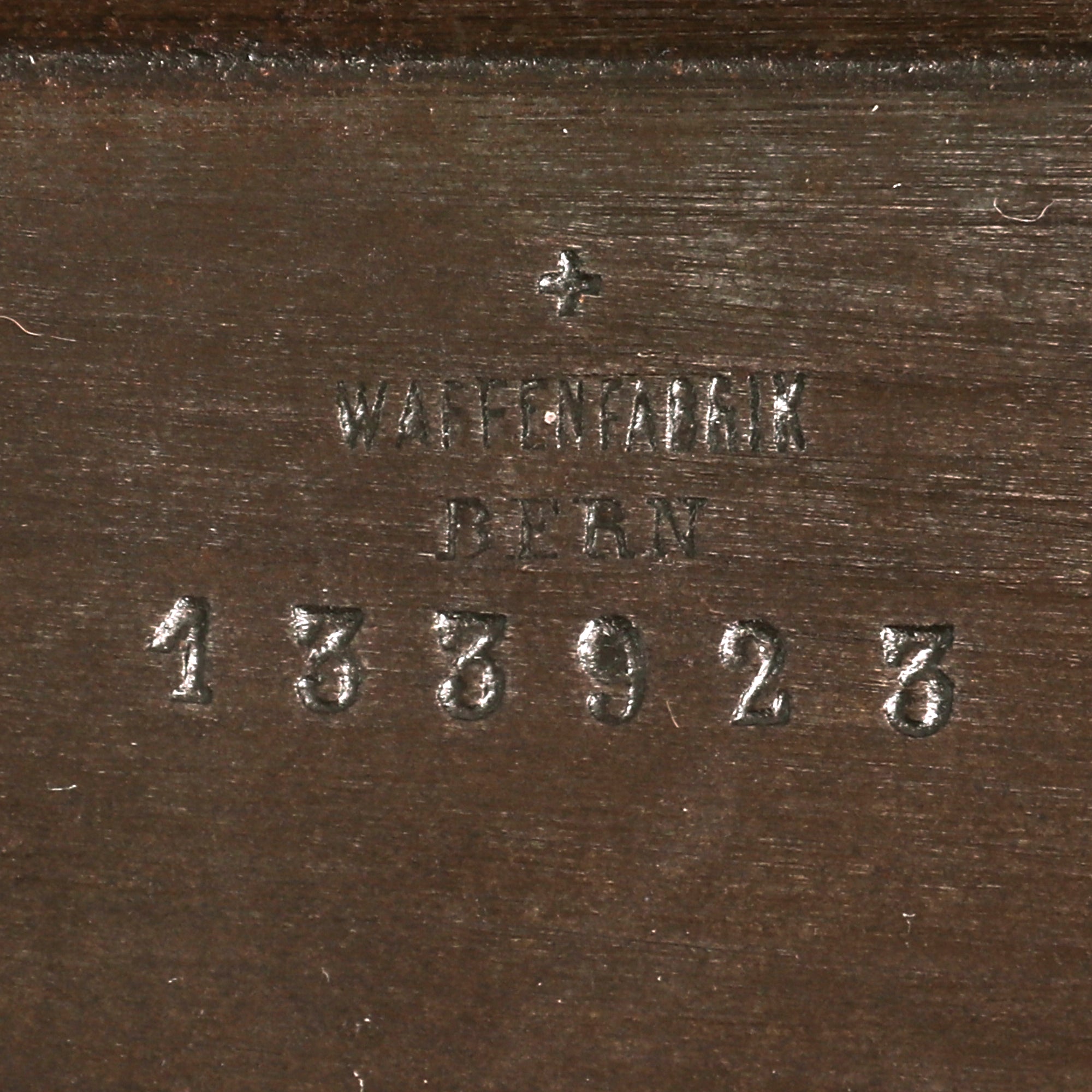 To accelerate the sluggish production of the Vetterli rifles, the federal authorities built a new arms factory in Berne, the Eidgenössische Waffenfabrik (W+F), in 1875. This factory is usually thought to have started with the M1878 variant of the Vetterli rifle, however this is definitely an M1871 model, with some of the improvements on the M1878 already implemented. The rifle has the correct two gas escape holes in receiver and 1000 Schritt rear sight as seen on pre-1875 manufacture, which were removed in later examples. Definitely an interesting piece of history!