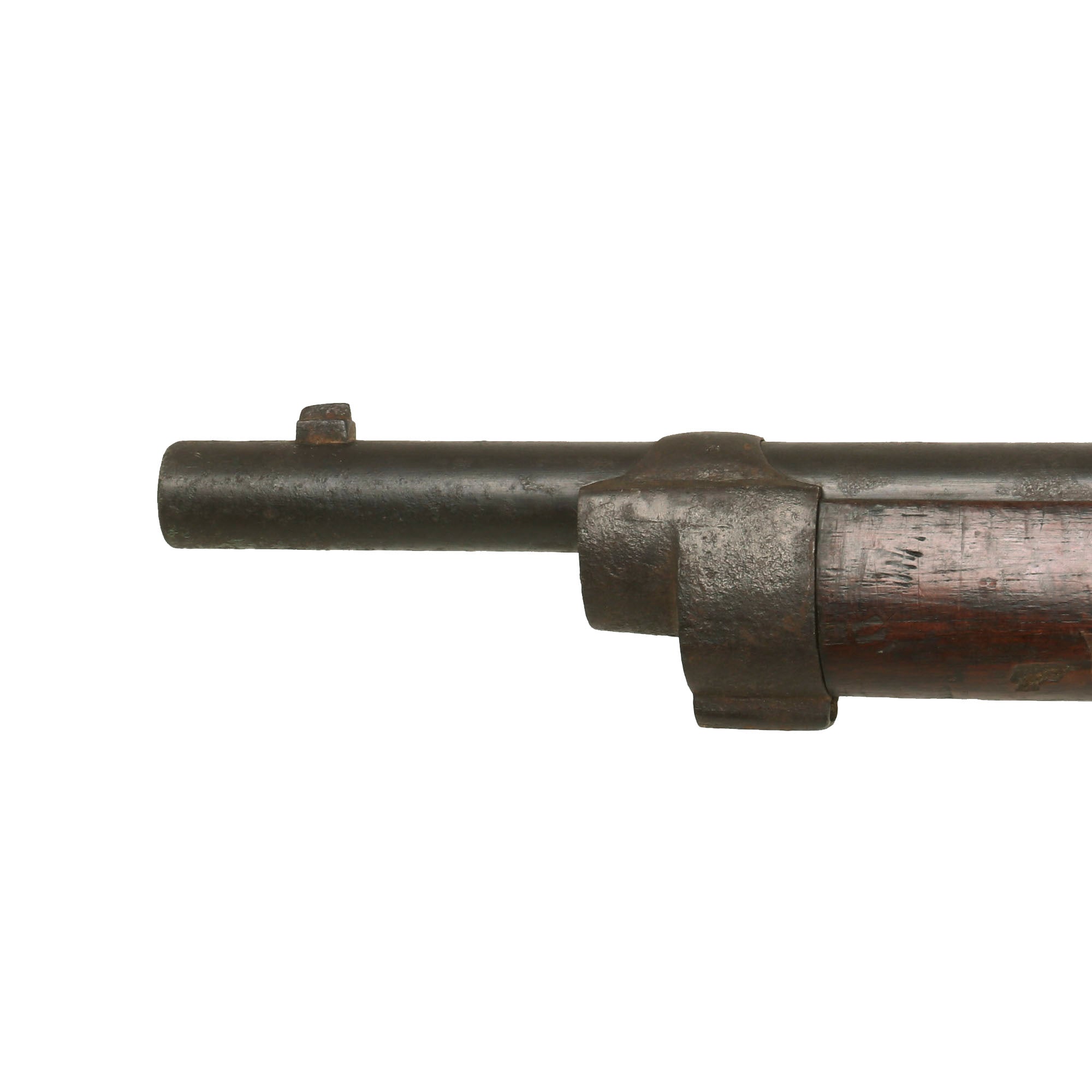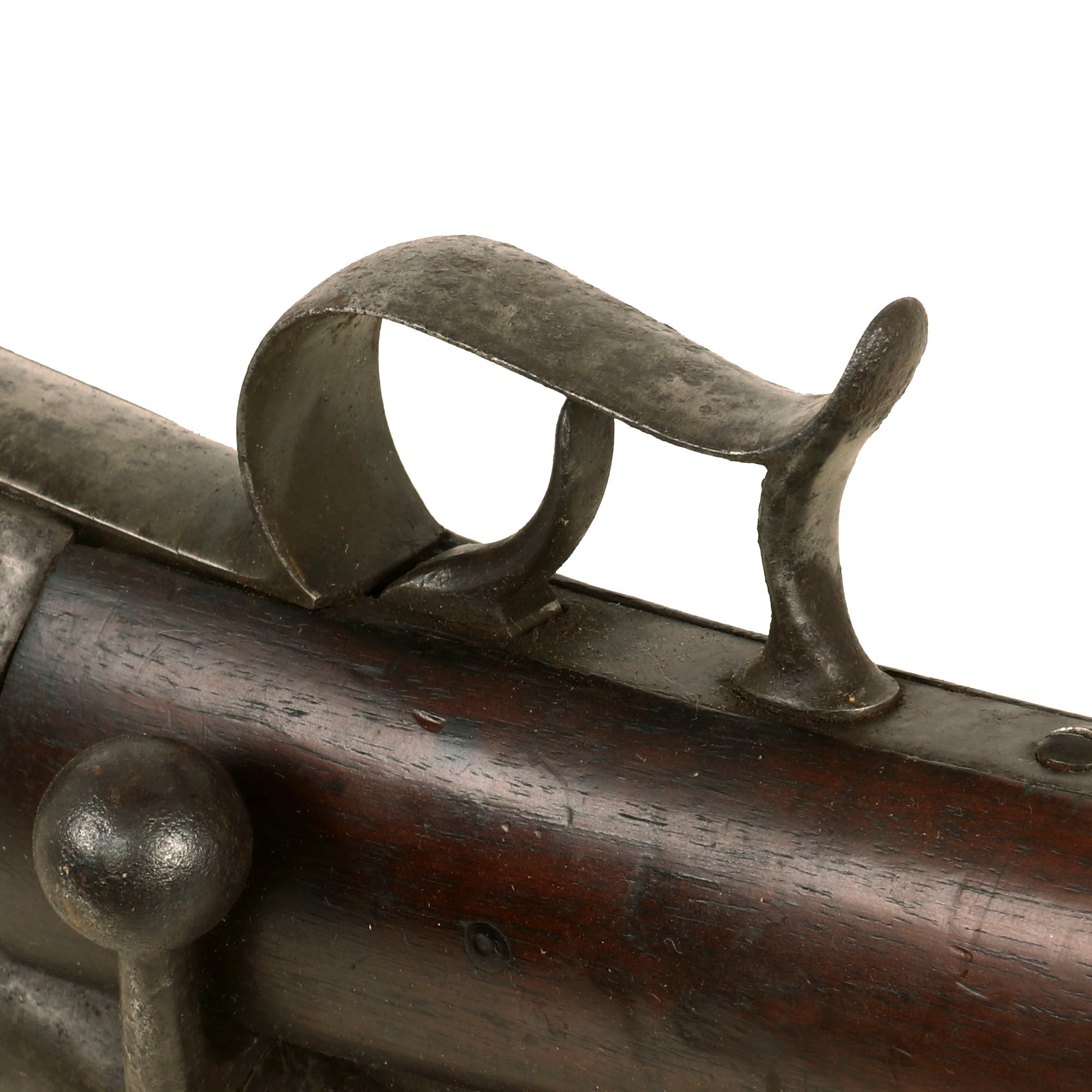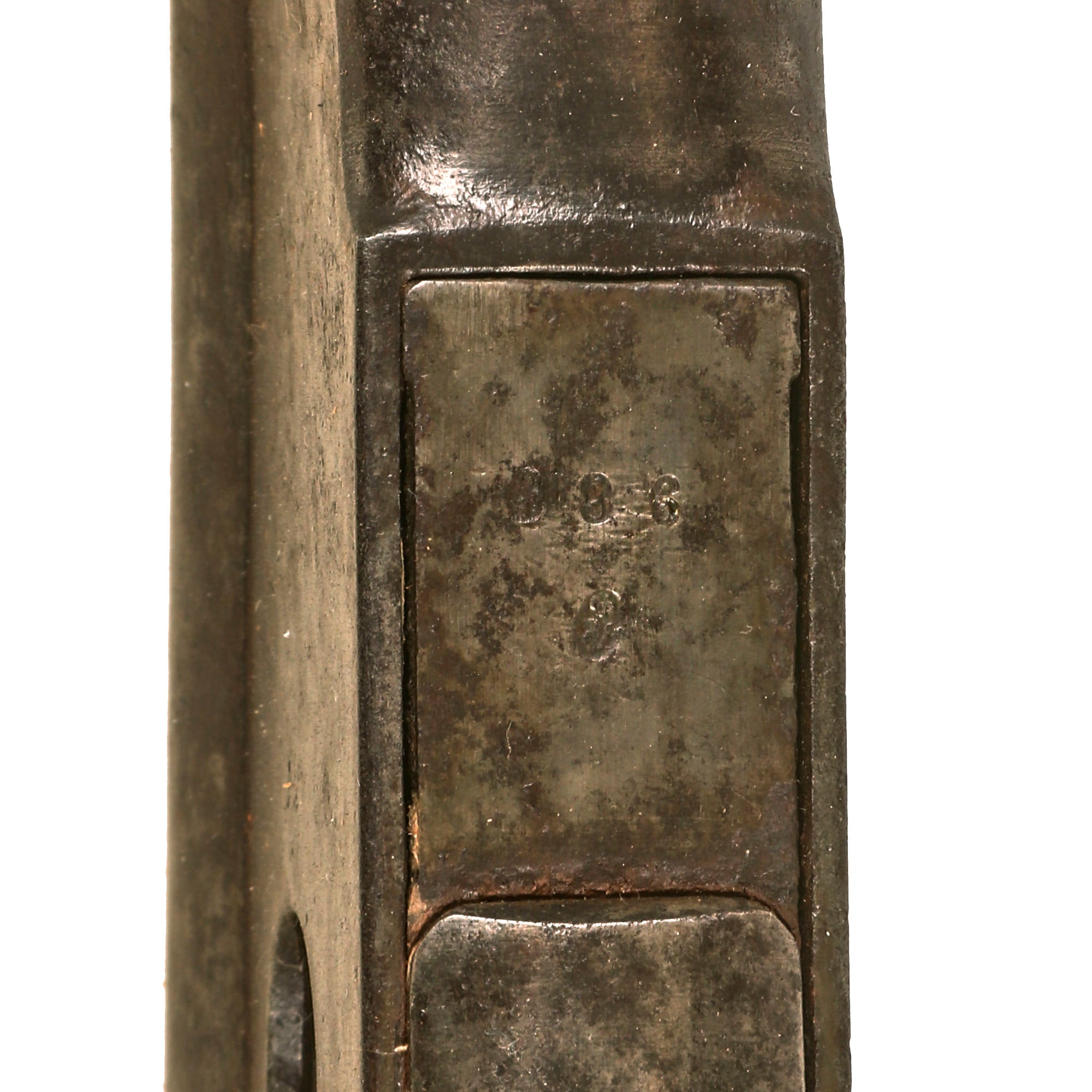 Offered in very good service used condition, this was a rifle serving at the time of Britain's legendary Martini-Henry Single Shot Rifle, also introduced in 1871 and not replaced with a magazine rifle until 1888. The metalwork shows a lovely dark gray patina, faded from the original bluing, and there are some areas of rust and past pitting evident. The wooden stocks are in very good condition, with some dents and scrapes on the fore stock, while the butt stock is in great shape with some lovely figure to the grain. The butt stock however must have taken quite a blow at some point, bending the trigger guard downwards and shearing off the bolt going from the trigger guard to the receiver tang. This also cracked the stock a bit next to the receiver tang. We have not made any attempts to fix this, as it would most likely damage the metal further.