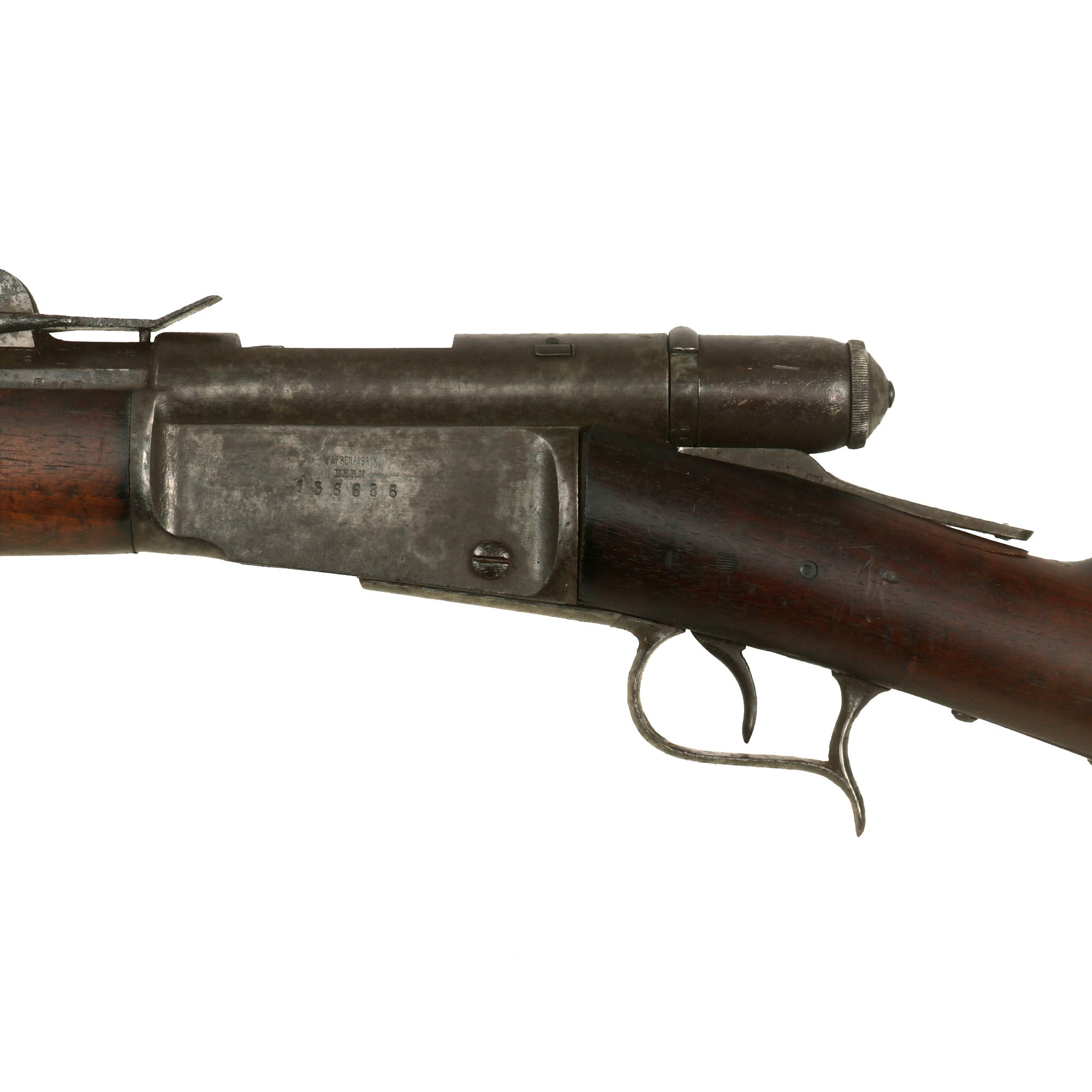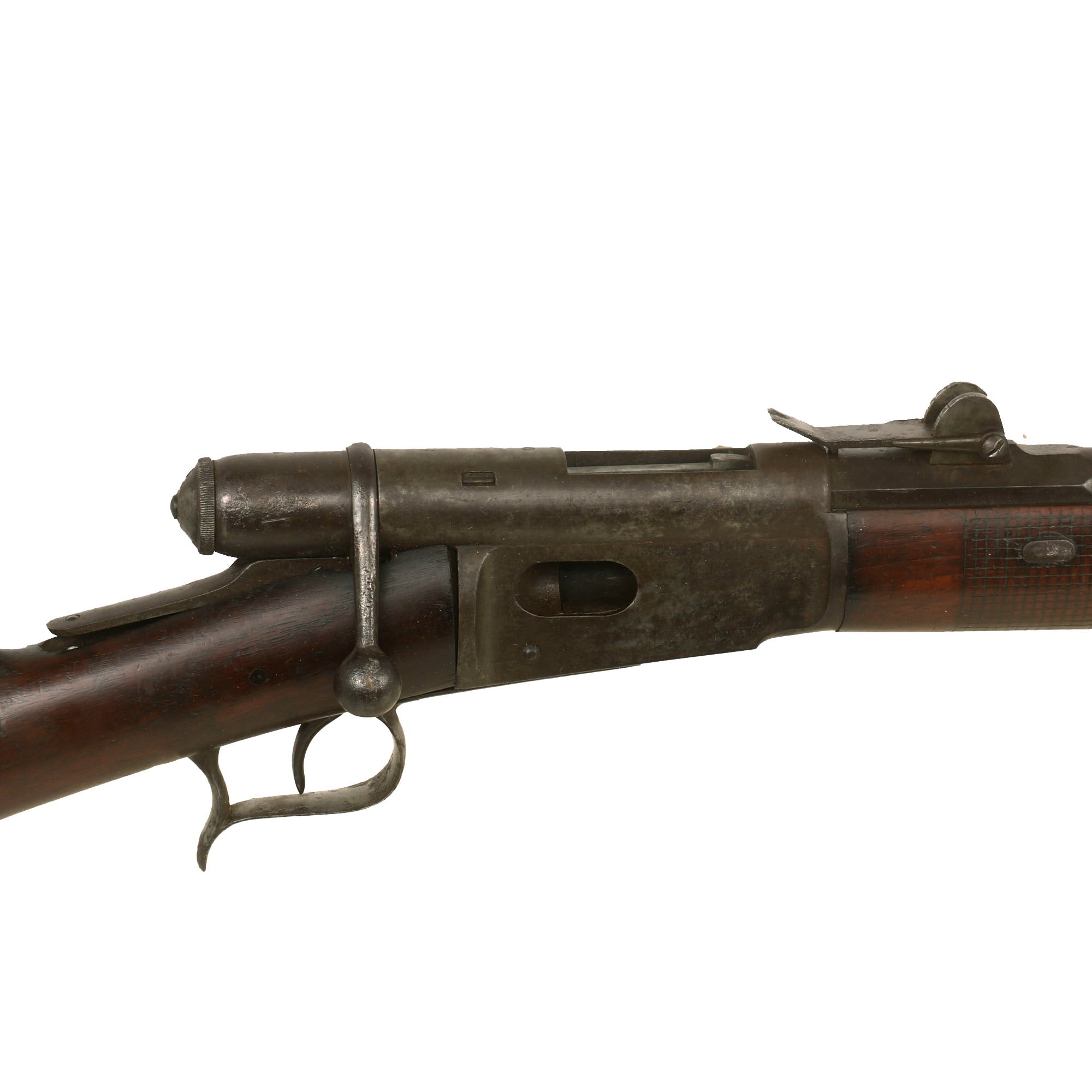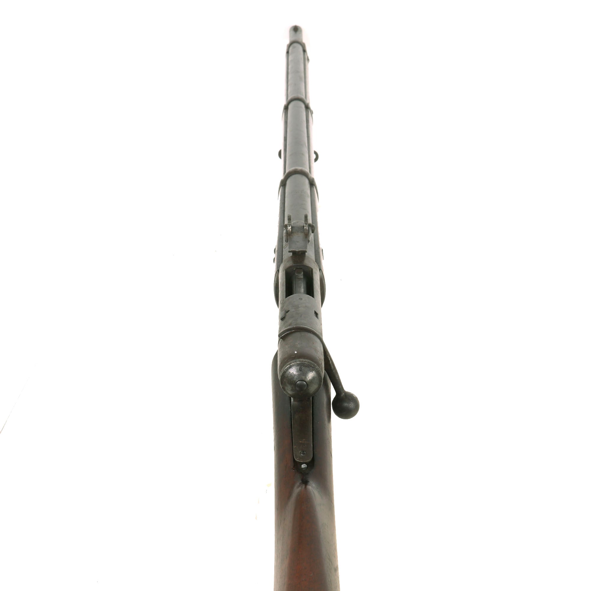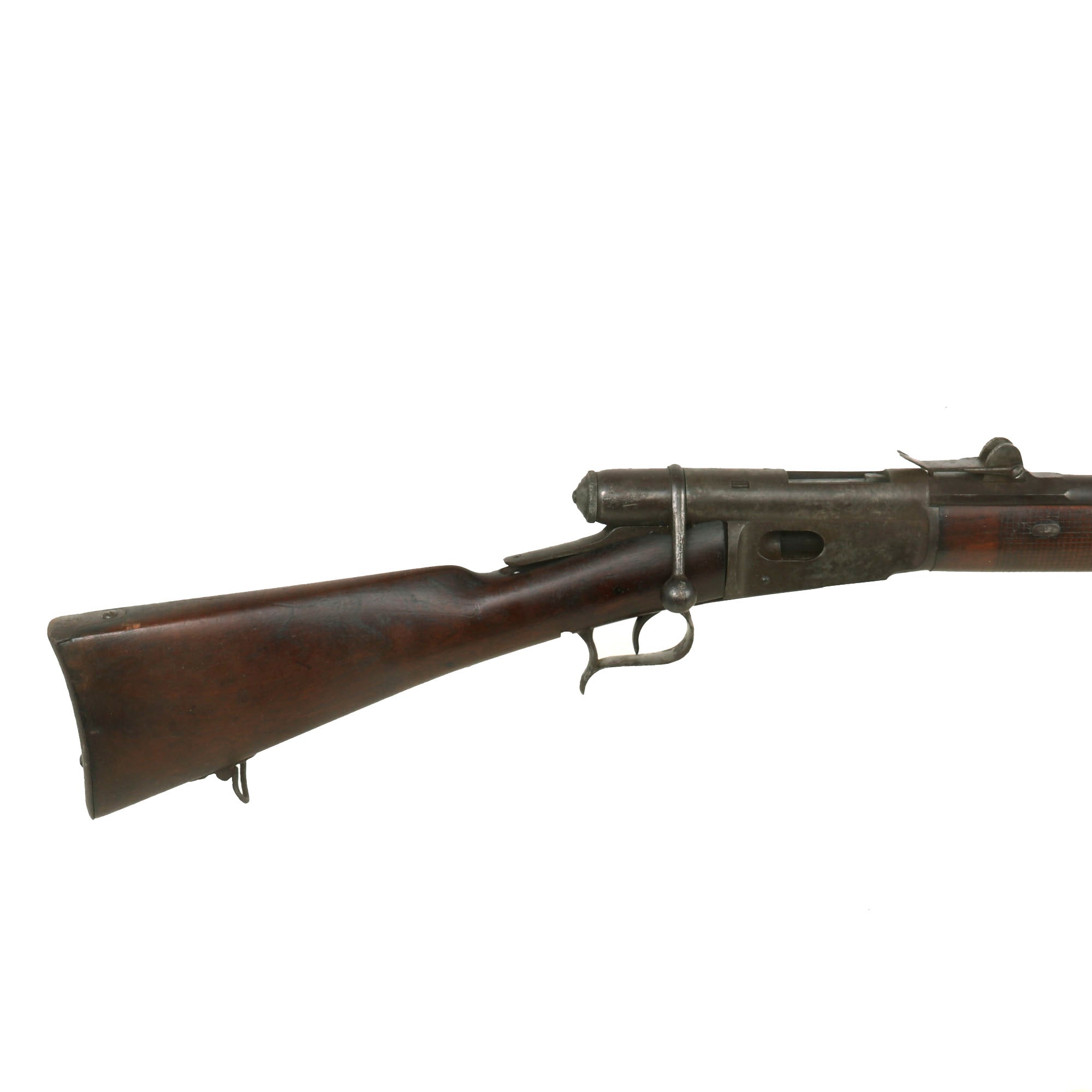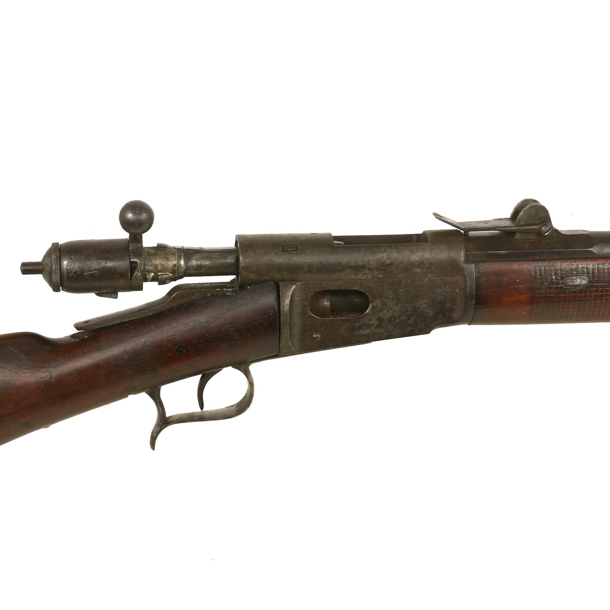 Original Item: Only One Available. Introduced in 1867, the Vetterli rifle system utilized the "Winchester" tube magazine system for cartridge storage under the barrel. The original 1867 model had an external hammer, like a Winchester, but in 1868 this was changed to an internal cocking bolt spring. The cleaning rod was moved to the side of the rifle, but this proved problematic, so the model of 1869 moved it back to the under barrel position. In 1871, the loading gate cover on the right side of the receiver and the magazine cutoff on the left side were deemed to be redundant, so a new model 1871 was introduced without them. It also featured strengthened barrel rings and a much thicker and sturdier rear sight leaf. Later models after this changed over to the box Magazine found on most rifles of the WWI era.