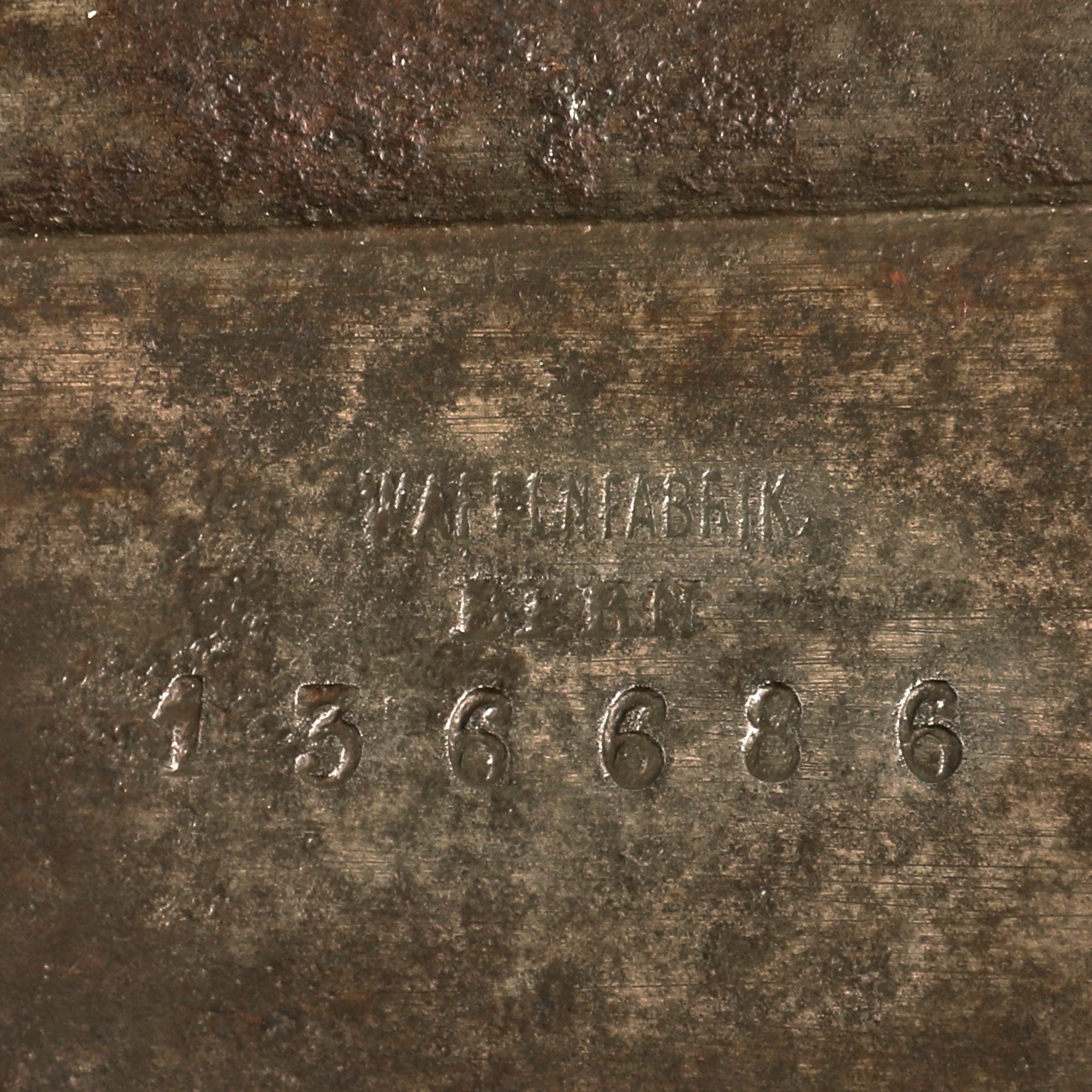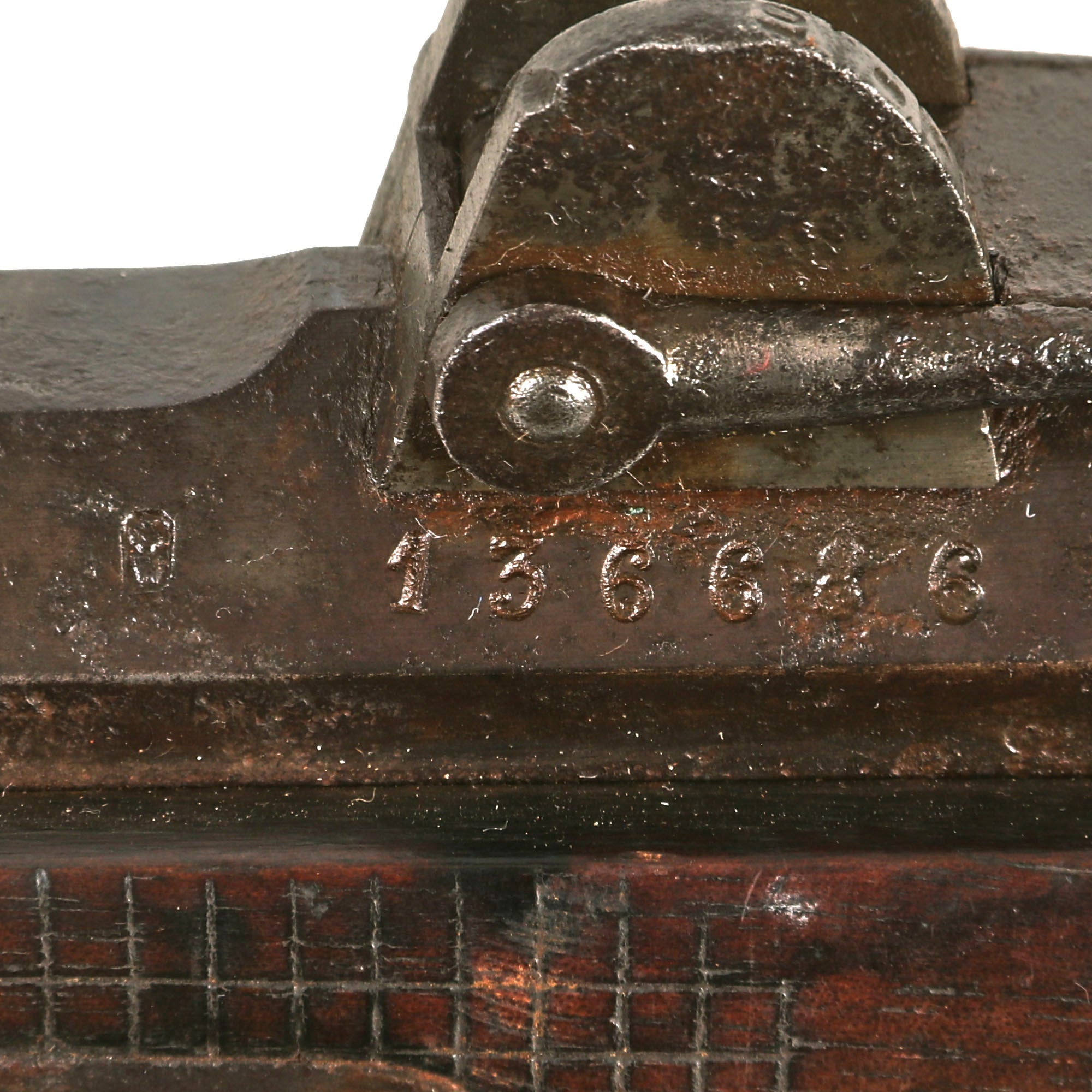 Serial number 136686 is found on the receiver below the maker mark, as well as on the chamber end of the barrel and 686 on the bottom of the feed block/ejector, sight base, and on the butt plate (faint). There are additional proof marks on metal components of the rifle, as well as some on the stock.