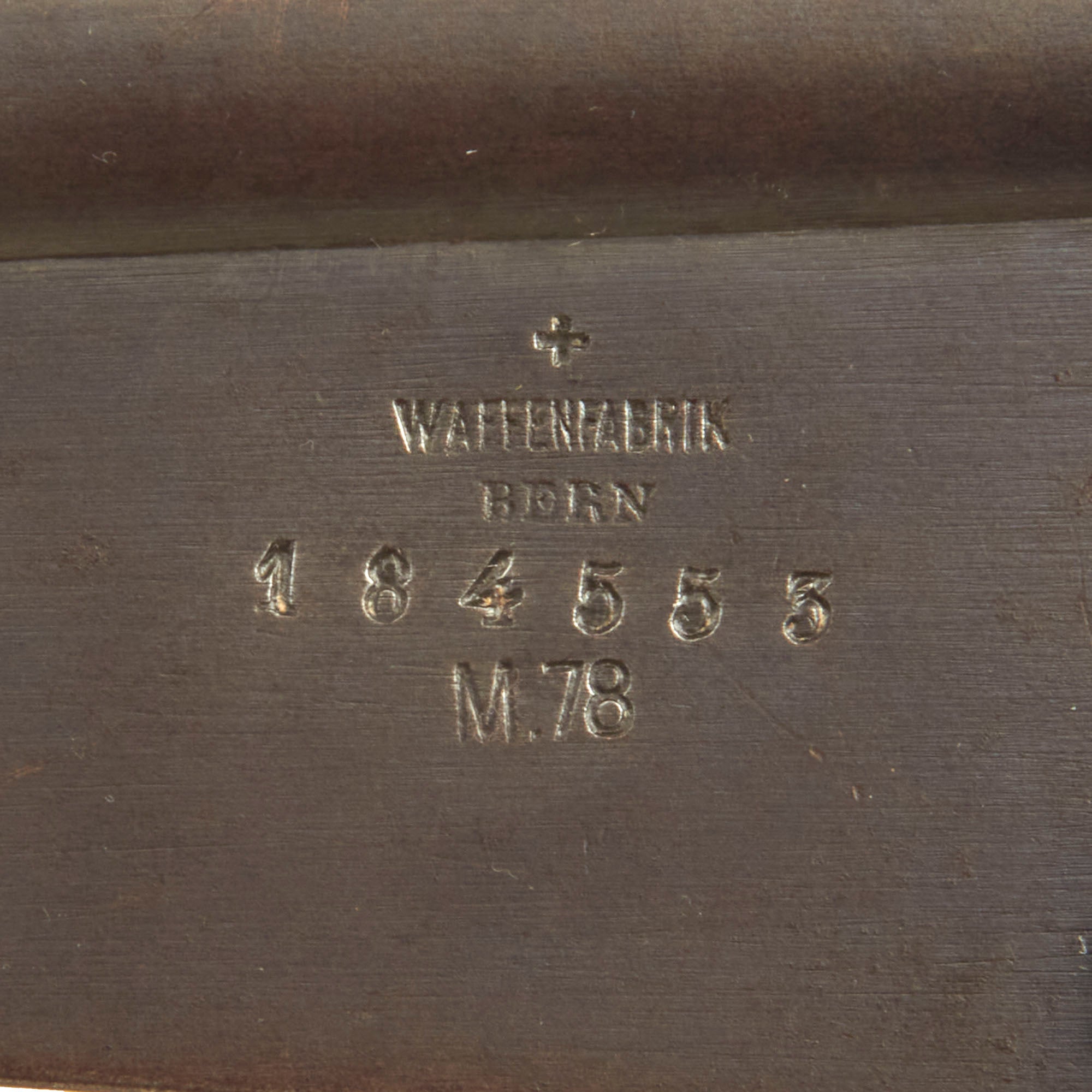 Serial number 184553 is found on the receiver below the maker mark, as well as on the chamber end of the barrel. Shortened number 553 is found on the bottom of the feed block/ejector, trigger guard, sight base and leaf, nose cap, butt plate, and possibly elsewhere. There are additional proof marks on metal components of the rifle, as well as some on the stock, many with the Swiss "Geneva Cross" marking.