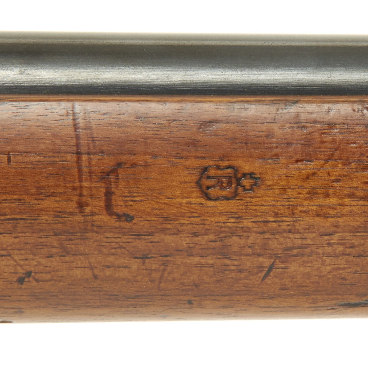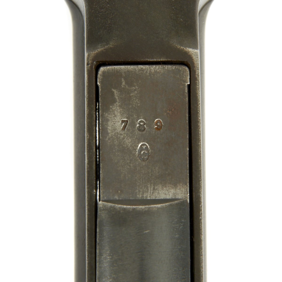 Serial number 218789 is found on the receiver below the maker mark, as well as on the chamber end of the barrel and 789 on the bottom of the feed block/ejector and on the butt plate. There are additional proof marks on metal components of the rifle.