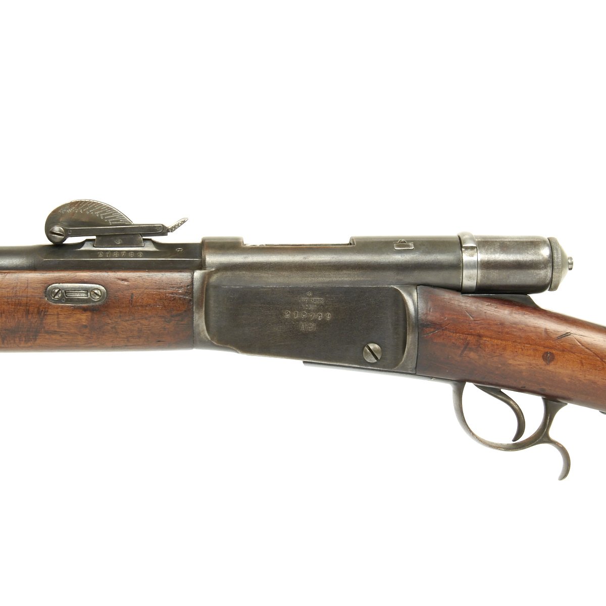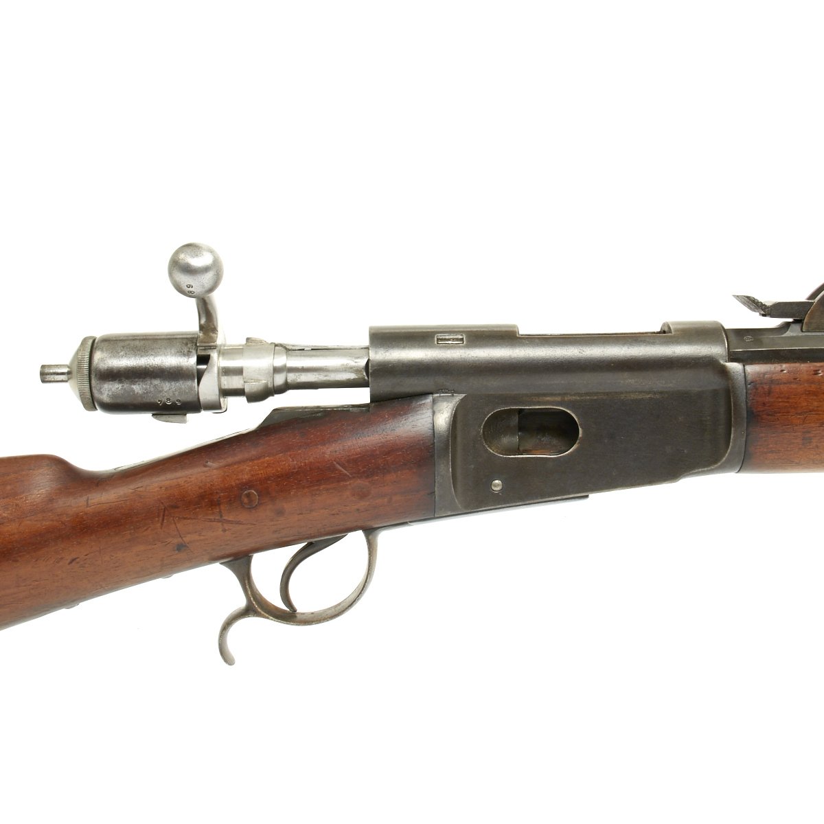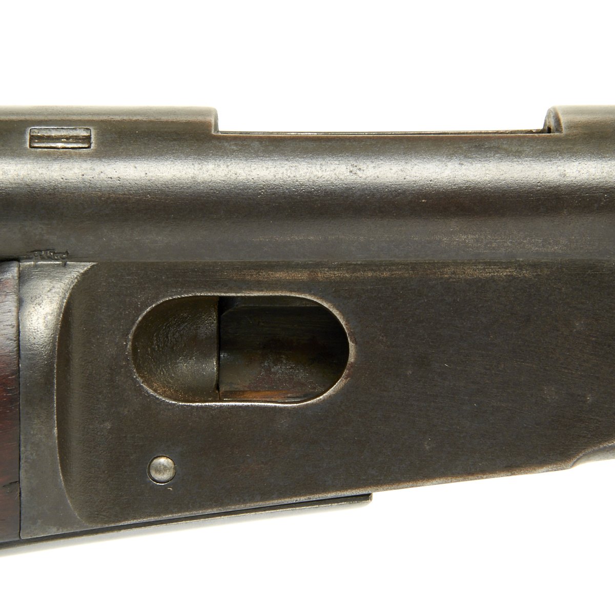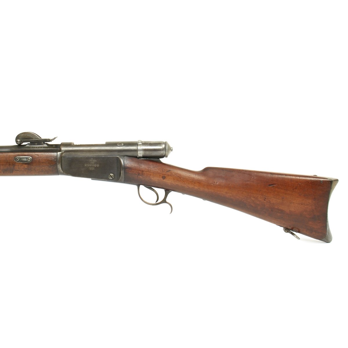 Original Item: Only One Available. Introduced in 1867, the Vetterli rifle system utilized the "Winchester" tube magazine system for cartridge storage under the barrel. The original 1867 model had an external hammer, like a Winchester, but in 1868 this was changed to an internal cocking bolt spring. The cleaning rod was moved to the side of the rifle, but this proved problematic, so the model of 1869 moved it back to the under barrel position. In 1871, the loading gate cover on the right side of the receiver and the magazine cutoff on the left side were deemed to be redundant, so a new model 1871 was introduced without them. It also featured strengthened barrel rings and a much thicker and sturdier rear sight leaf.