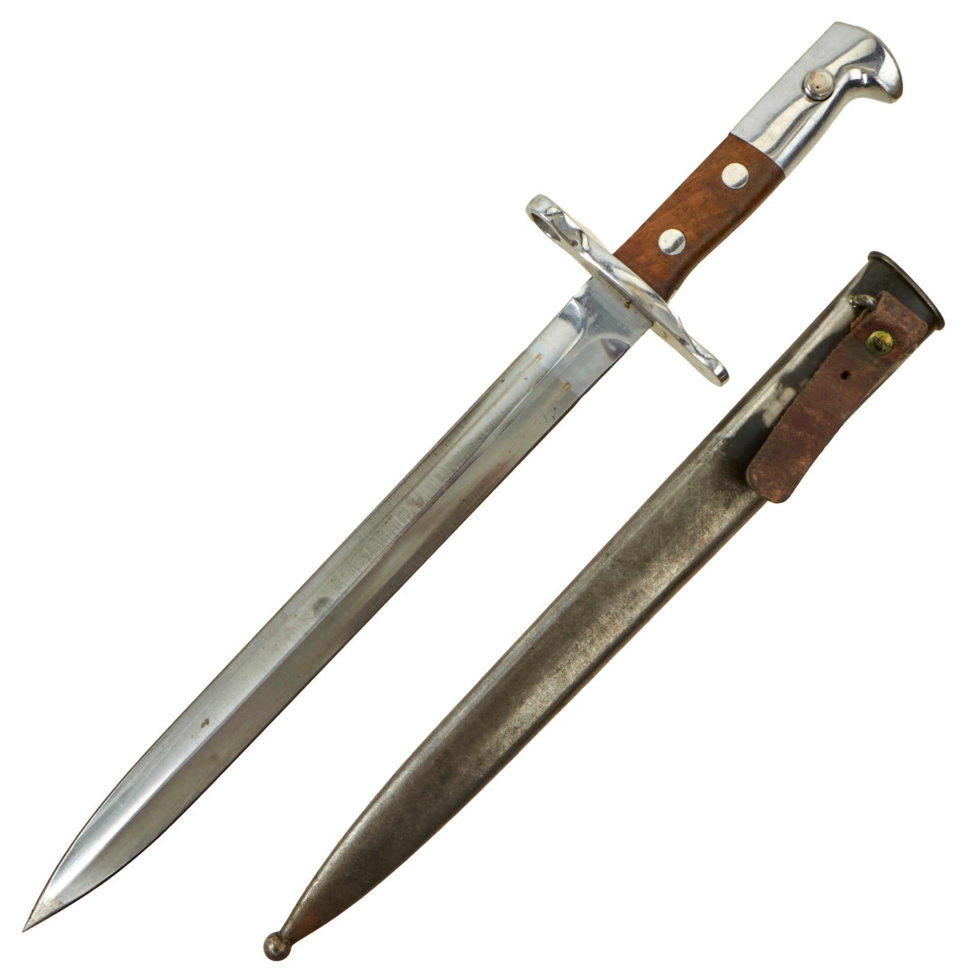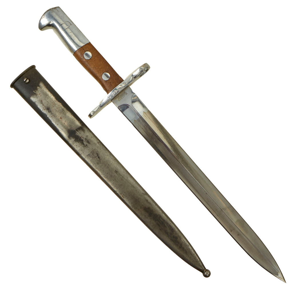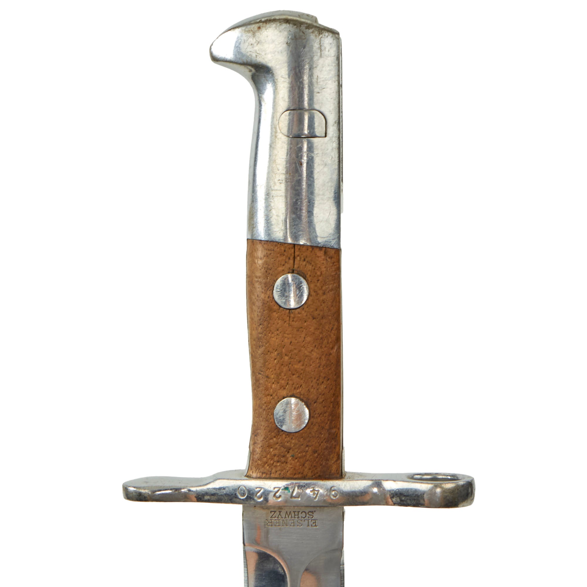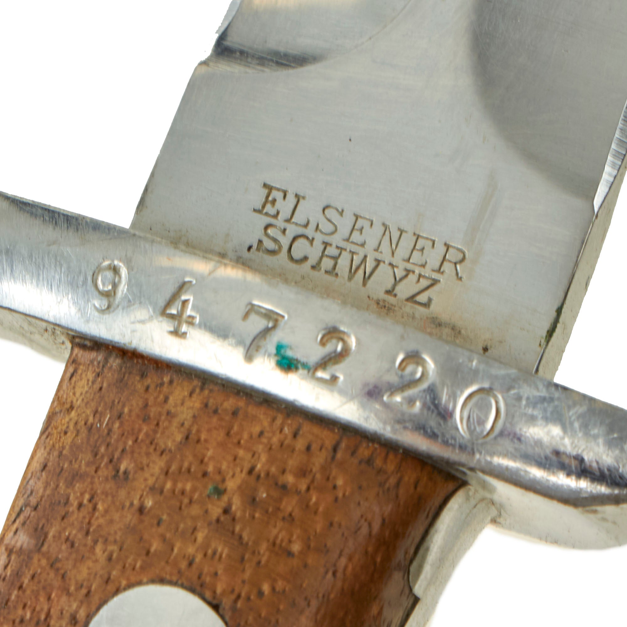 Original Item. Only One Available. This WWII Swiss bayonet is marked as being manufactured by Elsener Schwyz, a knives manufacturer located in the Canton of Schwyz. This bayonet comes with the original scabbard with a leather tab connected, and it retains the original manufacturer’s mark on its ricasso.