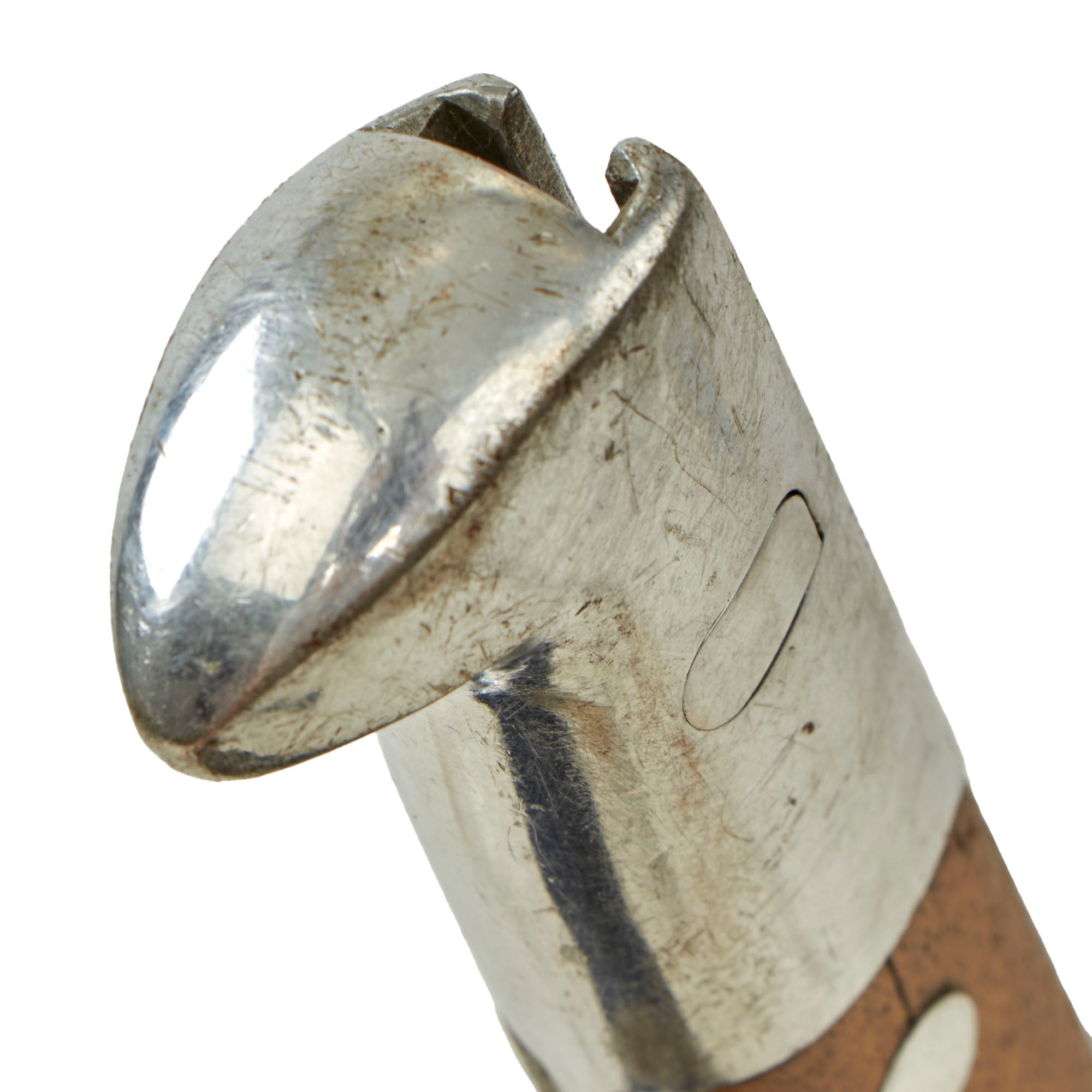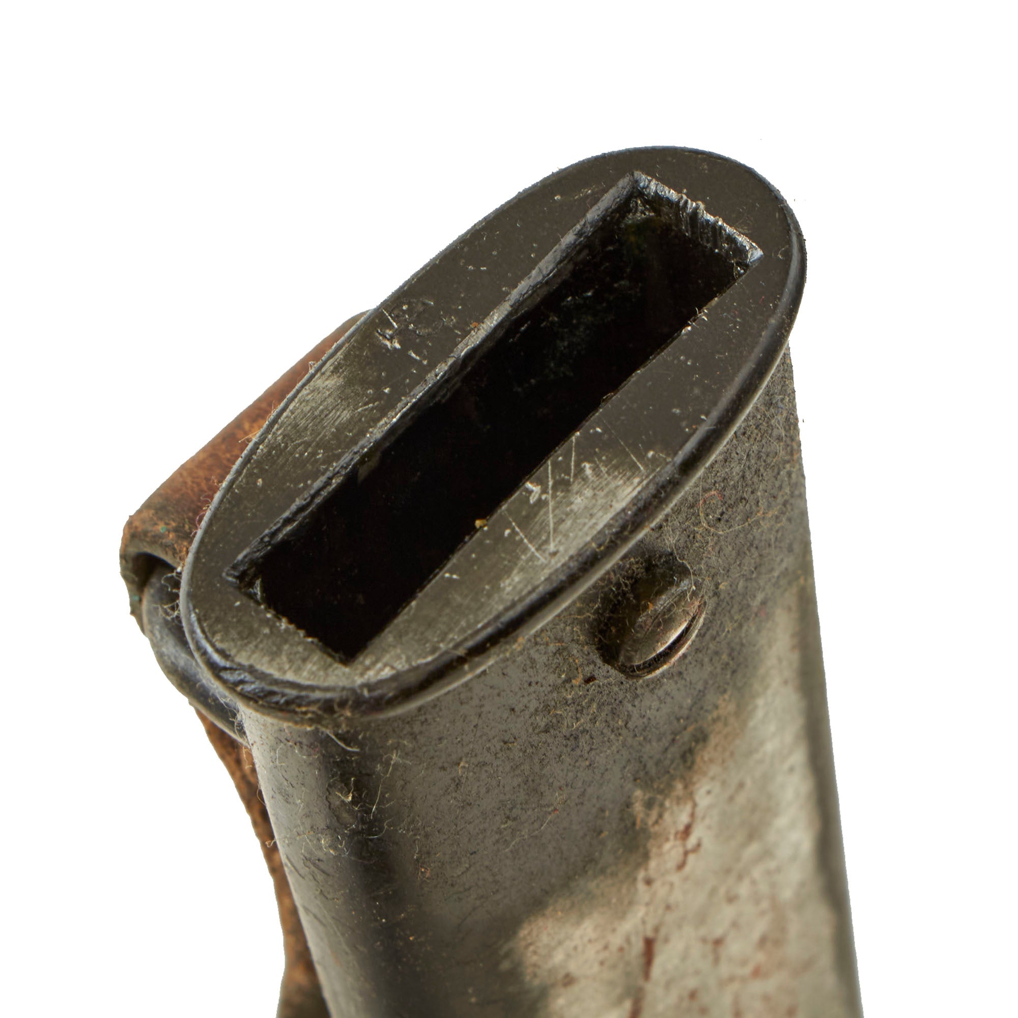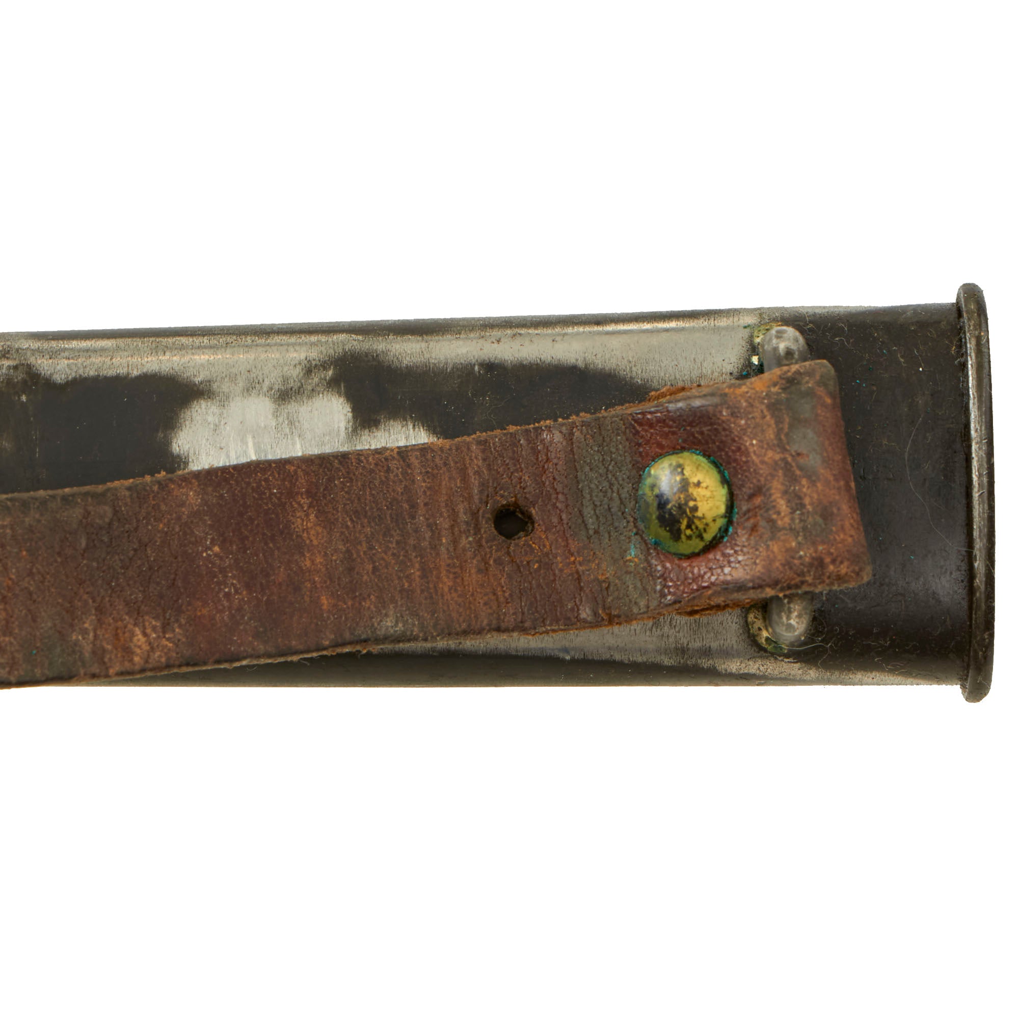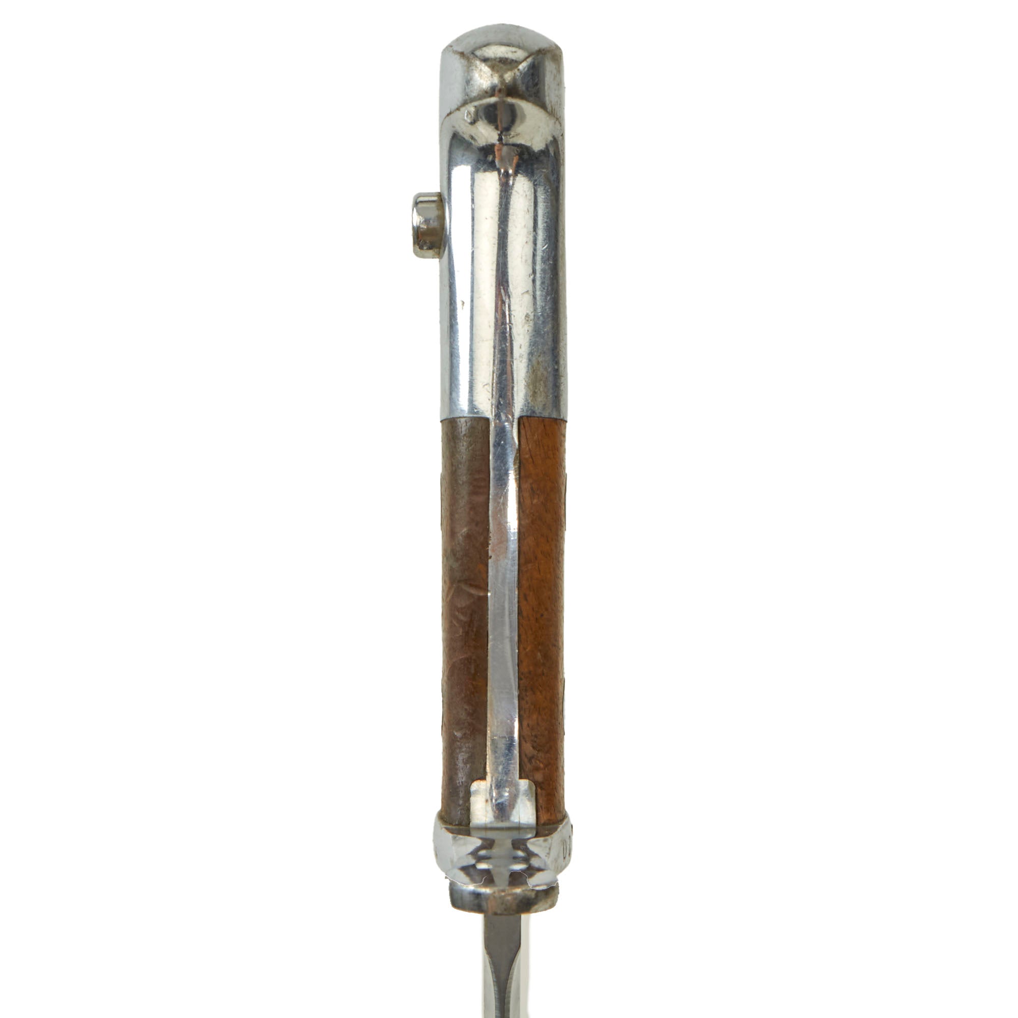Original Item. Only One Available. This WWII Swiss bayonet is marked as being manufactured by Elsener Schwyz, a knives manufacturer located in the Canton of Schwyz. This bayonet comes with the original scabbard with a leather tab connected, and it retains the original manufacturer’s mark on its ricasso.