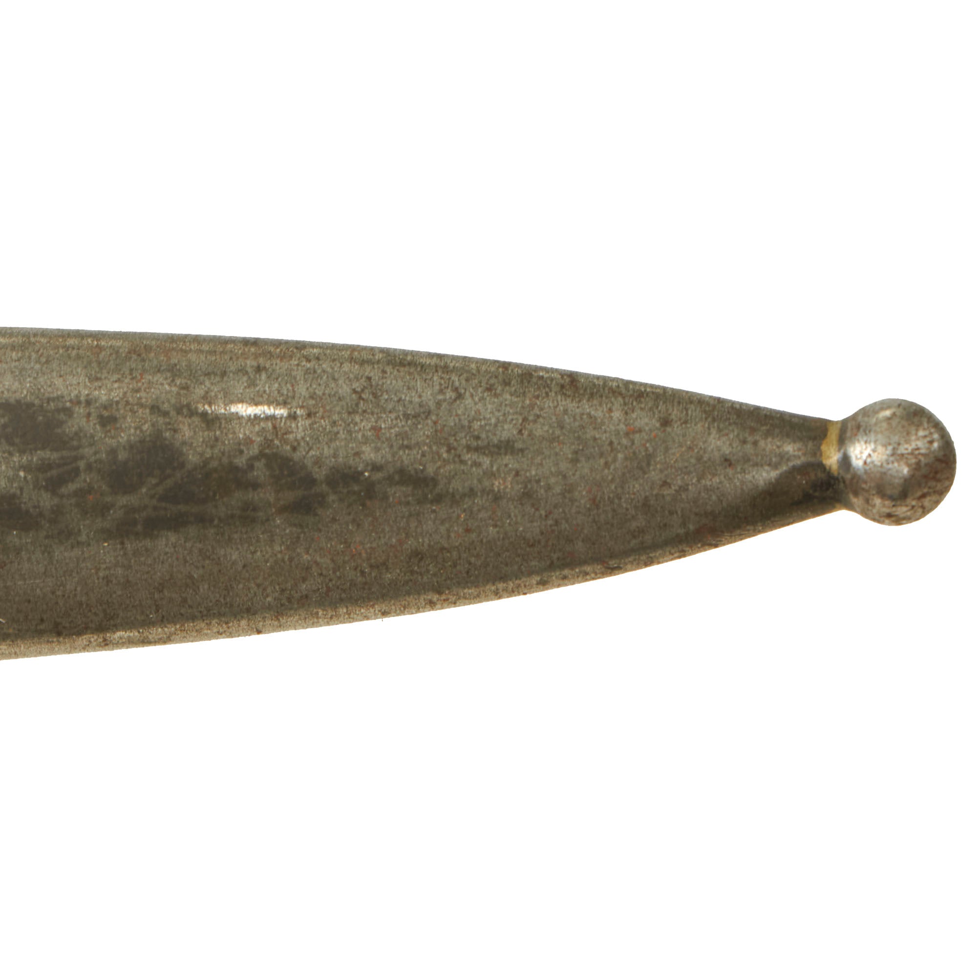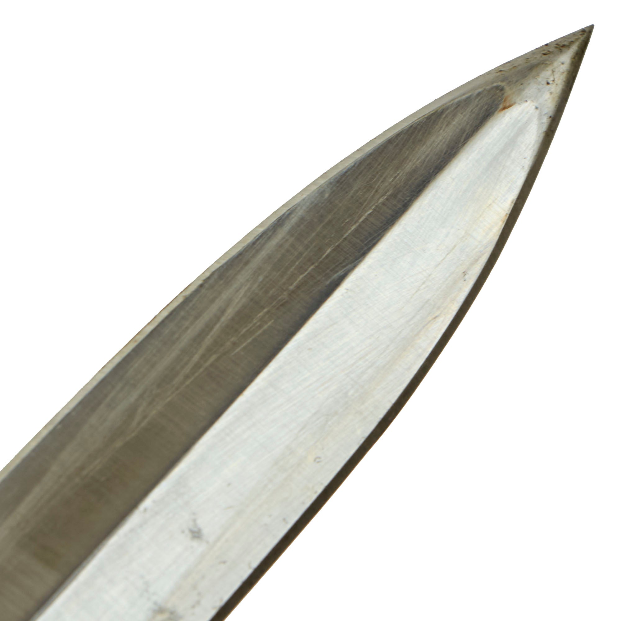 This example is in fair service-used condition, with heavy wear on the scabbard and some cracking in the grips. It has a clear maker mark on the ricasso: