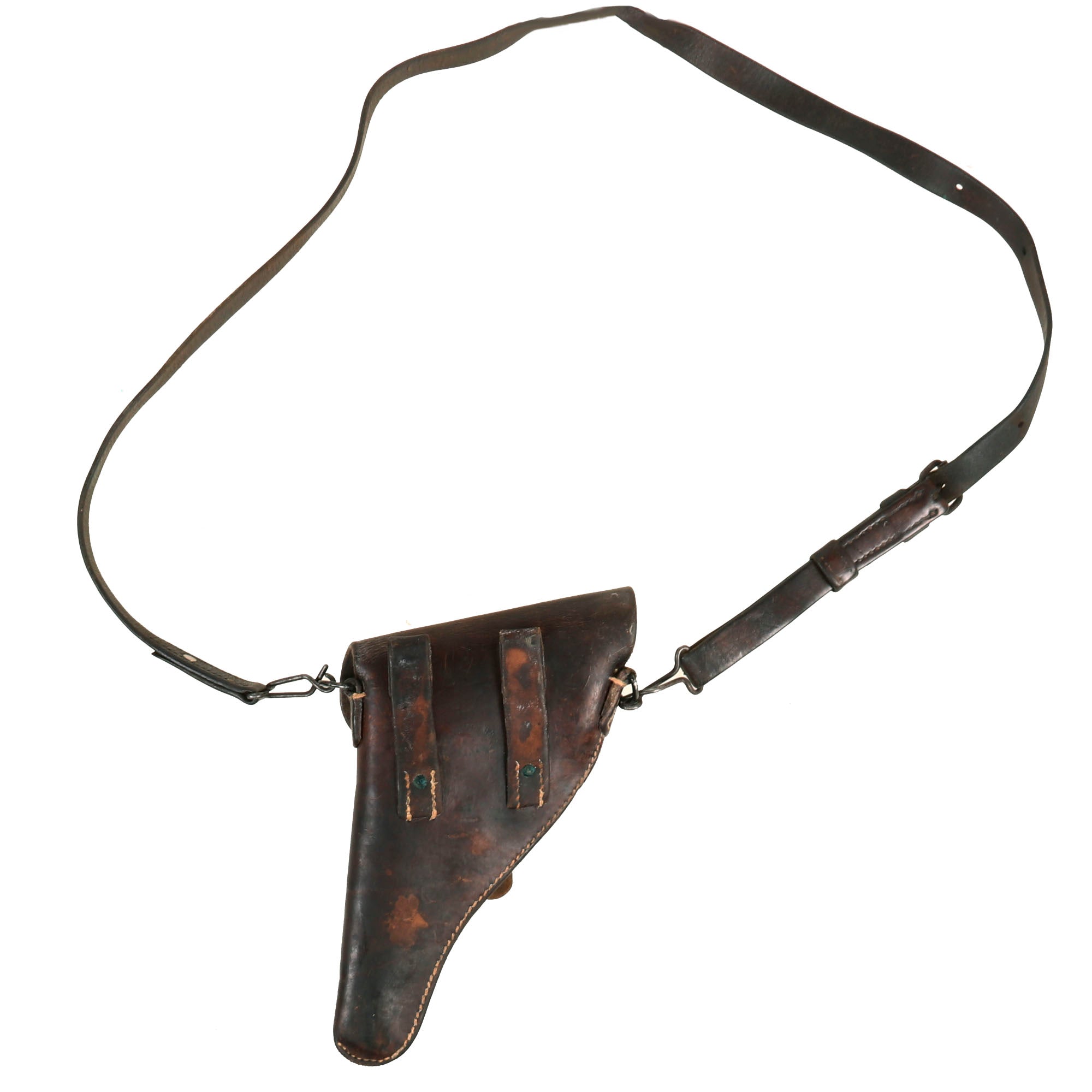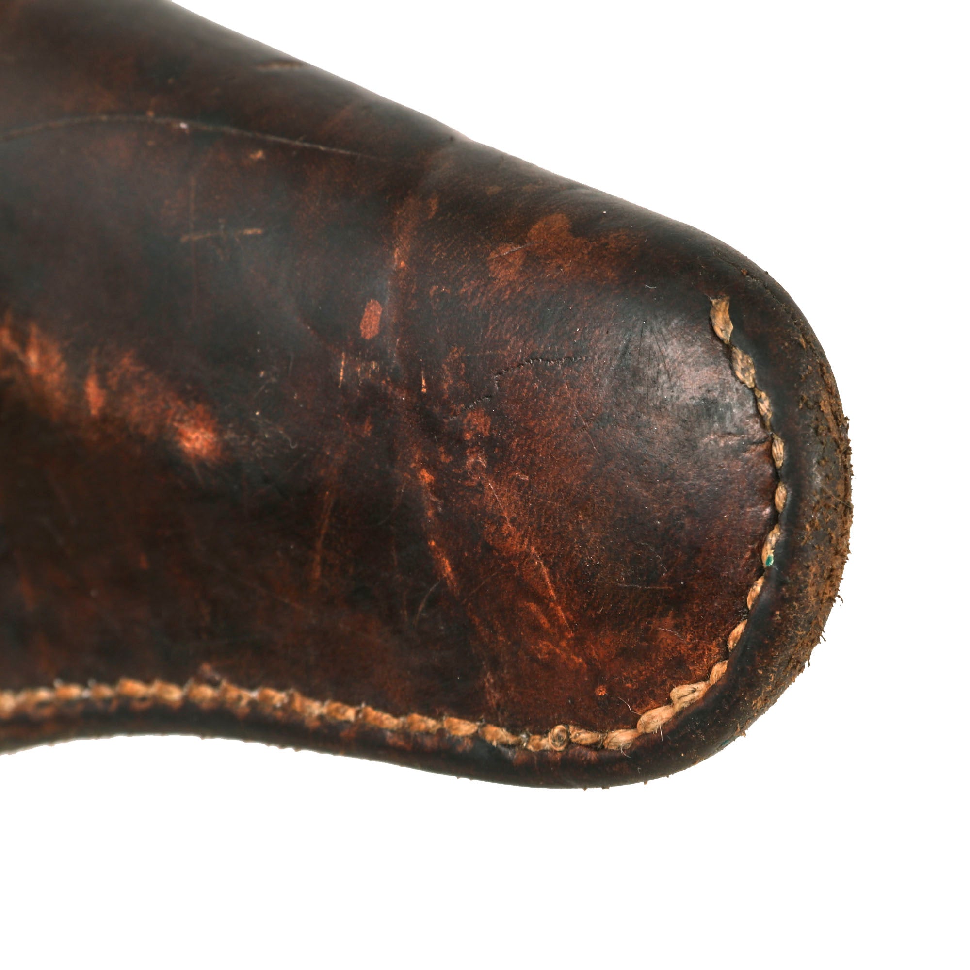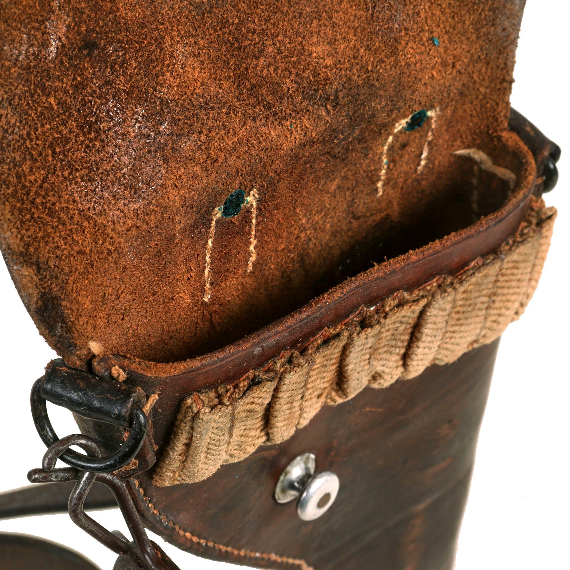Condition of the holster is very good with a lovely broken in look. The leather is still supple, and has a great brown color. There are loops for revolver cartridges under the flap, with canvas slots for 10 spare 7.5mm 1882 Ordnance rounds.